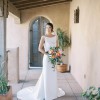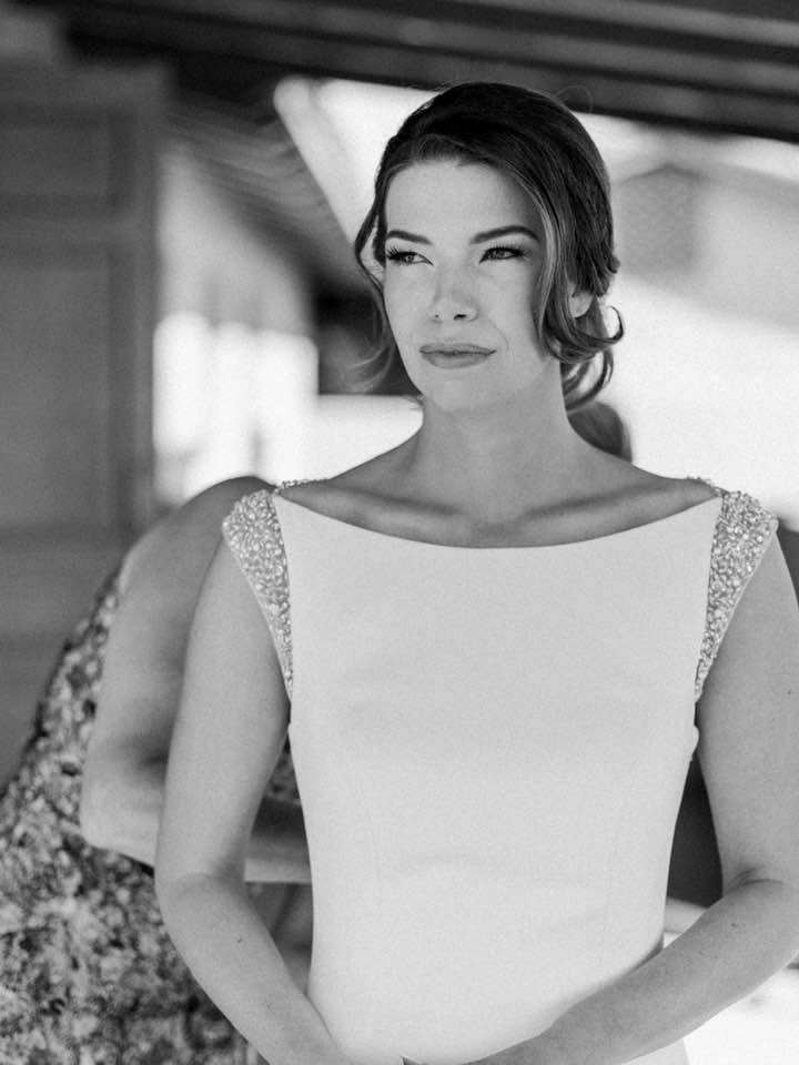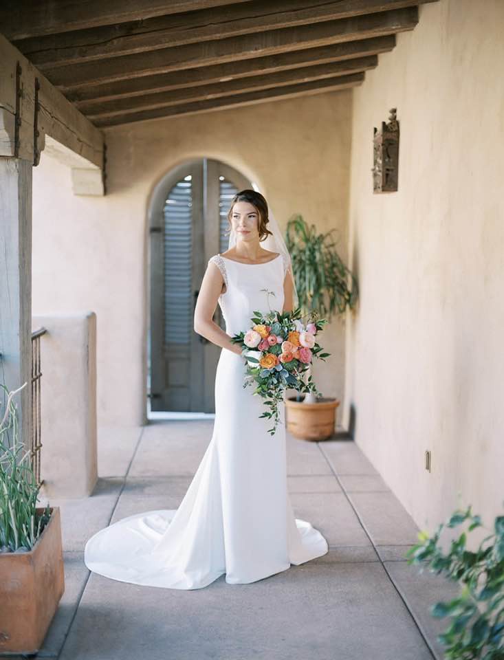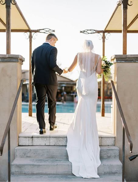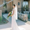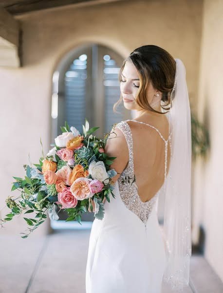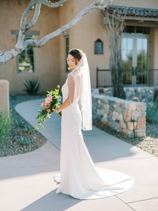 Will include veil that has beading and pearls that perfectly match the dress. Veil length comes just below the hips, hitting where the dress's open back comes together over the closure.