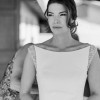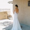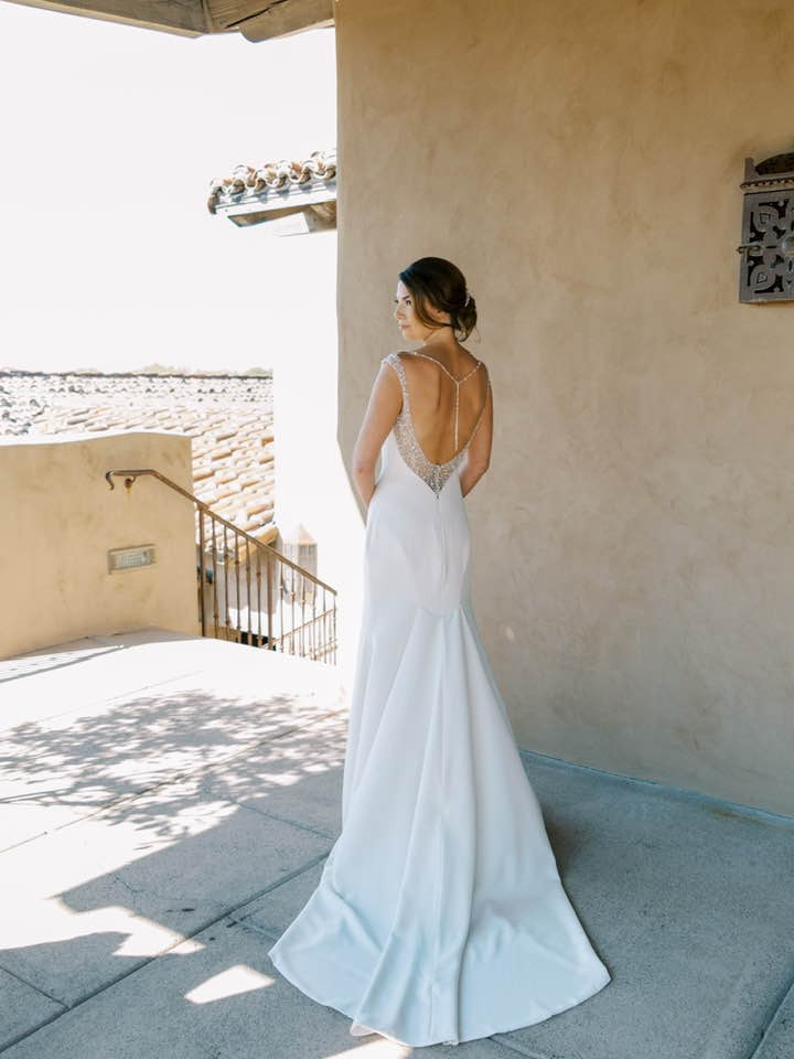 Dress is an absolutely stunning silhouette, perfectly accentuates the neckline in front and has a showstopping back. Aldora Satin sheath with illusion and Swarovski crystals accenting the shoulders, gliding into a shimmering ribbon of pearls and beading that ties in the plunging back, also trimmed in illusion and Swarovski crystals. Includes two long beaded tassels that tie in the back. Finished with crystal buttons over zipper closure.