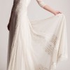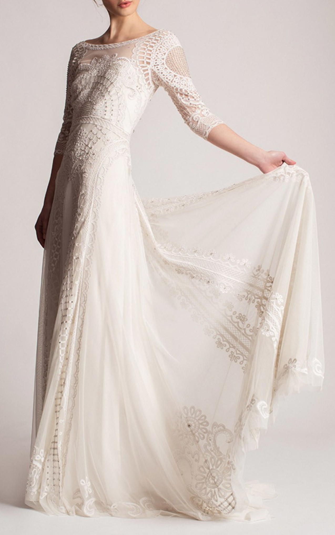A stunning soft tulle bridal gown, the Marcy is beautifully embroidered with a floral contouring linear design inspired by antique lace, and hand embellished with delicate glass crystals which allow the bride to softly shimmer as she moves. Complimented beautifully with fitted three quarter length sleeves, a graceful bateau neckline follows the curve of the collar bone then drops to a stunning deep v at the back of the dress. The skirt flows from the waist into a diaphanous train.
