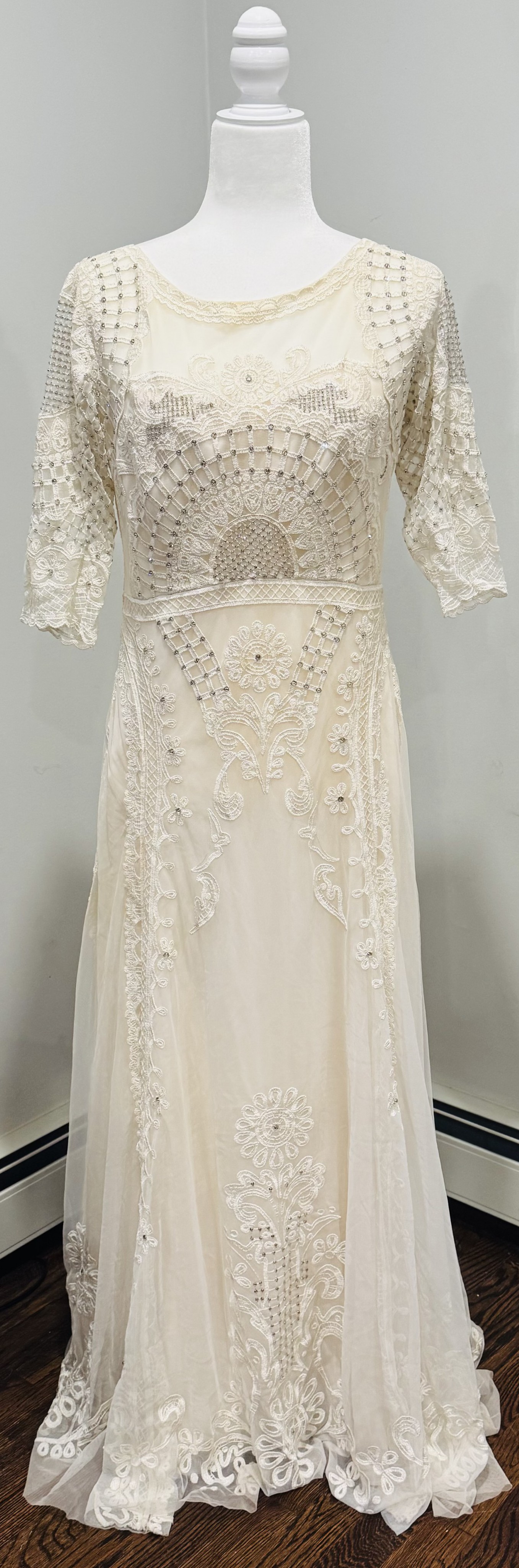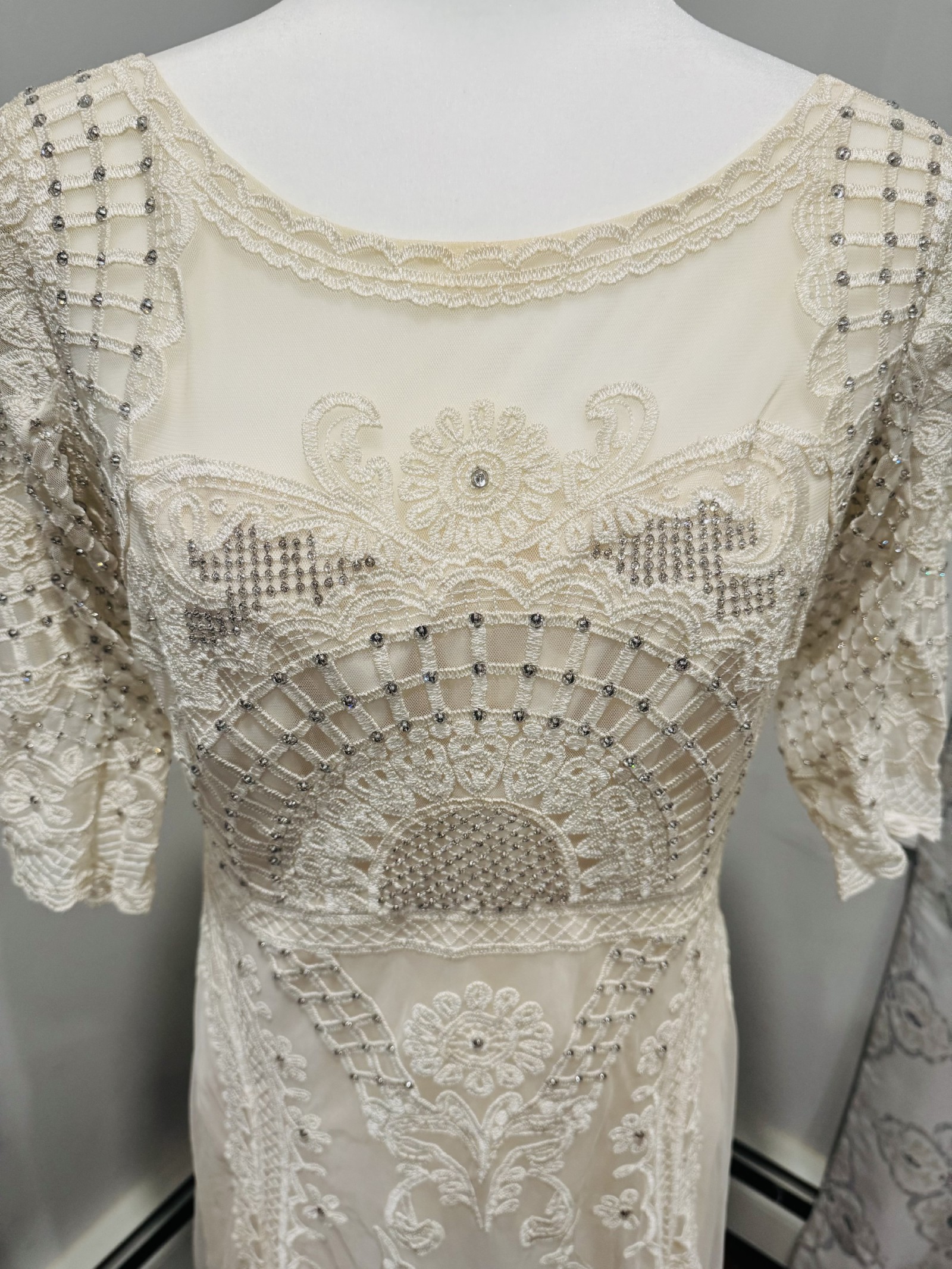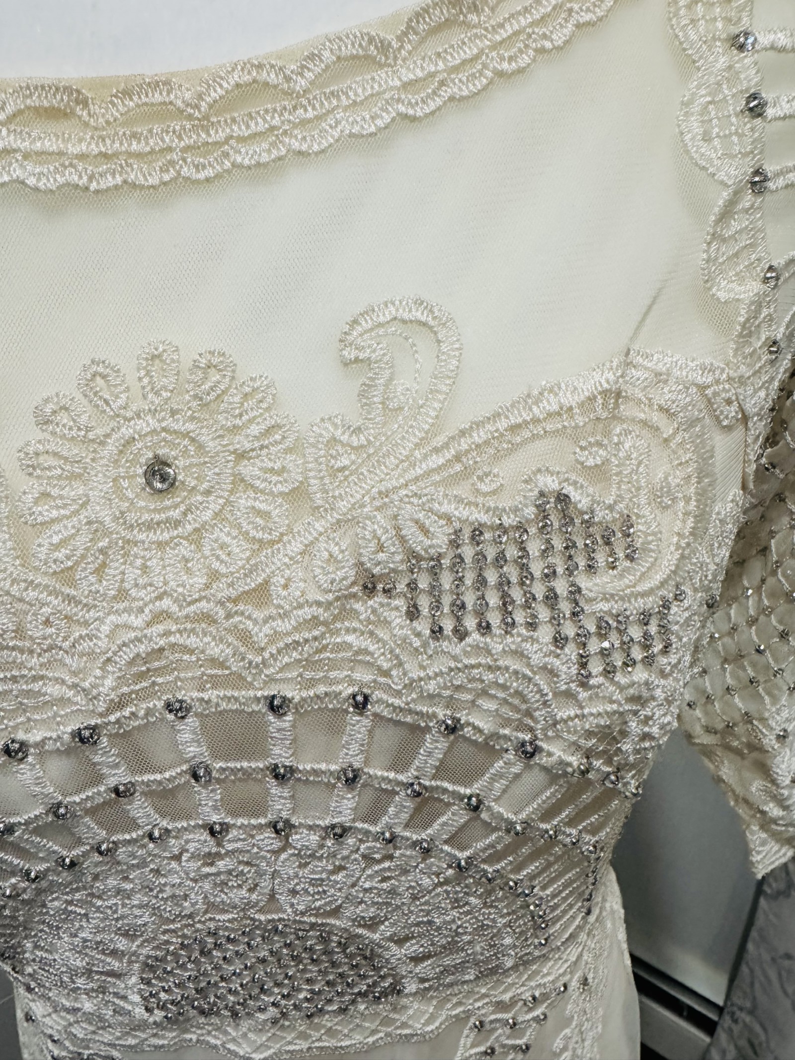 Embellished with intricate crystals and embroidery, this dress adds a subtle sparkle without overwhelming its timeless beauty. The A-line silhouette flatters every figure, giving you confidence and comfort as you celebrate the most significant moments of your life. The dress is stunning and sparkles in the sunlight.