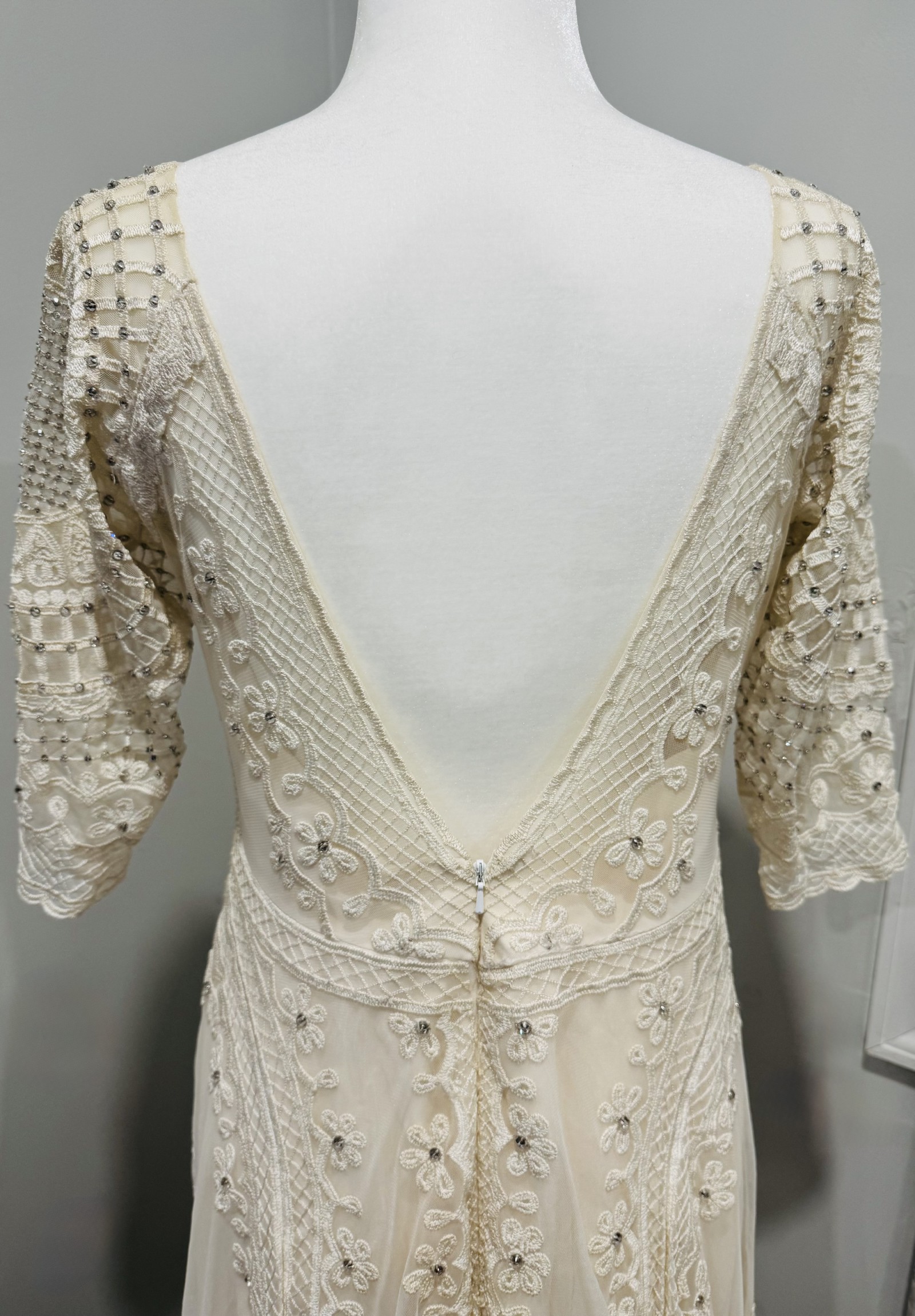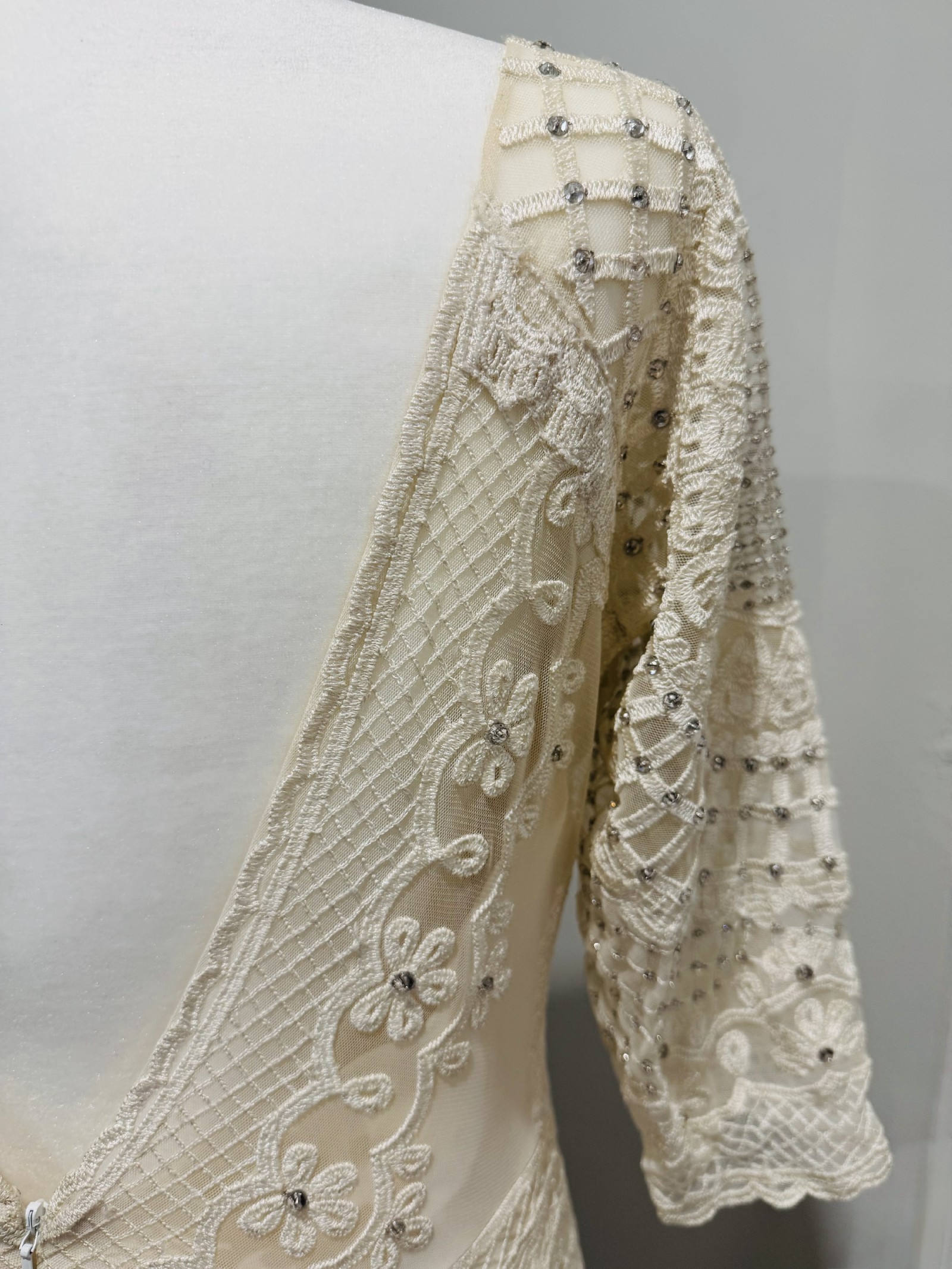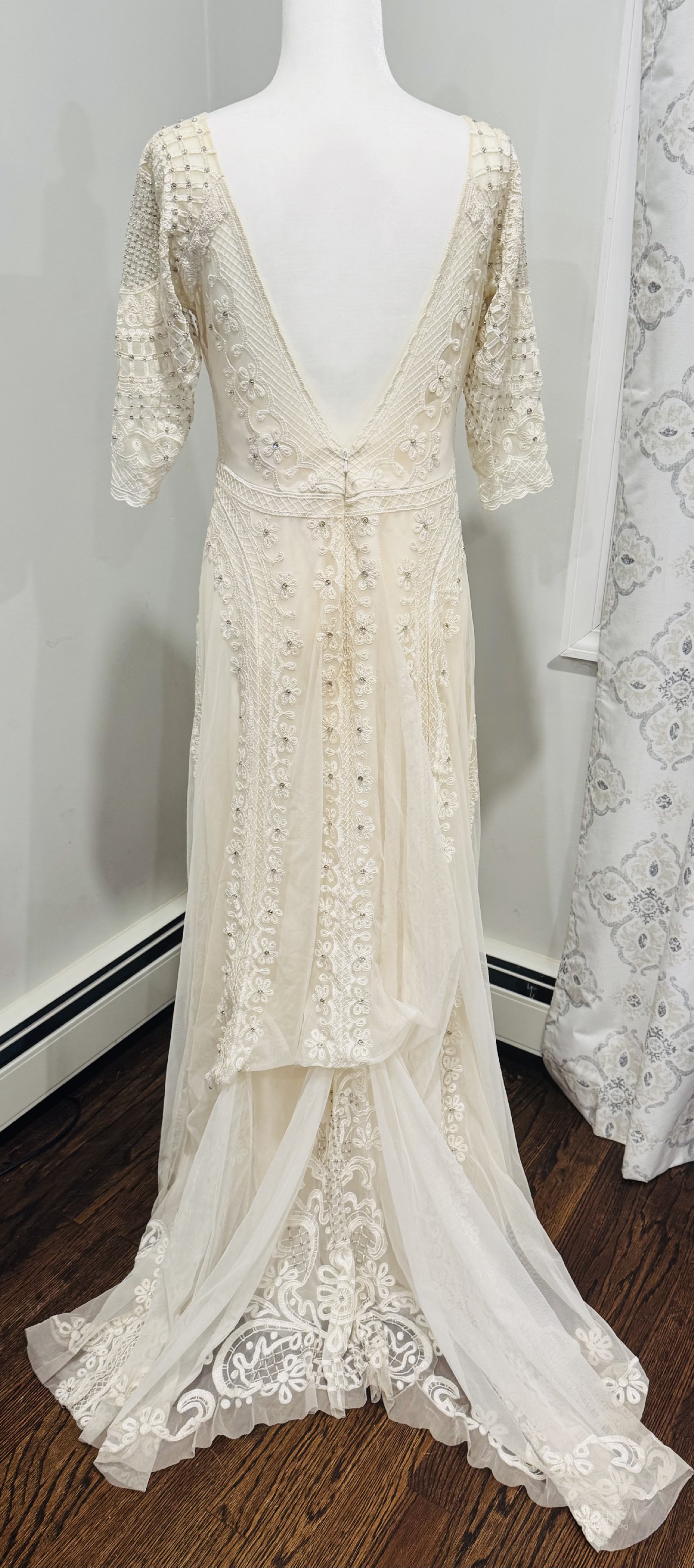 This Marcy gown by Temperley London stole my heart the moment I tried it on, and I hope it can bring the same magic to you on your big day. The exquisite ivory tulle fabric drapes beautifully, creating a romantic and ethereal silhouette that flows gracefully as you walk. The elegant boat neckline complements the stunning backless design, while the delicate 3/4 sleeves offer just the right balance of sophistication and charm. This dress is light, comfortable, easy to move in and easy to get on.