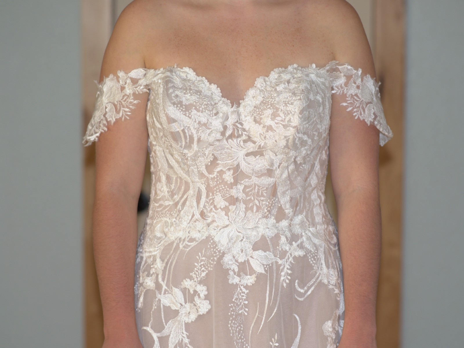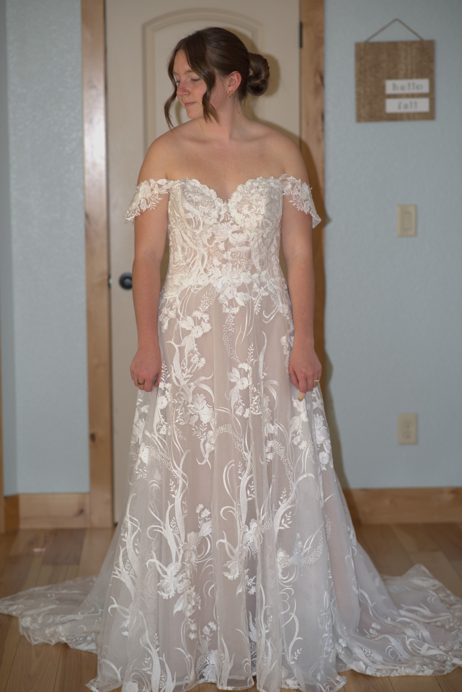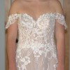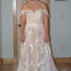 This Evelina dress by Maggie Sottero features luxurious ivory lace, an A-line silhouette, a lower back, and an off-the-shoulder neckline. The intricate embroidery offers exquisite detail and makes you feel as though you're walking through a garden.