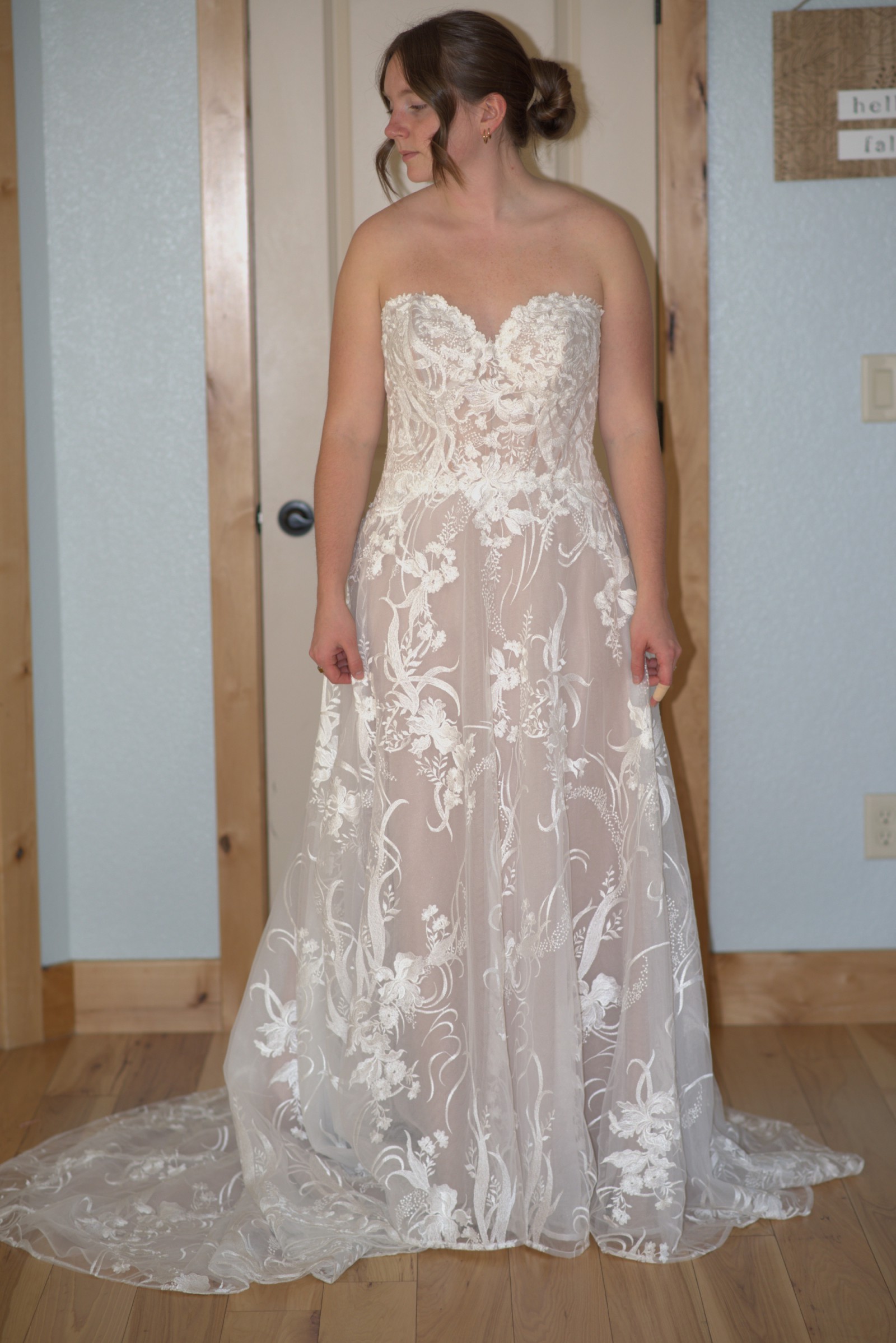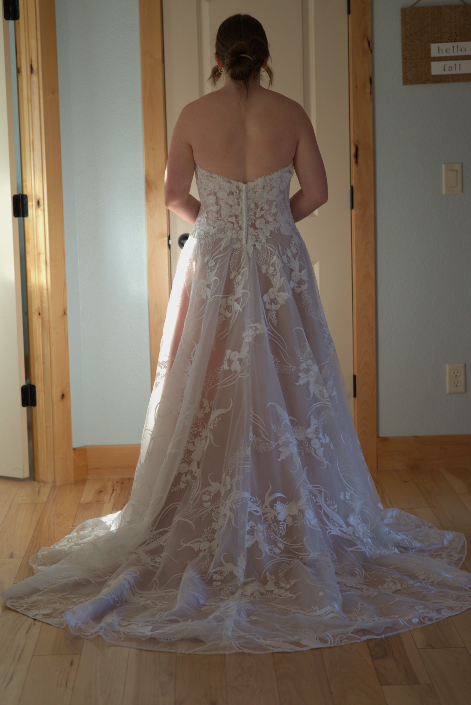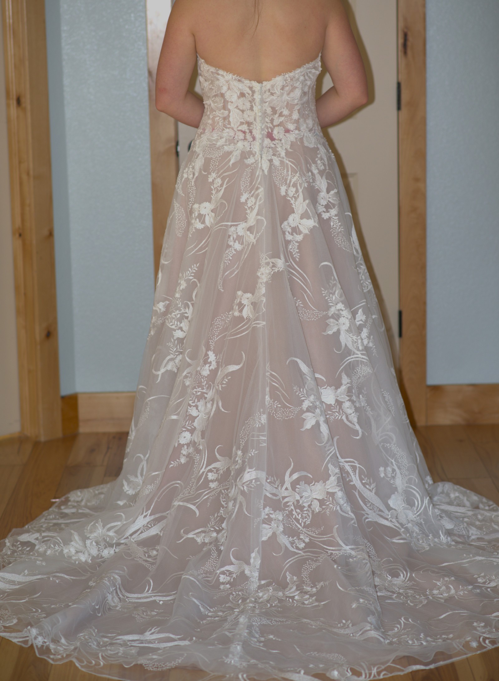 This gown has never been worn. I purchased it from a small, high-end bridal boutique with the intention of getting married in the spring. However, my wedding was changed to winter, so I ended up going with a warmer dress. * No visible signs of wear - NEW - EXCELLENT condition. * No rips, tears, spots, or stains.