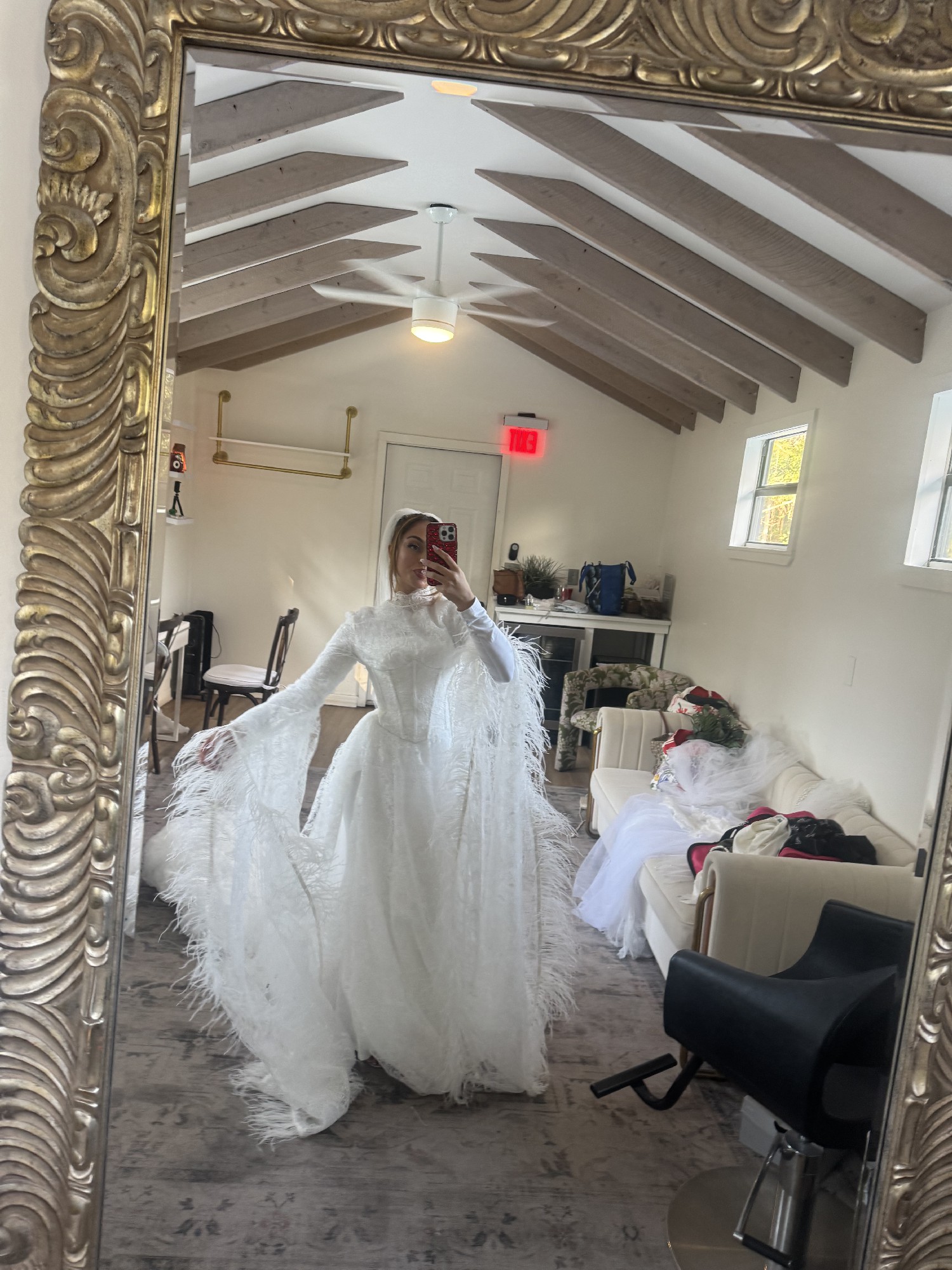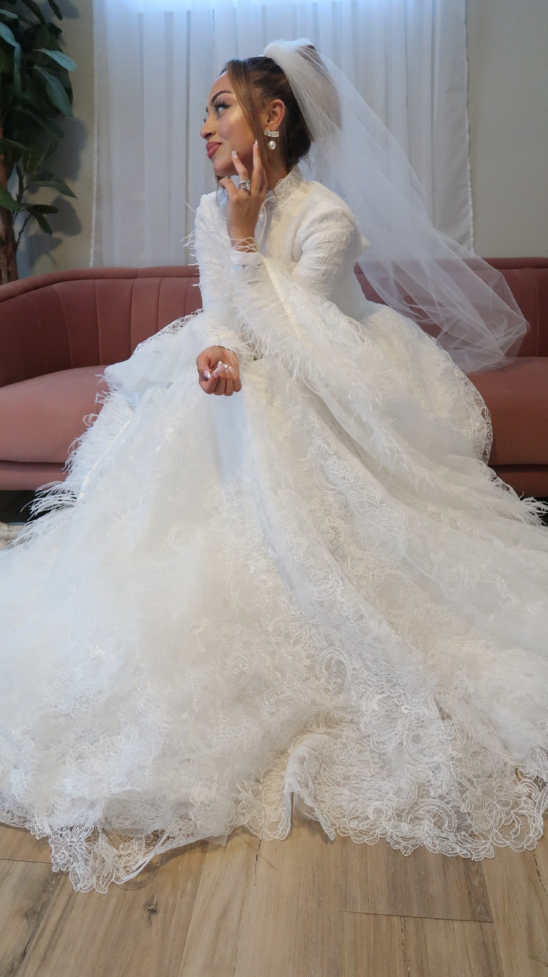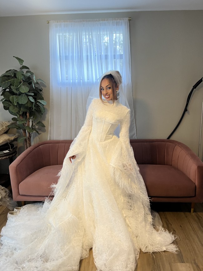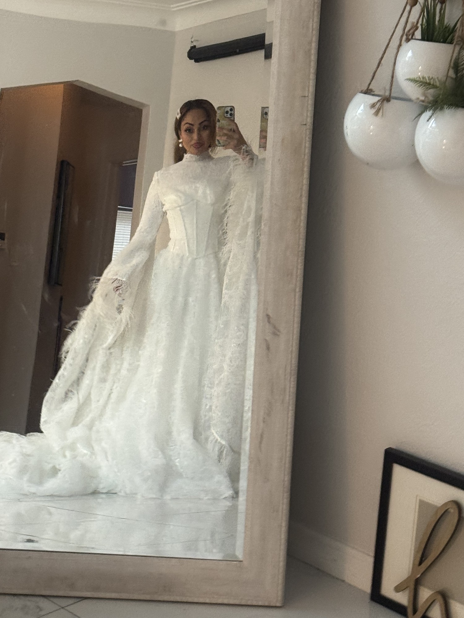 One-of-a-Kind Couture Lace & Feather Wedding Gown | High Neck | Open Back | Regal Train Step into elegance with this breathtaking couture-inspired wedding gown — a true showstopper that combines vintage romance with high-fashion artistry. This gown features an intricate orchid lace overlay adorned with feathered bell sleeves, a high neck, and a stunning open corset back. The structured corset bodice accentuates the waist while the long, dramatic train flows effortlessly for a royal finish. I styled it with a long-sleeve cream underdress for a modest, ethereal look — creating dimension and contrast against the sheer lace. The result was pure magic: timeless yet bold, elegant yet daring. Everywhere I went, people couldn’t stop complimenting how different and artful this dress was. Perfect for brides who love couture detail, editorial glamour, and modest elegance. ✨ Details: • Size: Small (adjustable corset back) • Lace fabric with feather sleeve accents • High neck + open back silhouette • Long dramatic train • Optional inner slip (can be worn modestly or sheer) • Condition: Excellent – worn once for photos 1. Bust: 36 in 2. Under Bust: 32 in 3. Waist: 26.5 in 4. Hips: 43 in 5. Shoulder to Nipple: 10 in 6. Shoulder to Waist: 17.5 in 7. Shoulder to Floor (with heels): 68 in 8. Sleeve Length: 26 in 9. Sleeve Length: 26 in 10. Arm Hole (full around): 15 in 11. Biceps: 12 in 12. Around Arm Where Sleeve Ends: 9.5 in 13. Wrist: 6 in 14. Hollow to Neckline: 6.5 in 15. Shoulder to Shoulder: 38 in (around) / 18 in (straight across) 16. Neck: 12 in