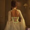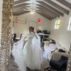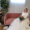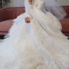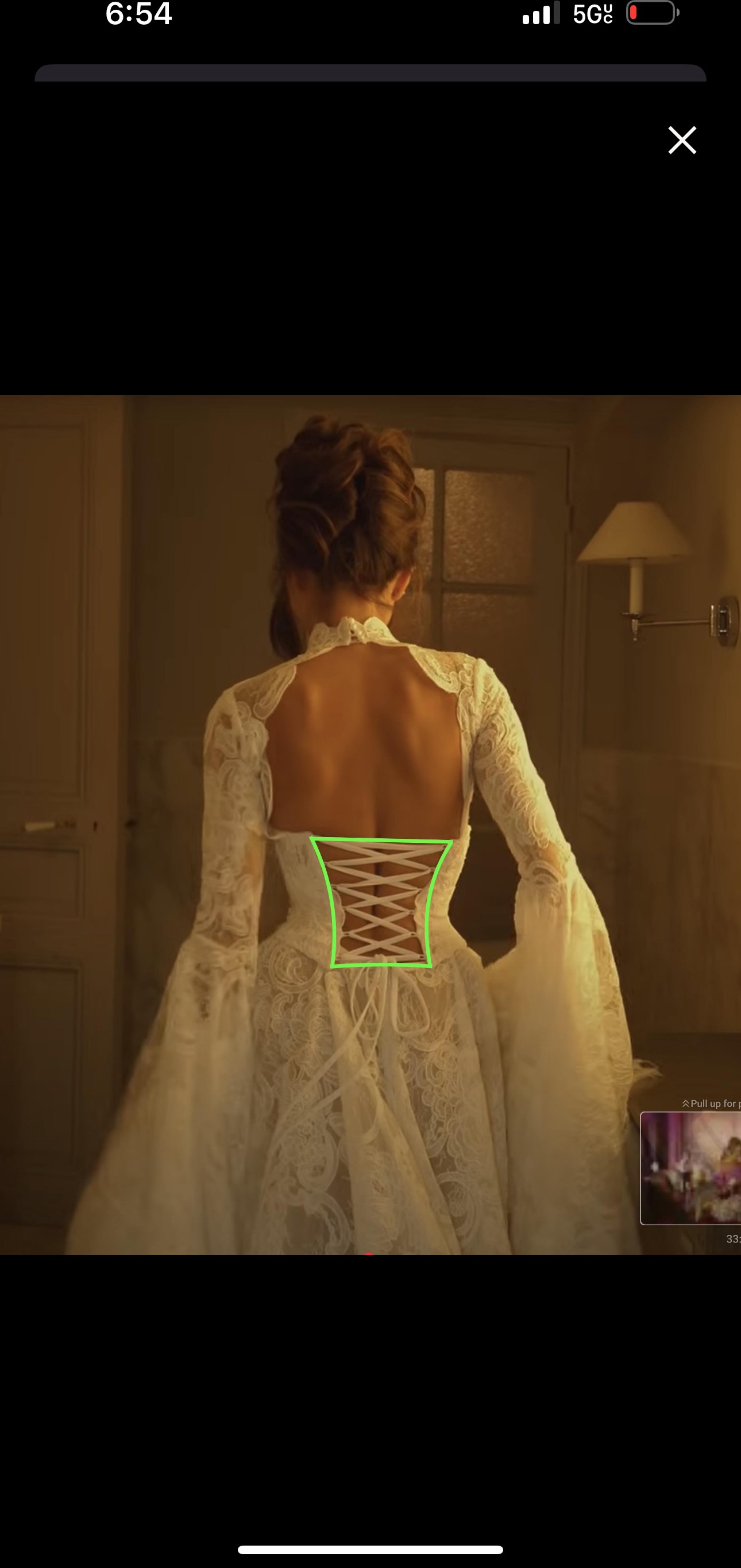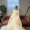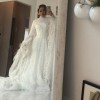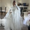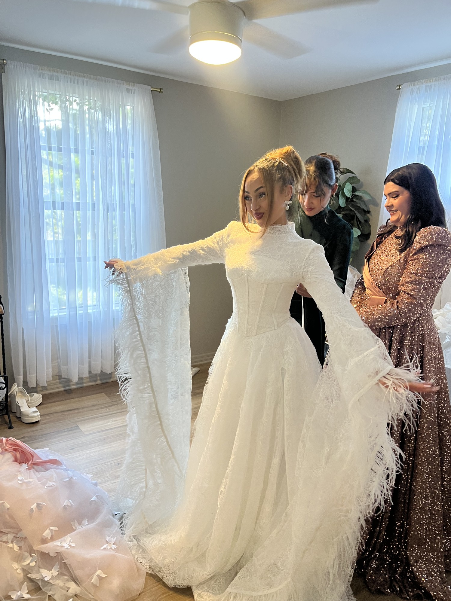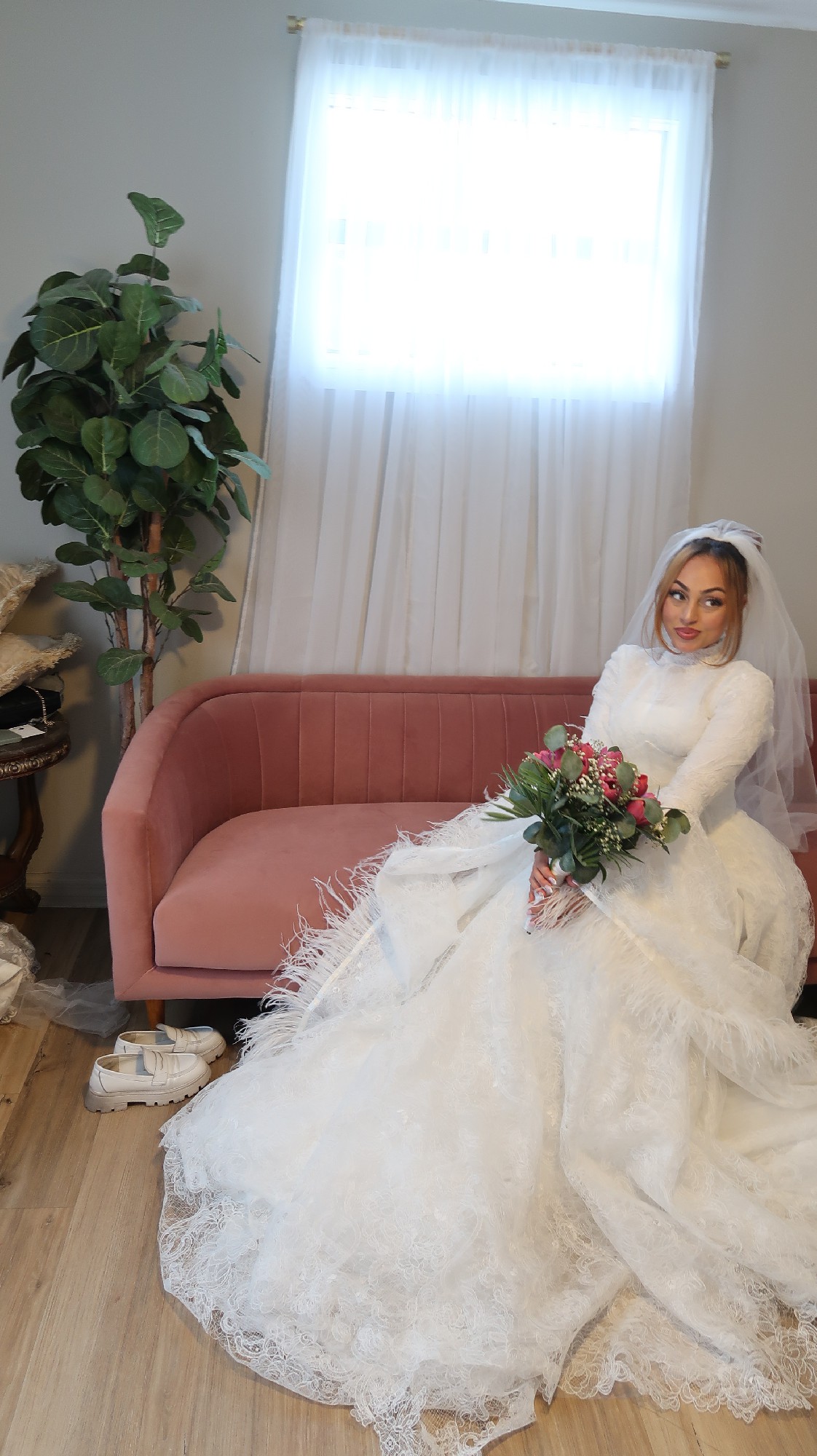 One-of-a-Kind Couture Lace & Feather Wedding Gown | High Neck | Open Back | Regal Train Step into elegance with this breathtaking couture-inspired wedding gown — a true showstopper that combines vintage romance with high-fashion artistry. This gown features an intricate orchid lace overlay adorned with feathered bell sleeves, a high neck, and a stunning open corset back. The structured corset bodice accentuates the waist while the long, dramatic train flows effortlessly for a royal finish. I styled it with a long-sleeve cream underdress for a modest, ethereal look — creating dimension and contrast against the sheer lace. The result was pure magic: timeless yet bold, elegant yet daring. Everywhere I went, people couldn’t stop complimenting how different and artful this dress was. Perfect for brides who love couture detail, editorial glamour, and modest elegance. ✨ Details: • Size: Small (adjustable corset back) • Lace fabric with feather sleeve accents • High neck + open back silhouette • Long dramatic train • Optional inner slip (can be worn modestly or sheer) • Condition: Excellent – worn once for photos 1. Bust: 36 in 2. Under Bust: 32 in 3. Waist: 26.5 in 4. Hips: 43 in 5. Shoulder to Nipple: 10 in 6. Shoulder to Waist: 17.5 in 7. Shoulder to Floor (with heels): 68 in 8. Sleeve Length: 26 in 9. Sleeve Length: 26 in 10. Arm Hole (full around): 15 in 11. Biceps: 12 in 12. Around Arm Where Sleeve Ends: 9.5 in 13. Wrist: 6 in 14. Hollow to Neckline: 6.5 in 15. Shoulder to Shoulder: 38 in (around) / 18 in (straight across) 16. Neck: 12 in
