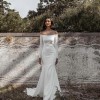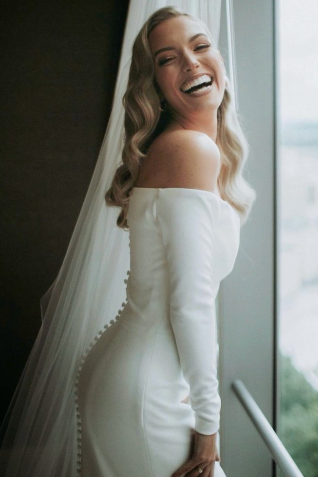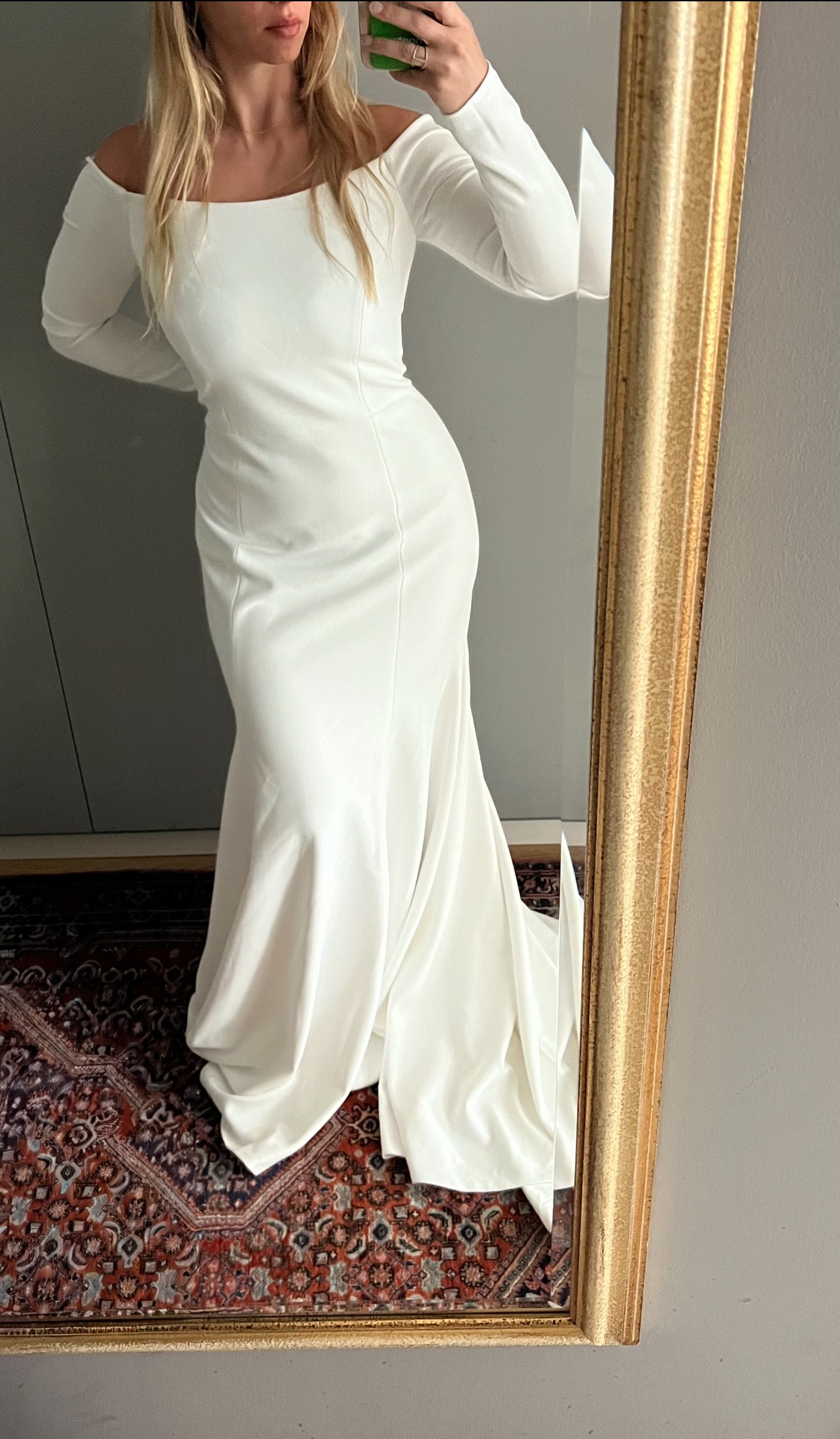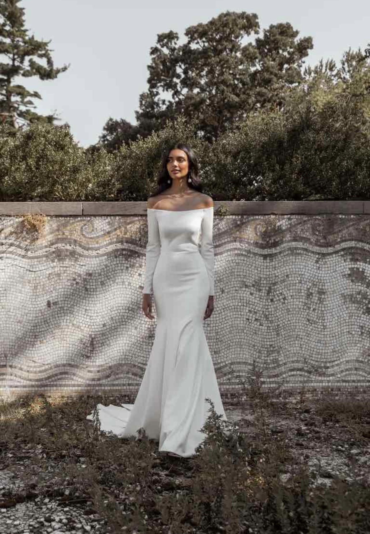 This stunning dress is perfect for autumn, winter, cooler spring weddings due to its crepe material.