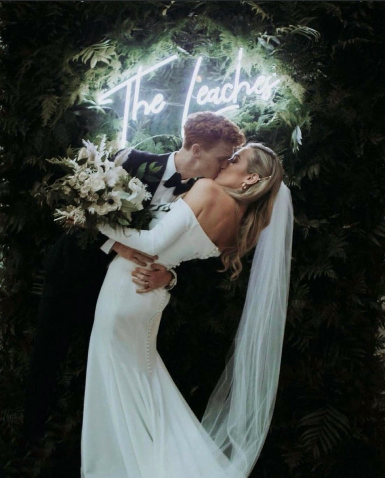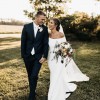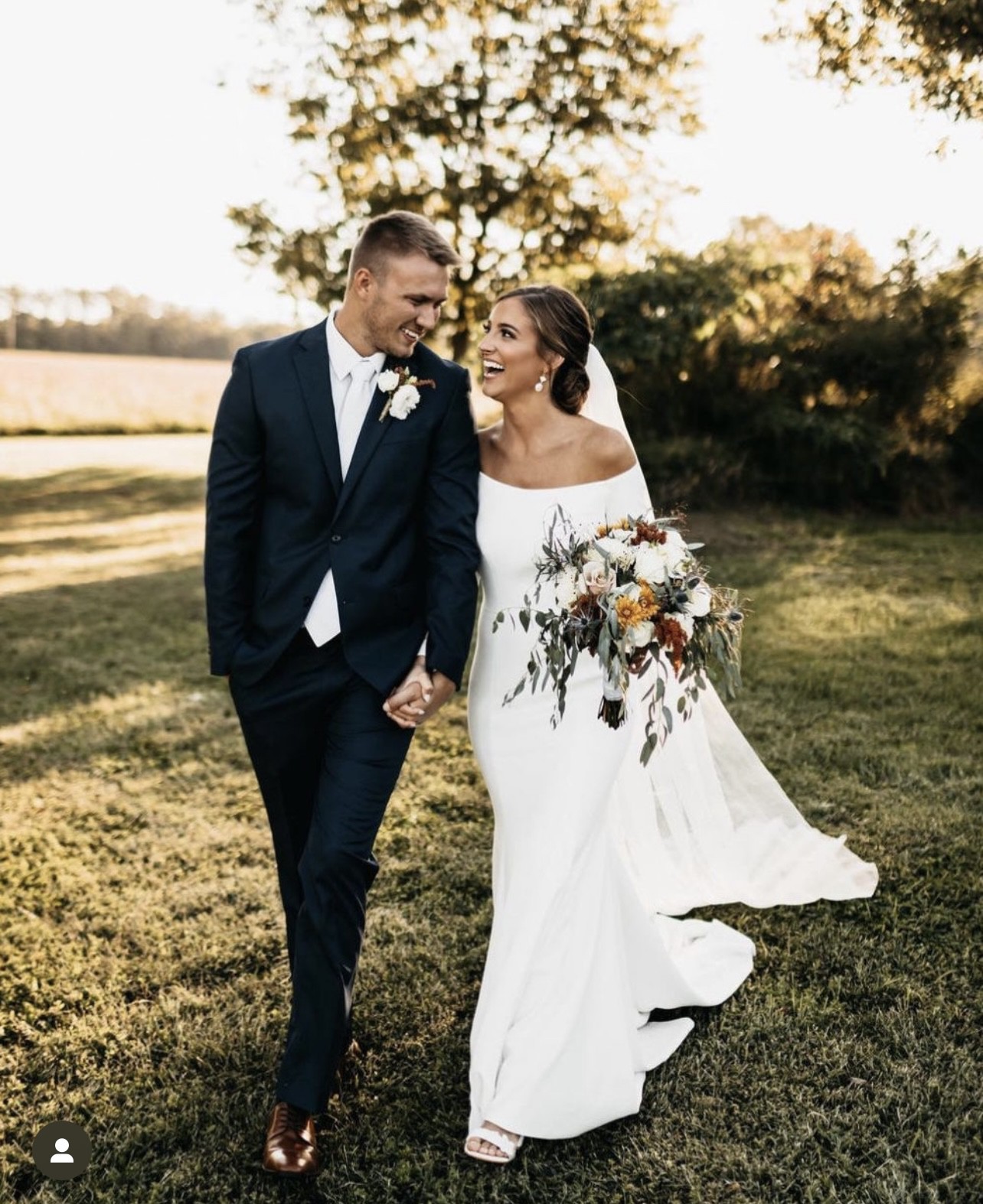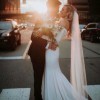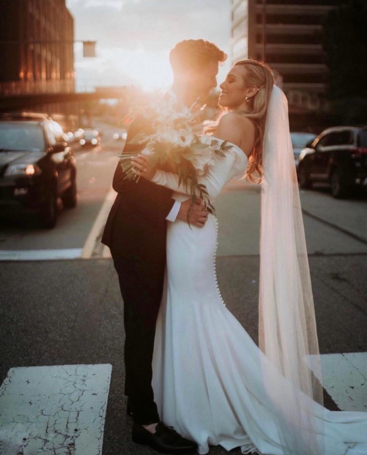 This stunning dress is perfect for autumn, winter, cooler spring weddings due to its crepe material.