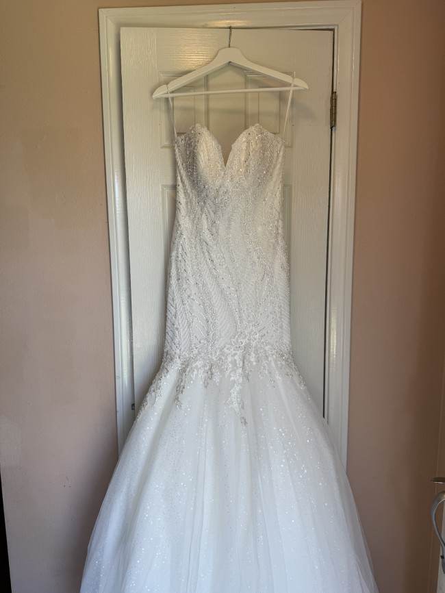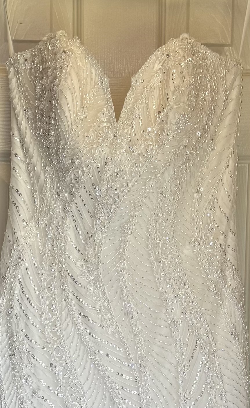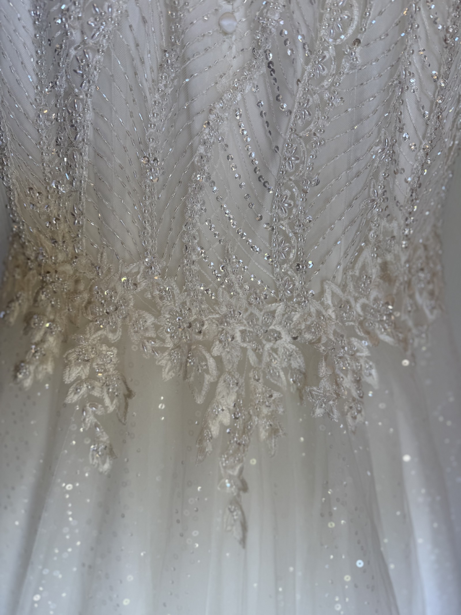 This Private Collection wedding dress is a breathtaking blend of elegance and charm. Designed for the modern bride, it features a captivating fit and flare silhouette that gracefully hugs your curves, creating an allure that is both sultry and sophisticated. The sweetheart neckline adds a romantic touch, enhancing the décolletage while framing the face beautifully, perfect for those unforgettable wedding day moments.