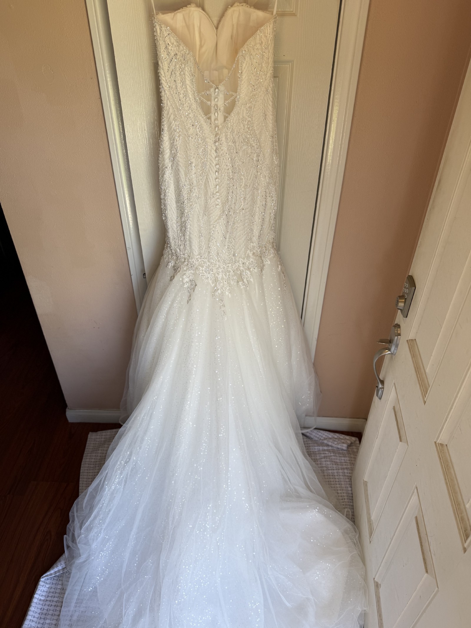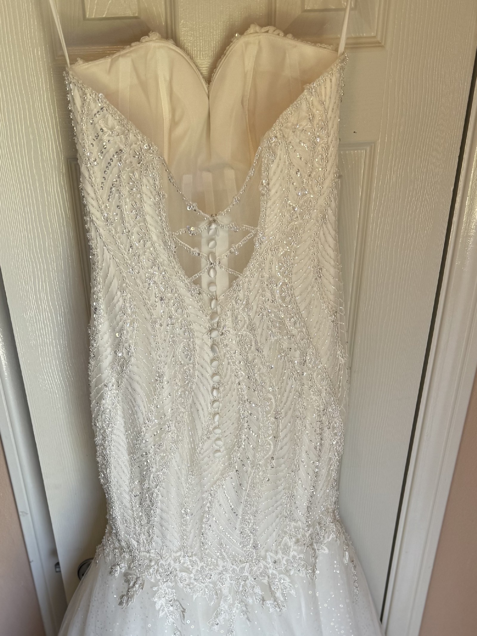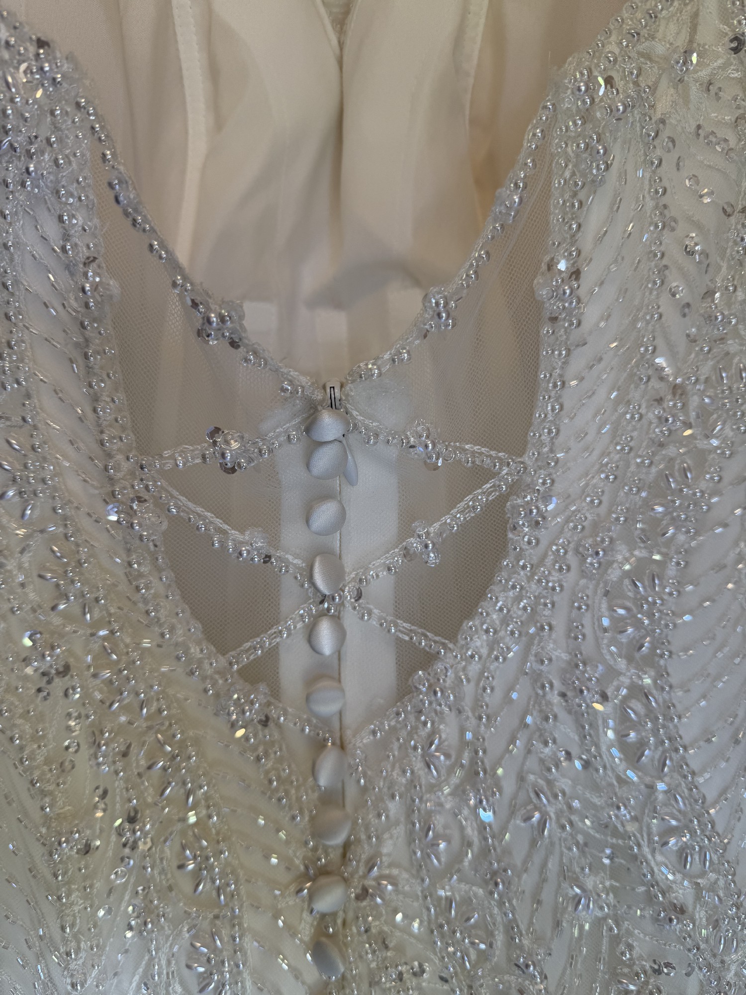This Private Collection wedding dress is a breathtaking blend of elegance and charm. Designed for the modern bride, it features a captivating fit and flare silhouette that gracefully hugs your curves, creating an allure that is both sultry and sophisticated. The sweetheart neckline adds a romantic touch, enhancing the décolletage while framing the face beautifully, perfect for those unforgettable wedding day moments.