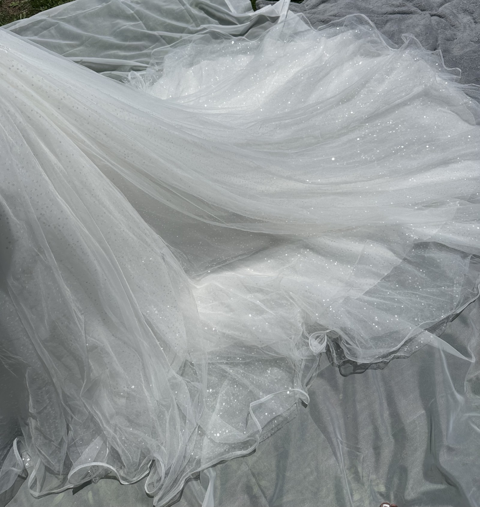 The dress boasts an exquisite corset back, allowing for a customized fit that flatters your figure. The floor-length skirt cascades with ethereal movement, making every step feel like a scene from a fairy tale. Adorned with intricate 3D flowers, delicate embroidery, and sparkling beading, this ivory masterpiece glimmers with pearls and sequins, ensuring you shine like a star on your special day.