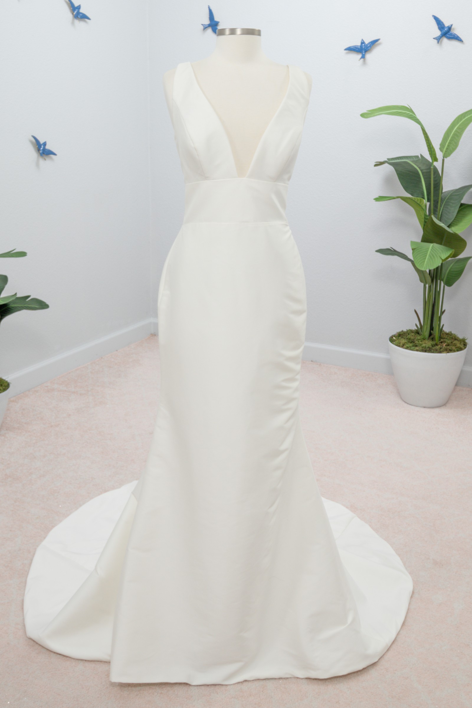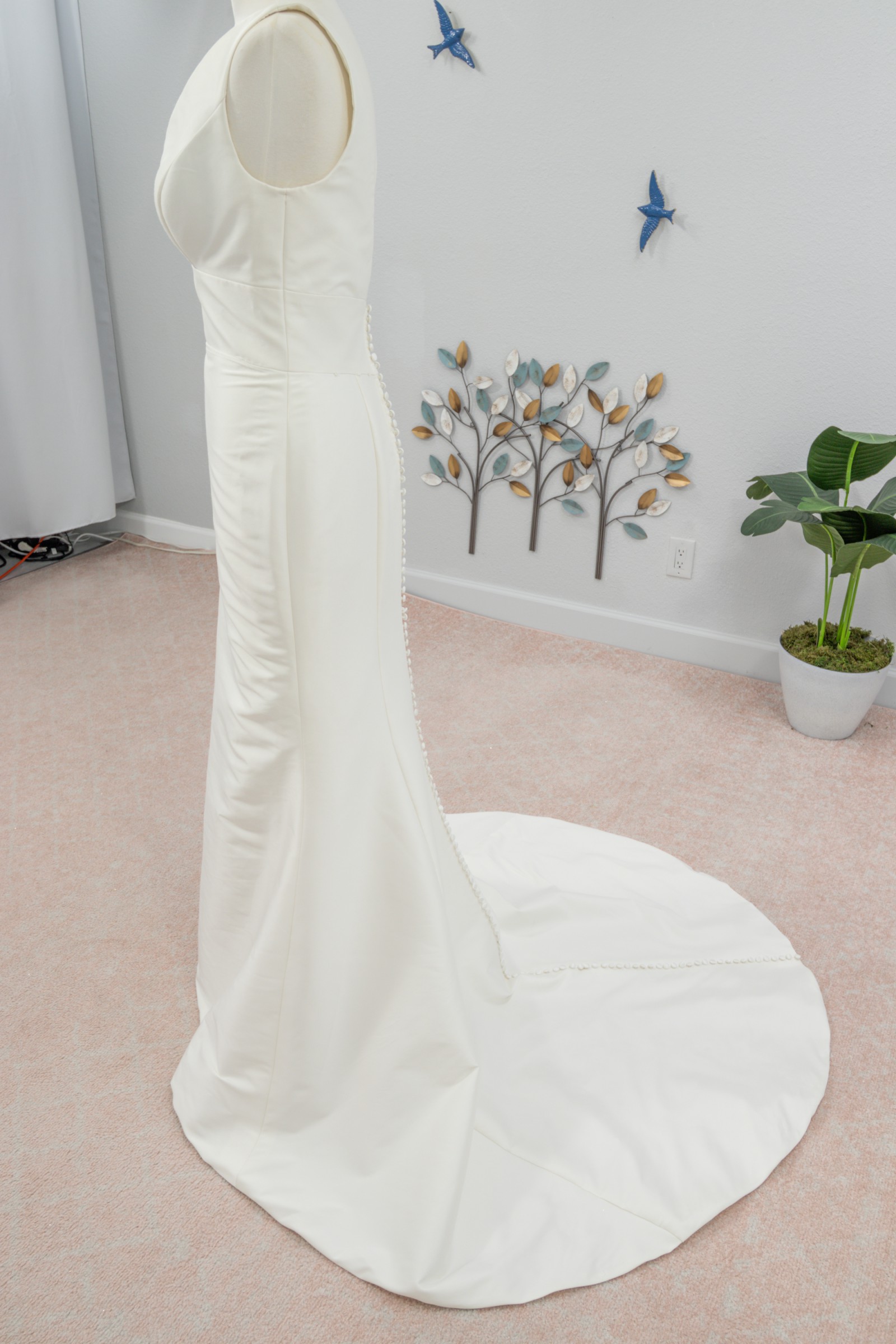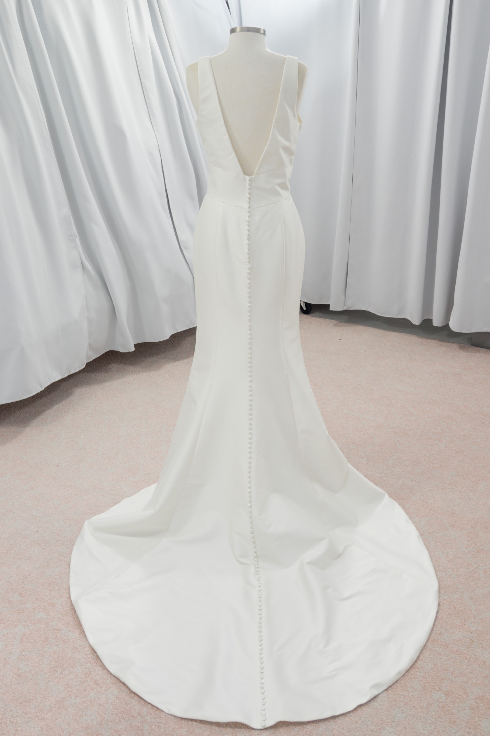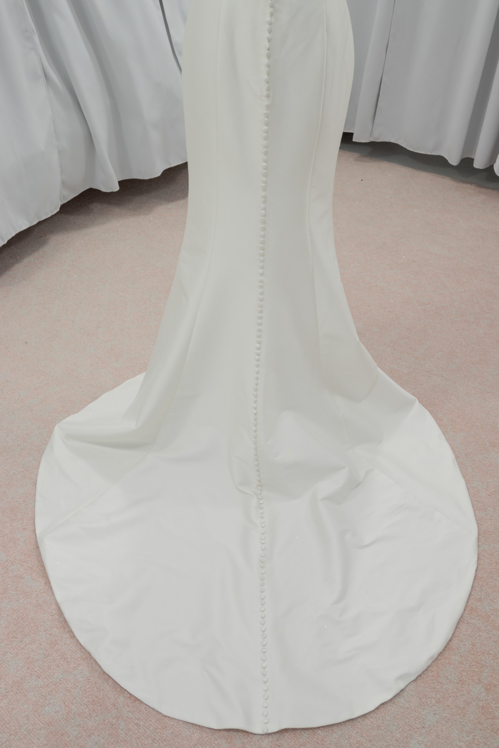 - Description: Show off your shape in this sleek fit and flare Mikado gown. It will have you feeling confident and sexy with the plunging neckline in the front and back with matching buttons from the neckline to the hem. Paired with a full detachable chapel length train that completes the look. A raised neckline version is also available with this style.