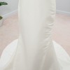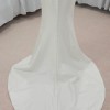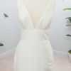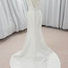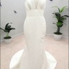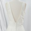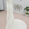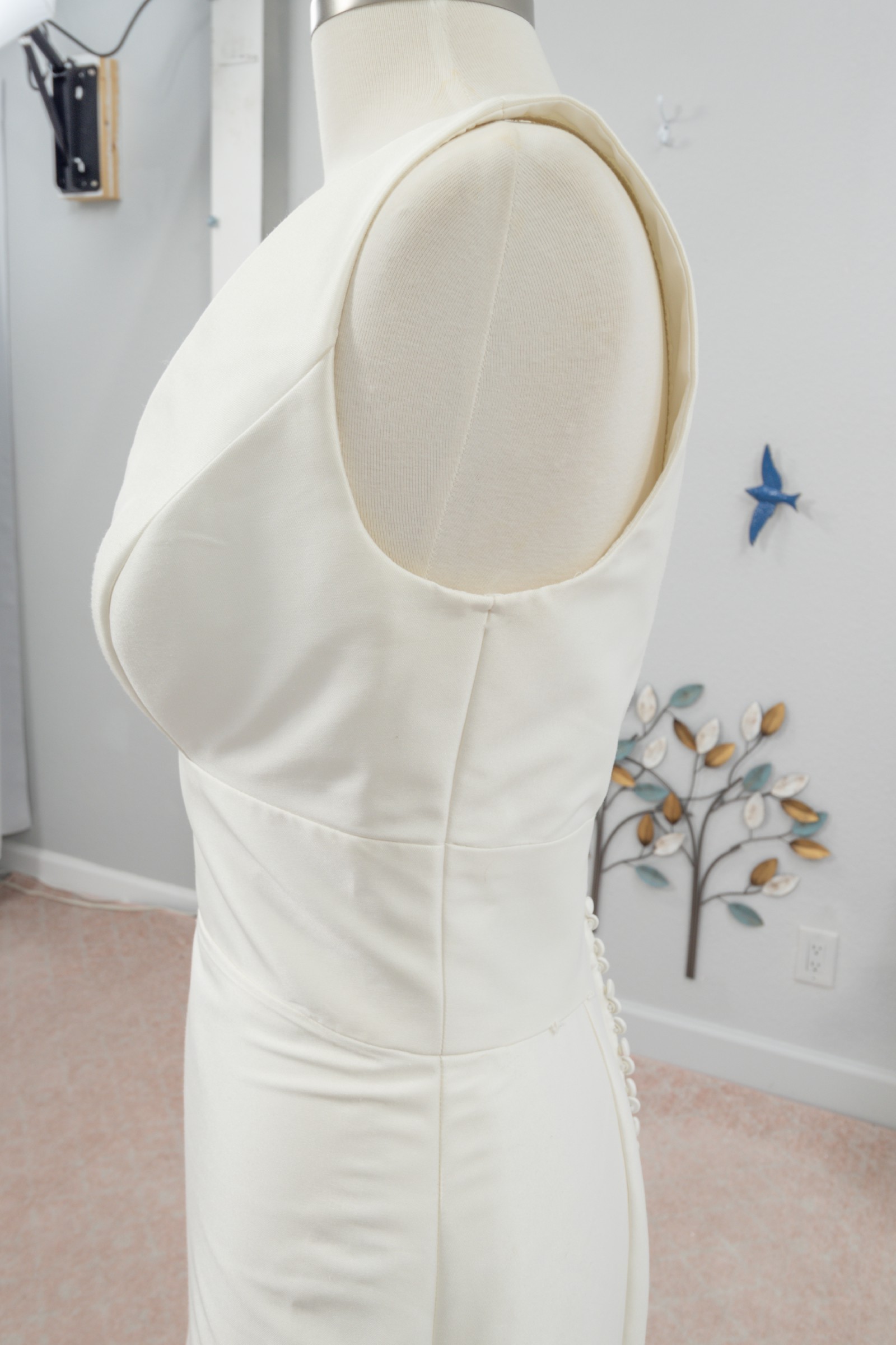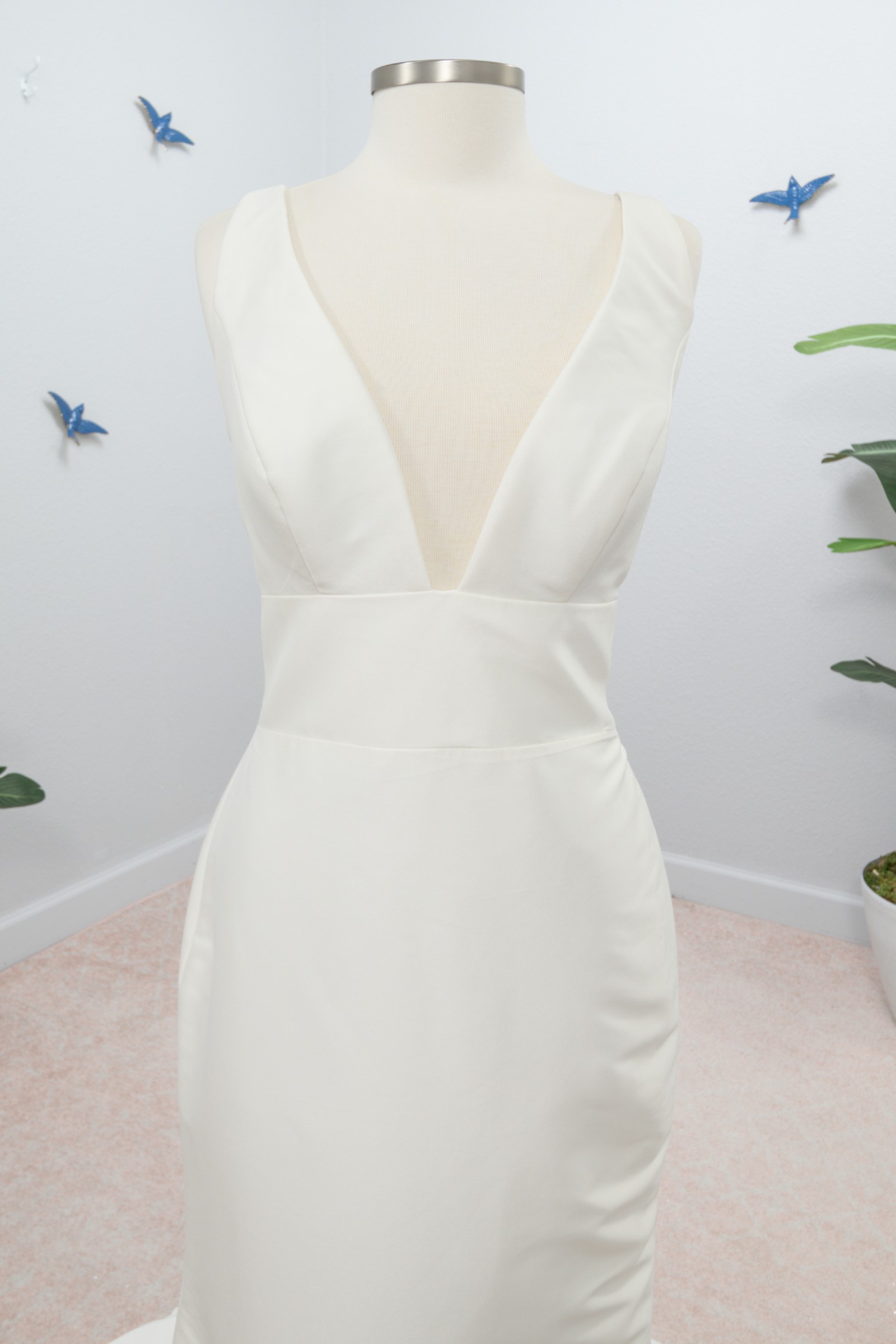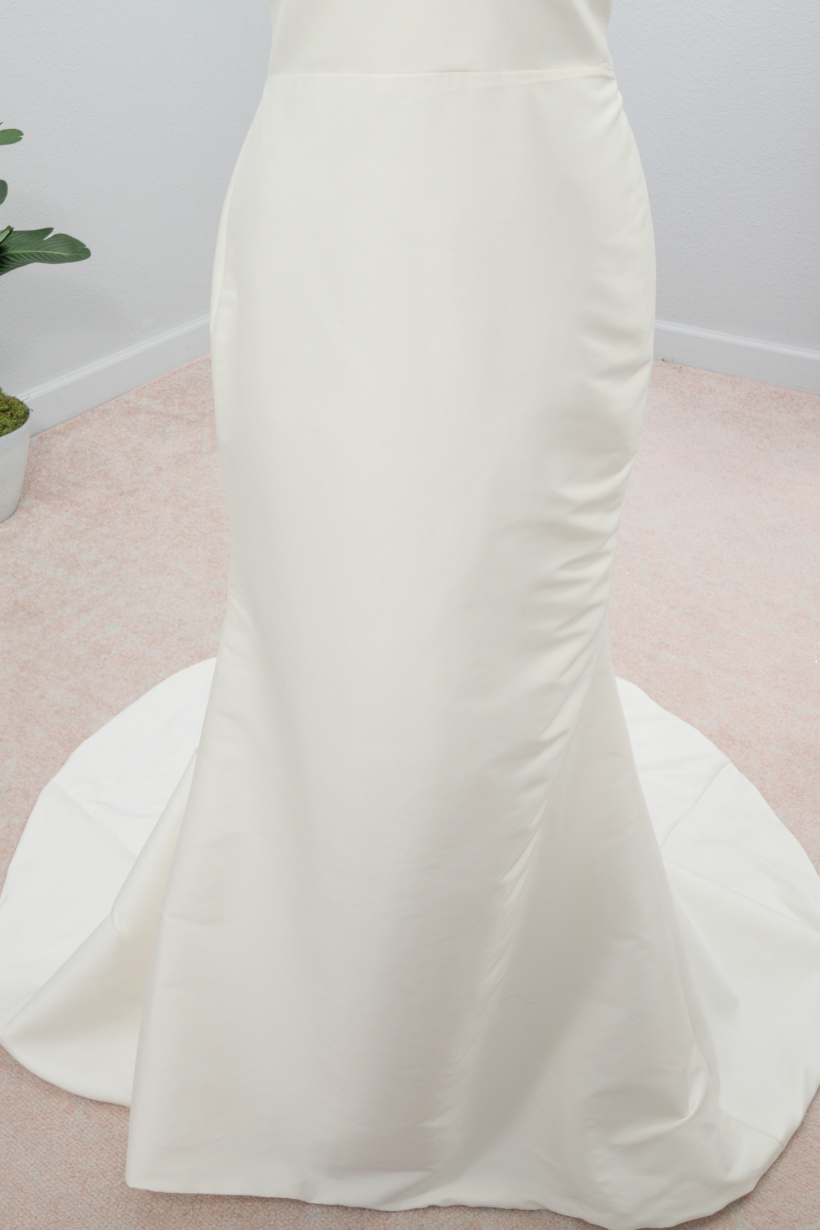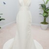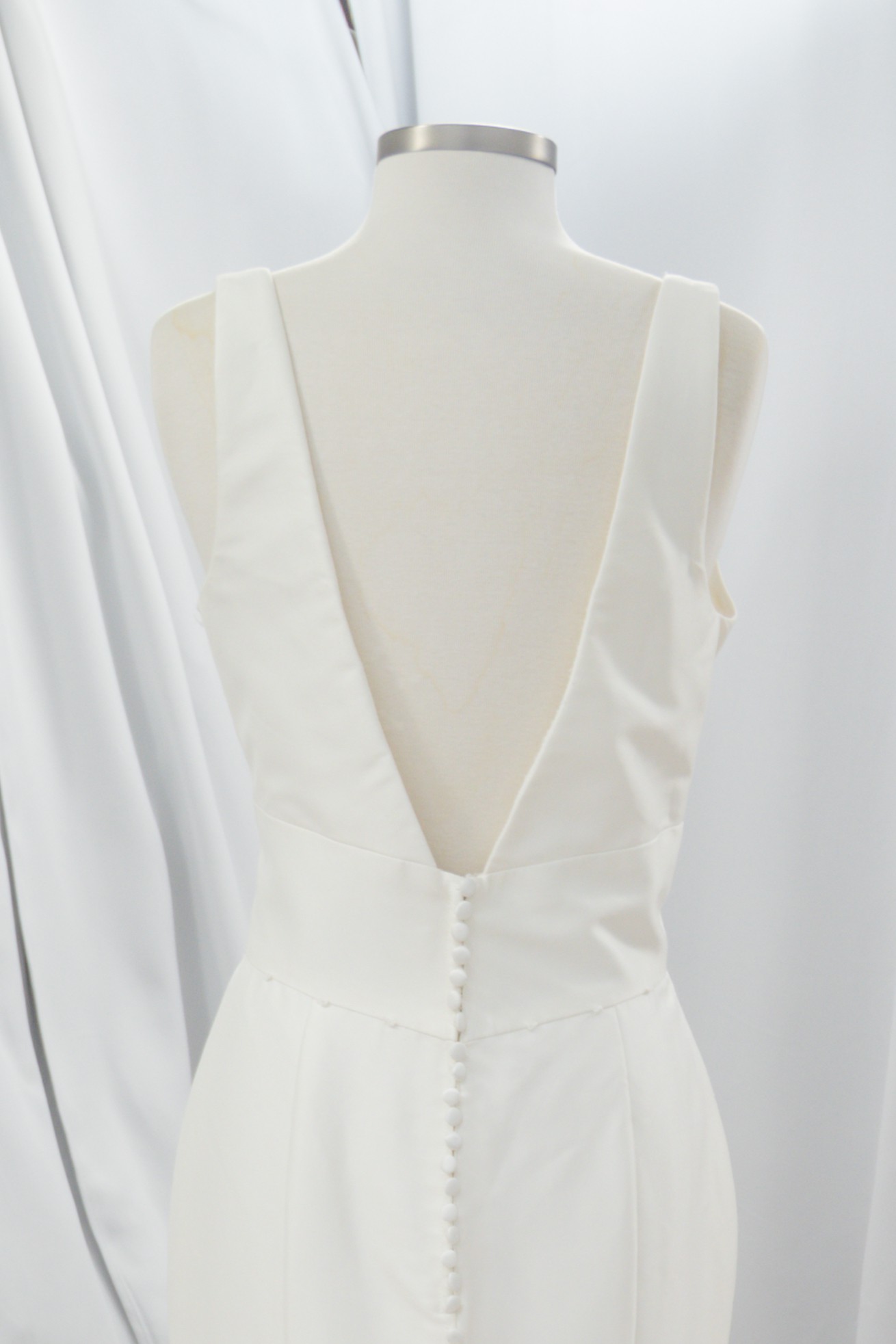 - Description: Show off your shape in this sleek fit and flare Mikado gown. It will have you feeling confident and sexy with the plunging neckline in the front and back with matching buttons from the neckline to the hem. Paired with a full detachable chapel length train that completes the look. A raised neckline version is also available with this style.