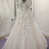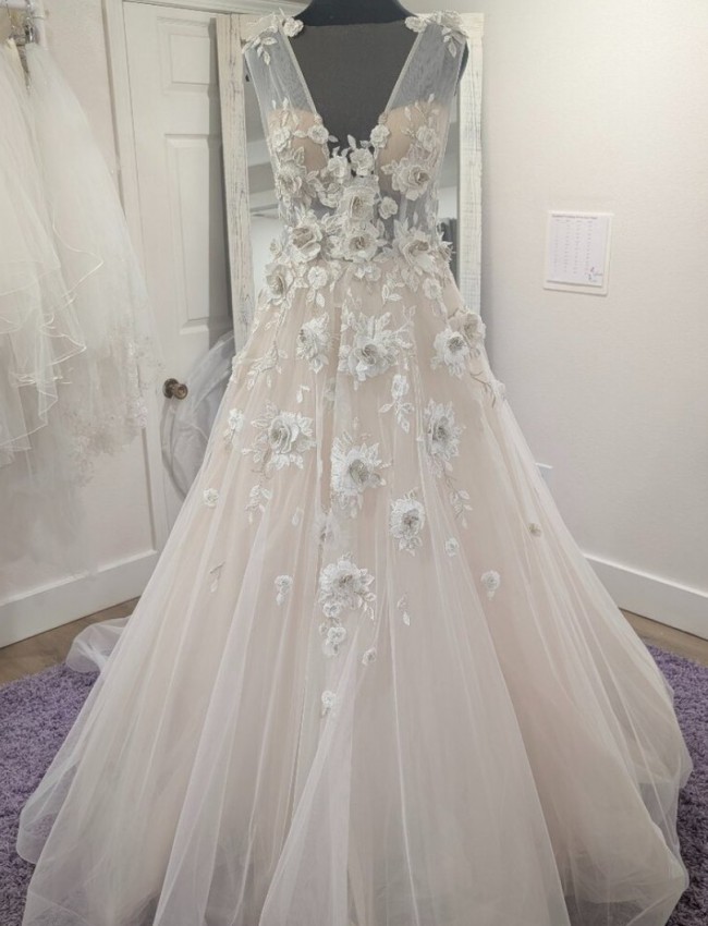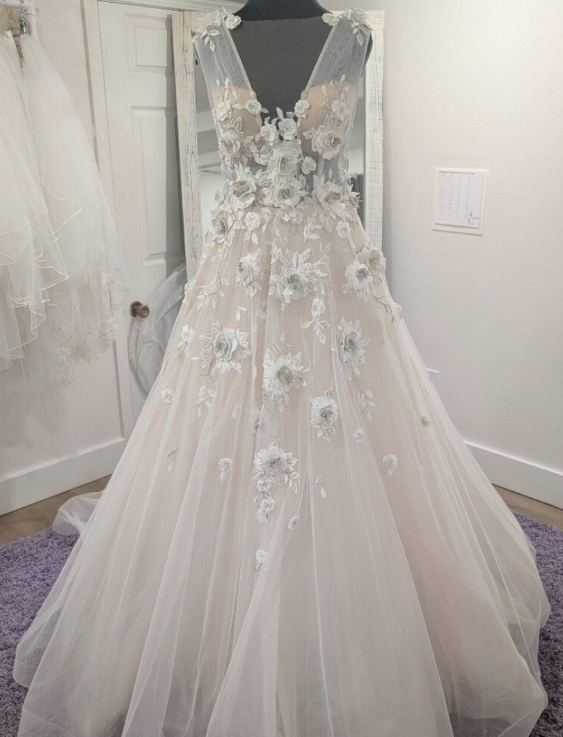 "This exquisite gown features beautiful 3D roses in champagne and ivory hues, complete with silver accents that add a touch of sophistication. Perfect for the modern bride, the A-line silhouette ensures a flattering fit for any body type, combining timeless beauty with contemporary flair. Experience the grace and charm of this stunning masterpiece and let your special day be truly unforgettable."