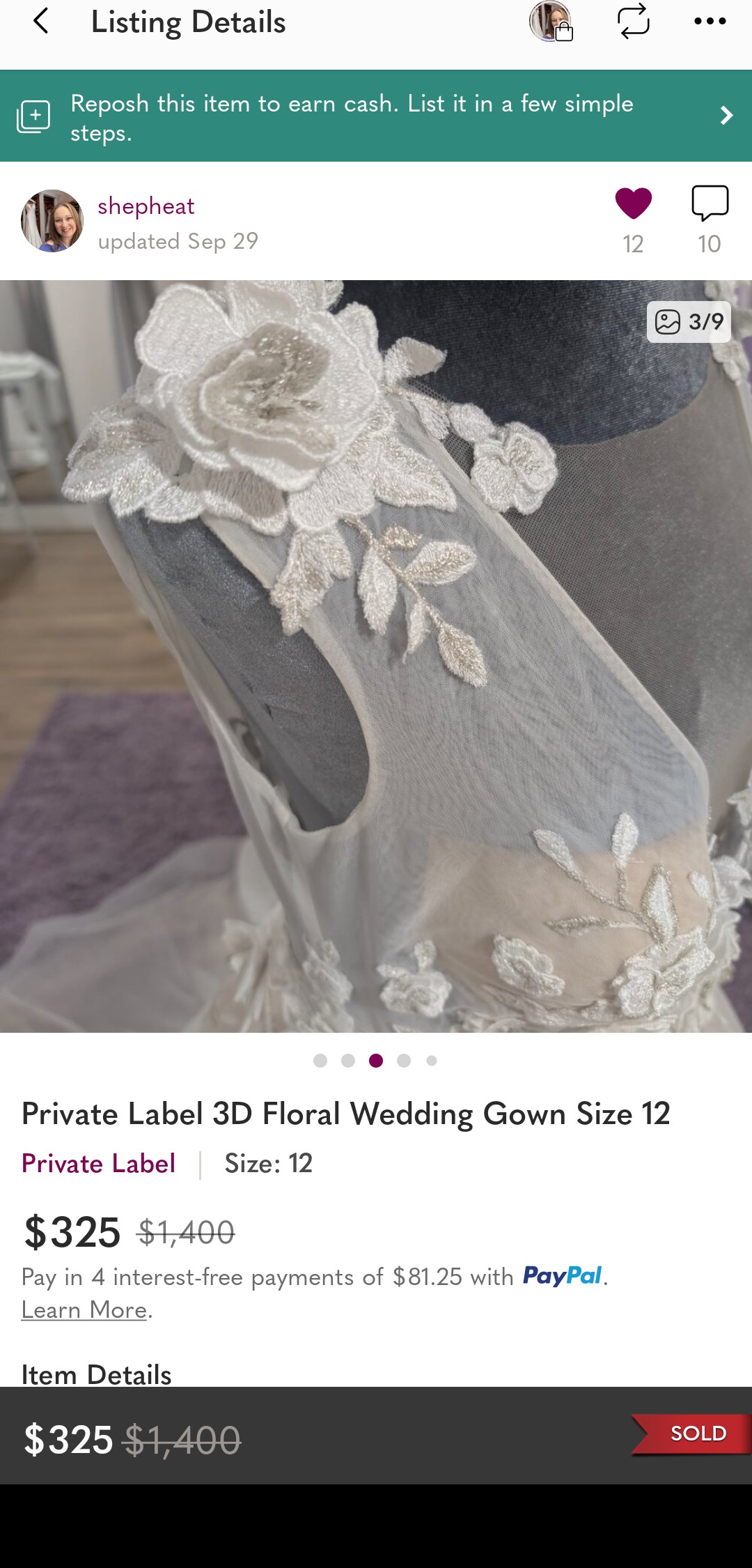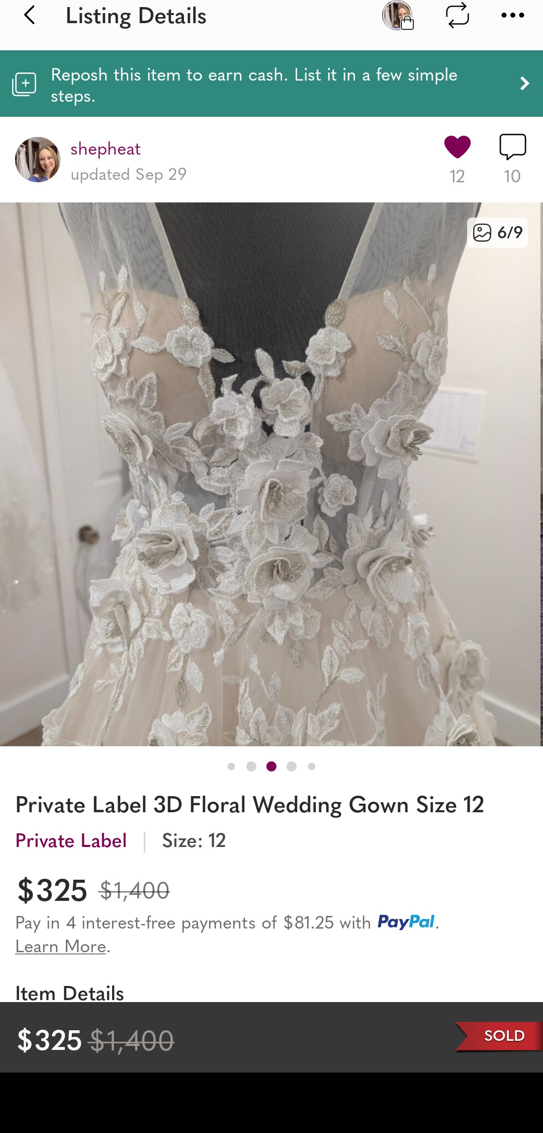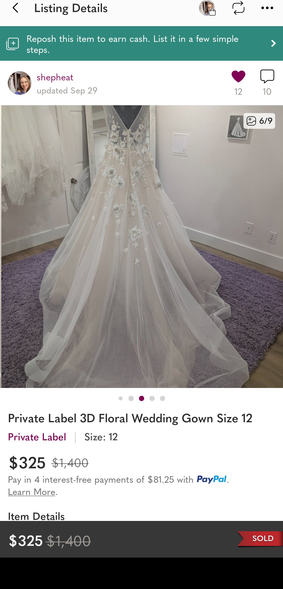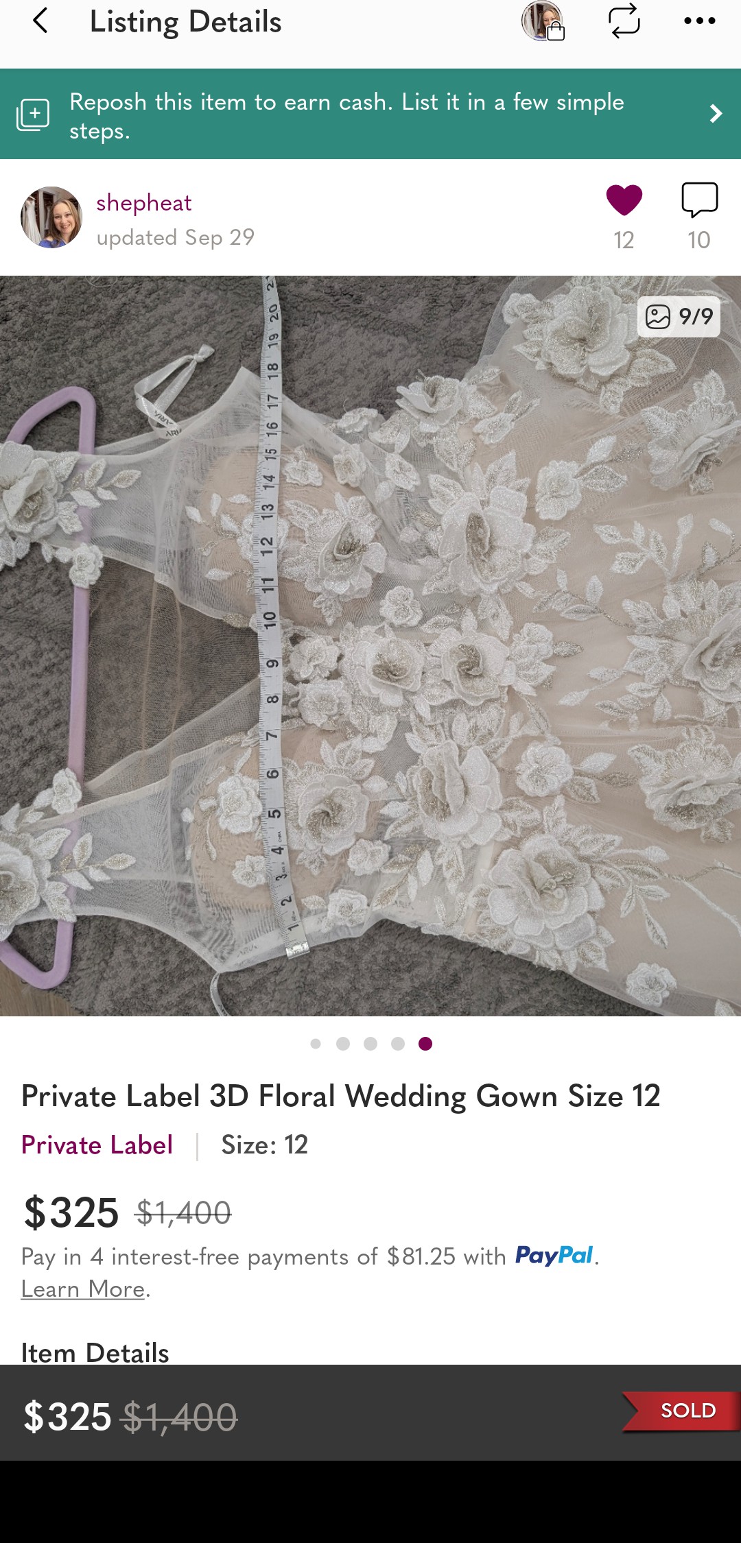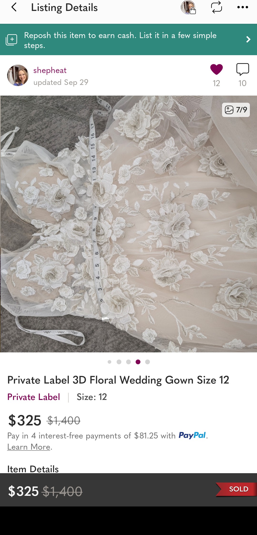 From listing on Poshmark – acquired from wedding dress shop in ID – sample gown: