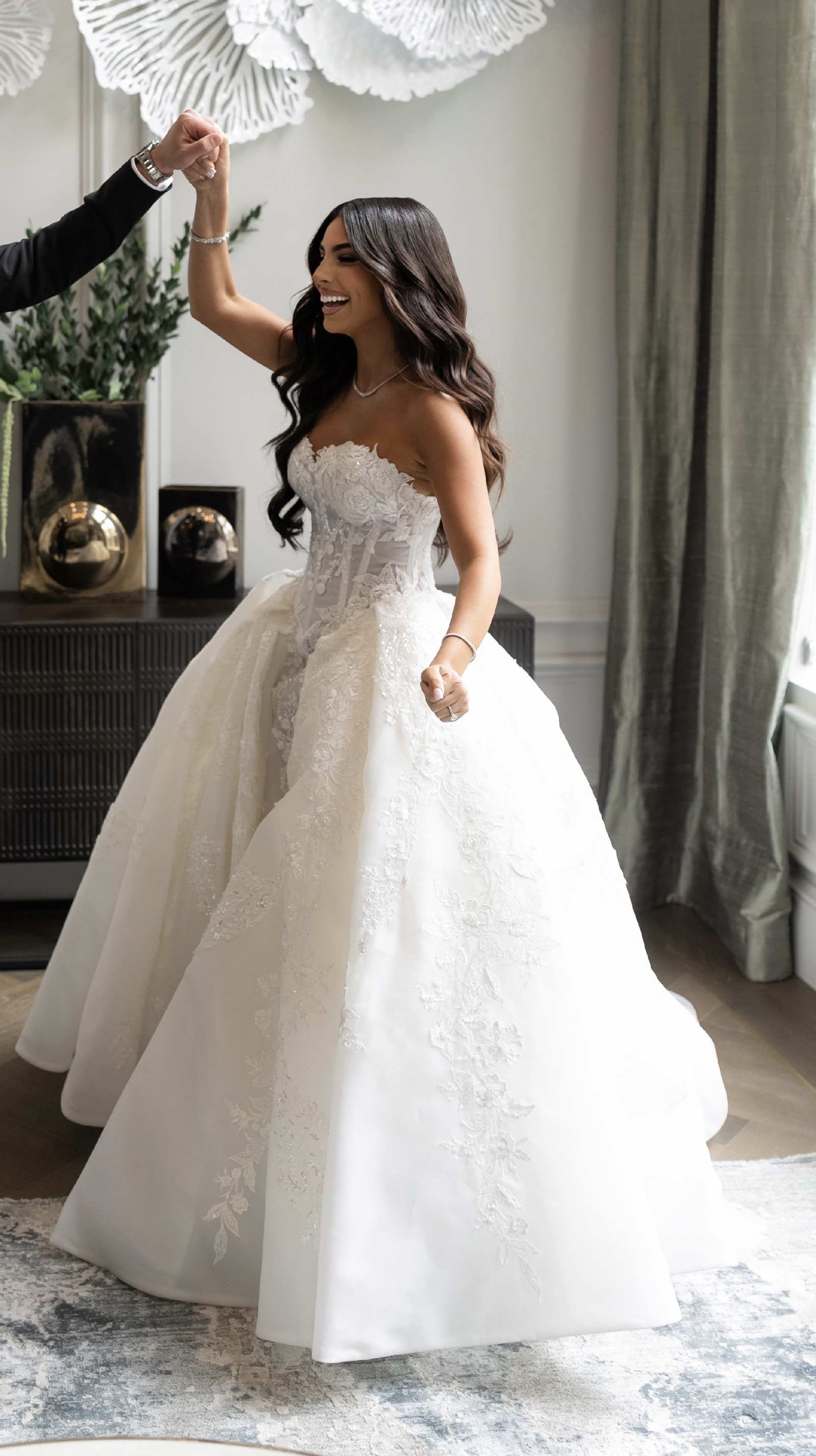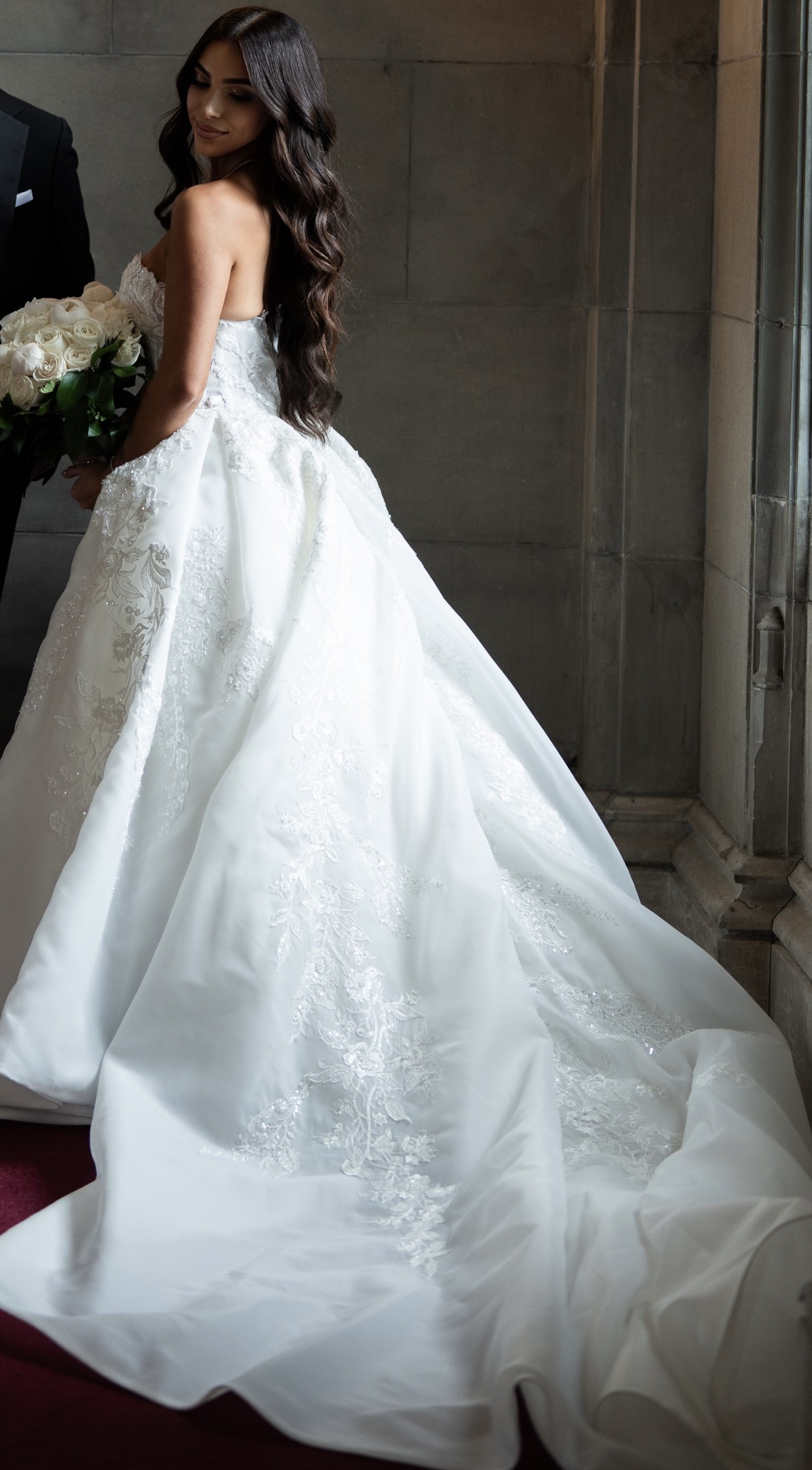 This custom-made Kashi Couture ballgown was the dress of my dreams on my special day. With its stunning sweetheart neckline and elegant strapless design, it hugs the body perfectly while allowing for graceful movement. The corset back not only adds a touch of allure but ensures a tailored fit that feels as good as it looks.