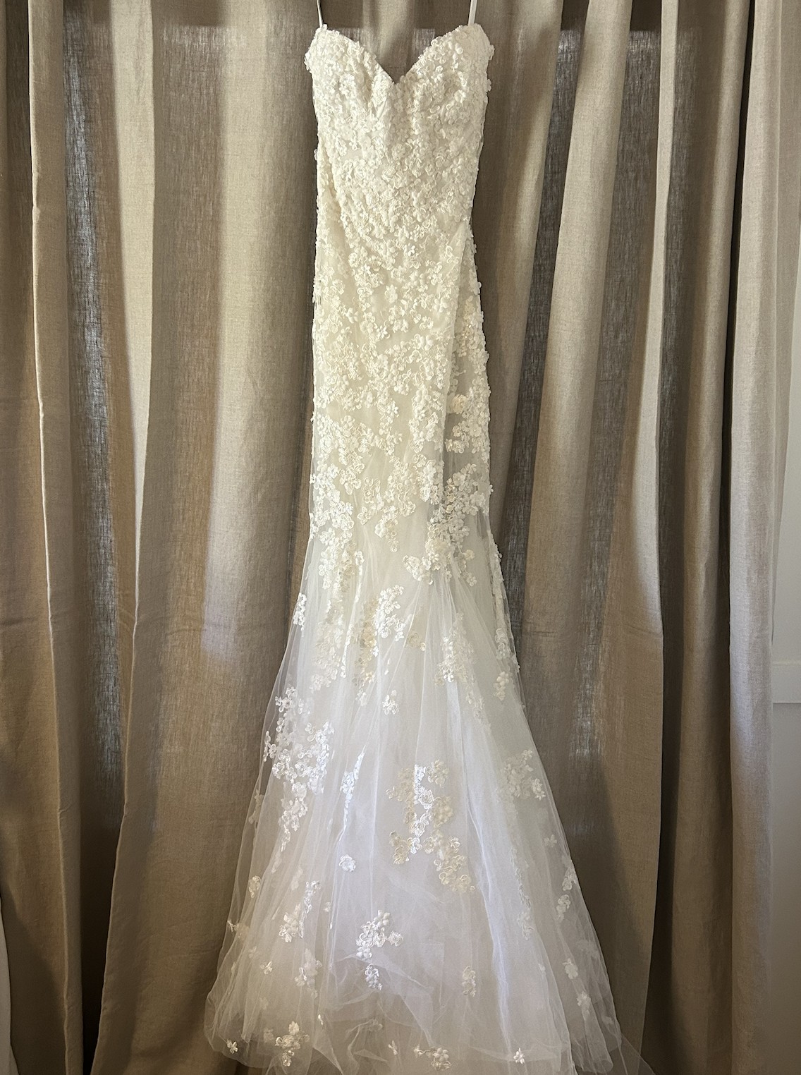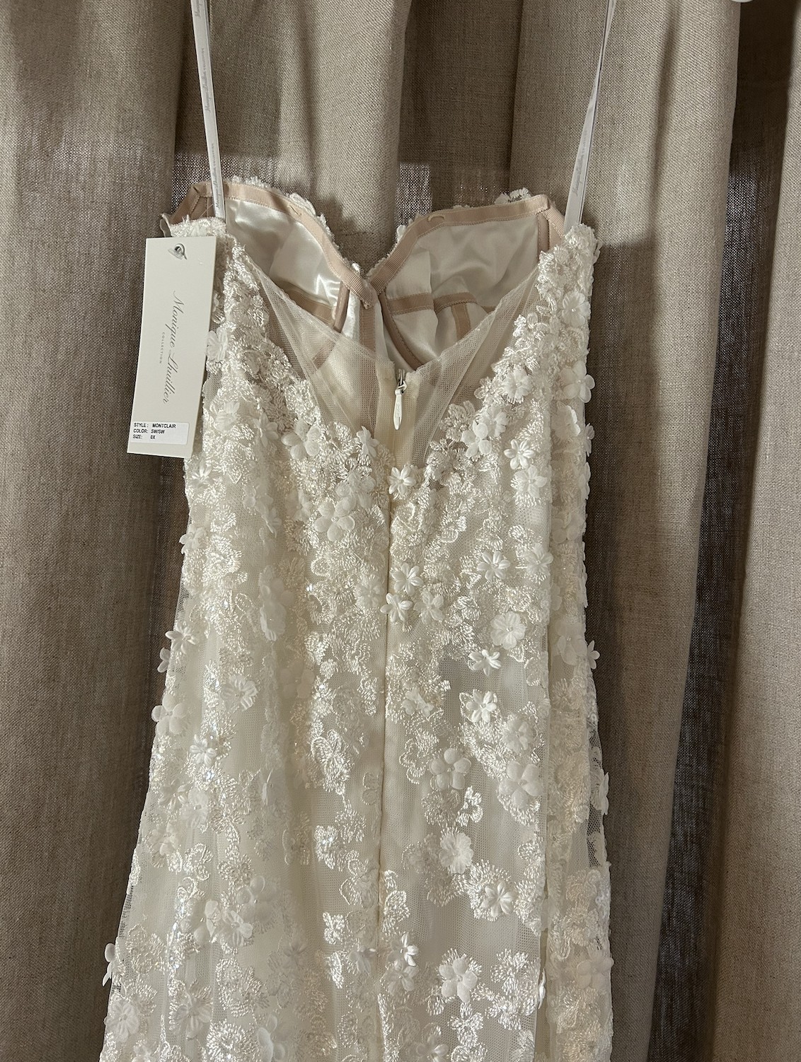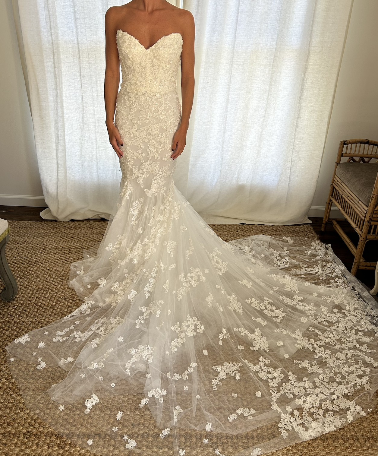 This Montclair gown by Monique Lhuillier encapsulates modern romance with an ethereal twist. Crafted from delicate tulle, the dress features a gorgeous trumpet silhouette that gracefully hugs your curves before flaring out into a mesmerizing train. The sweetheart neckline accentuates the décolletage, while the strapless design offers an elegant allure, ensuring you feel confident as you walk down the aisle.