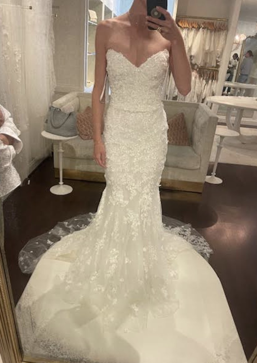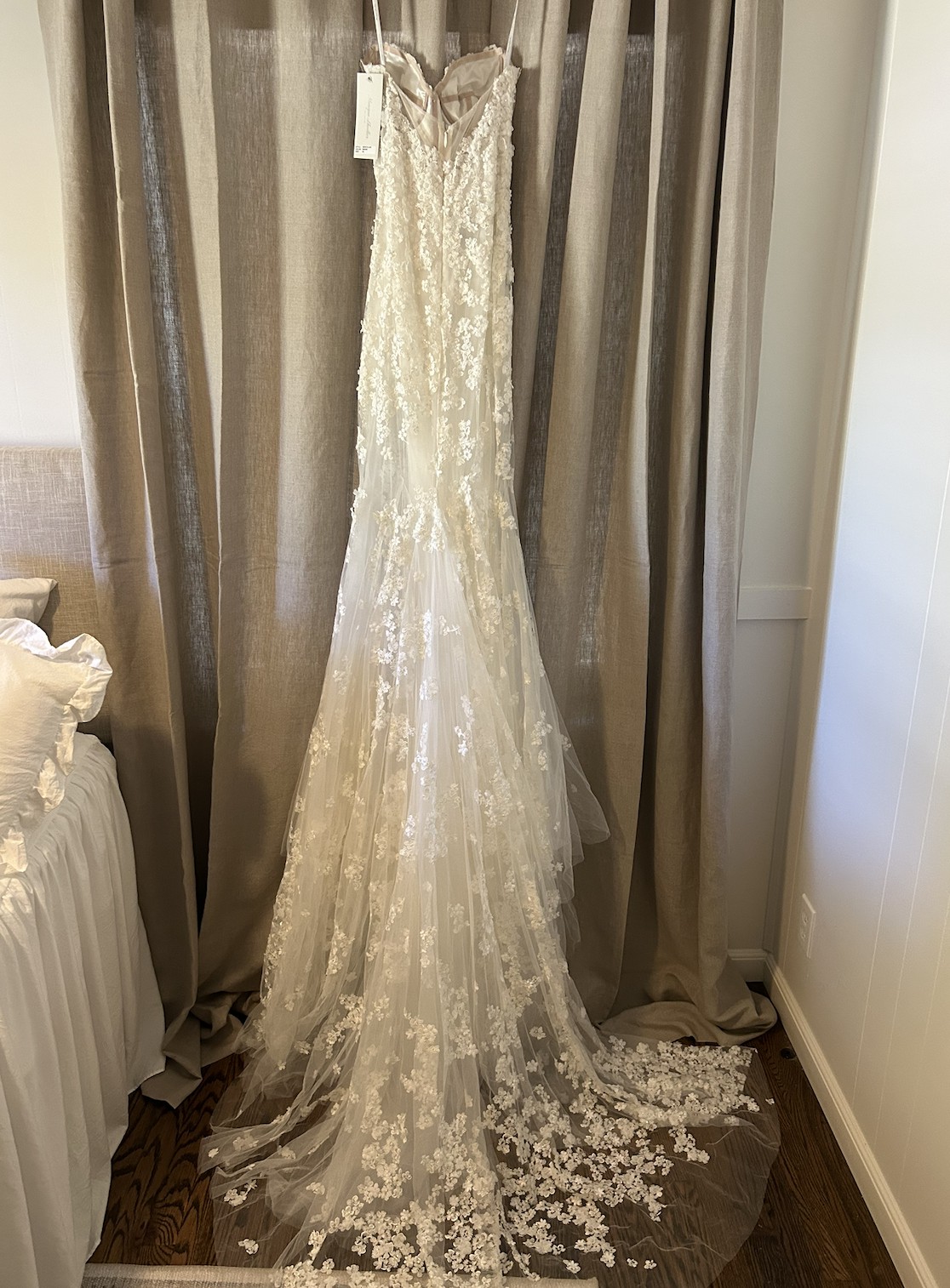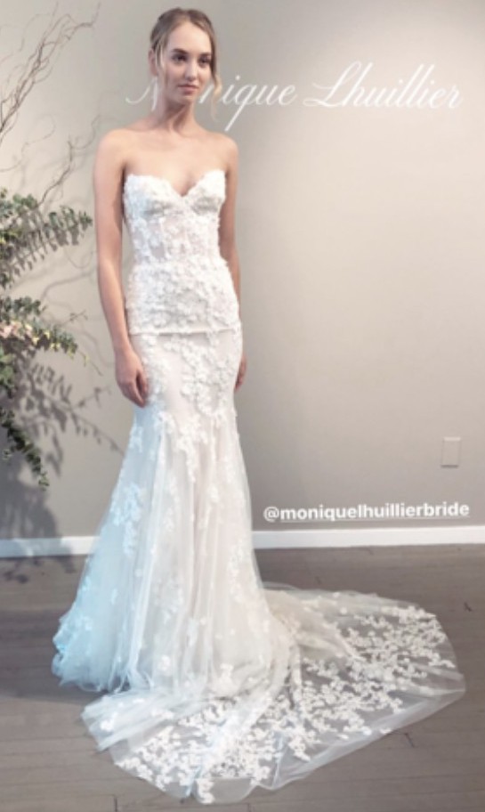 This Montclair gown by Monique Lhuillier encapsulates modern romance with an ethereal twist. Crafted from delicate tulle, the dress features a gorgeous trumpet silhouette that gracefully hugs your curves before flaring out into a mesmerizing train. The sweetheart neckline accentuates the décolletage, while the strapless design offers an elegant allure, ensuring you feel confident as you walk down the aisle.