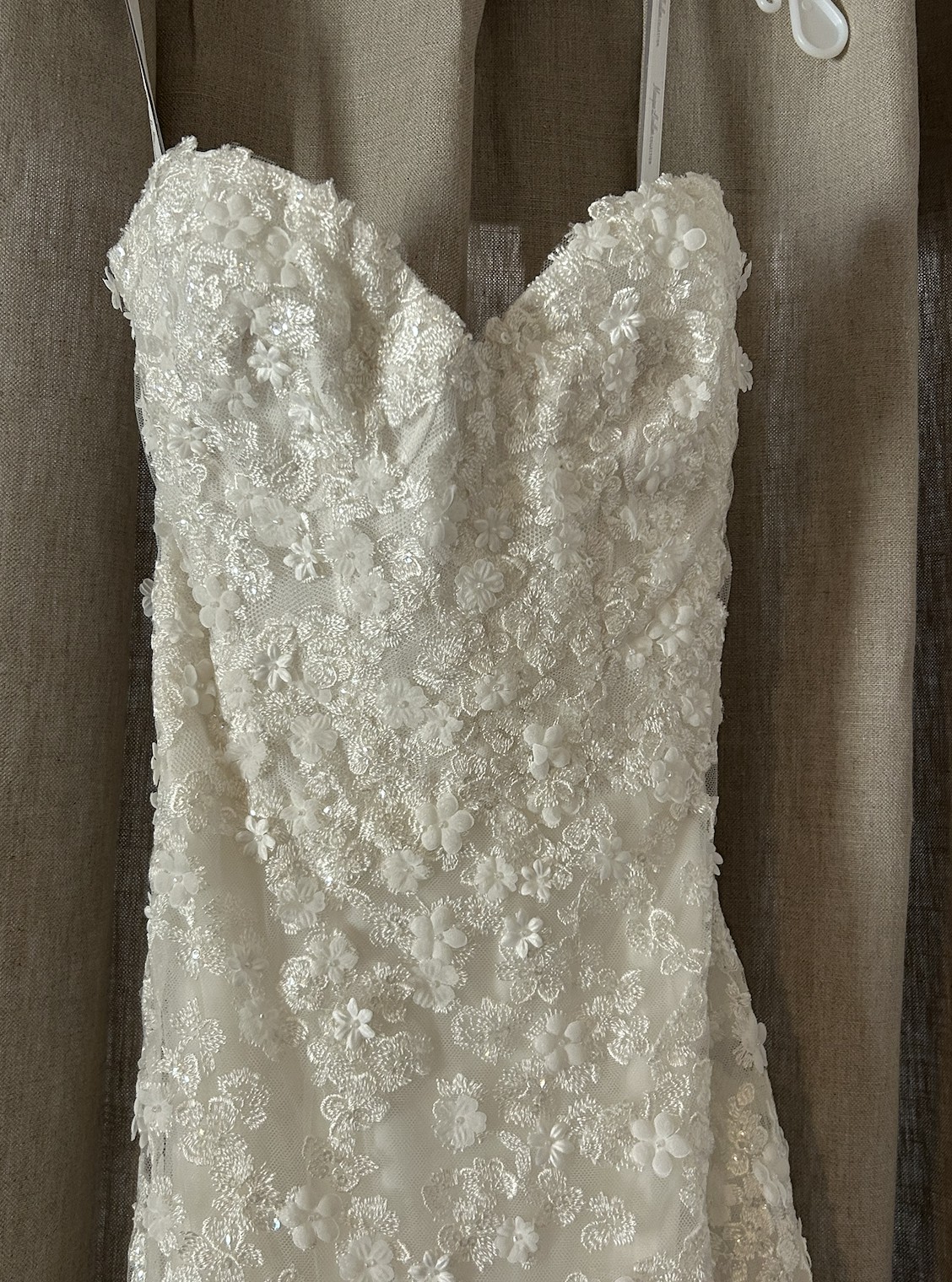 In a timeless shade of white, the Montclair demands attention with its intricate details yet maintains a sense of gracefulness. Whether you’re exchanging vows in a grand ballroom or a sunlit garden, this wedding dress guarantees you will feel like a true vision. Make your special day unforgettable with this extraordinary gown, celebrating love and beauty in every petal and bead.