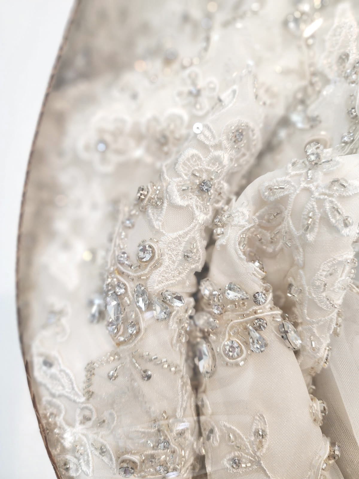 This gown photographs beautifully under both natural and indoor lighting — the beading catches light with a subtle, romantic sparkle. Perfect for the bride who wants a classic yet glamorous look that feels effortlessly elegant.