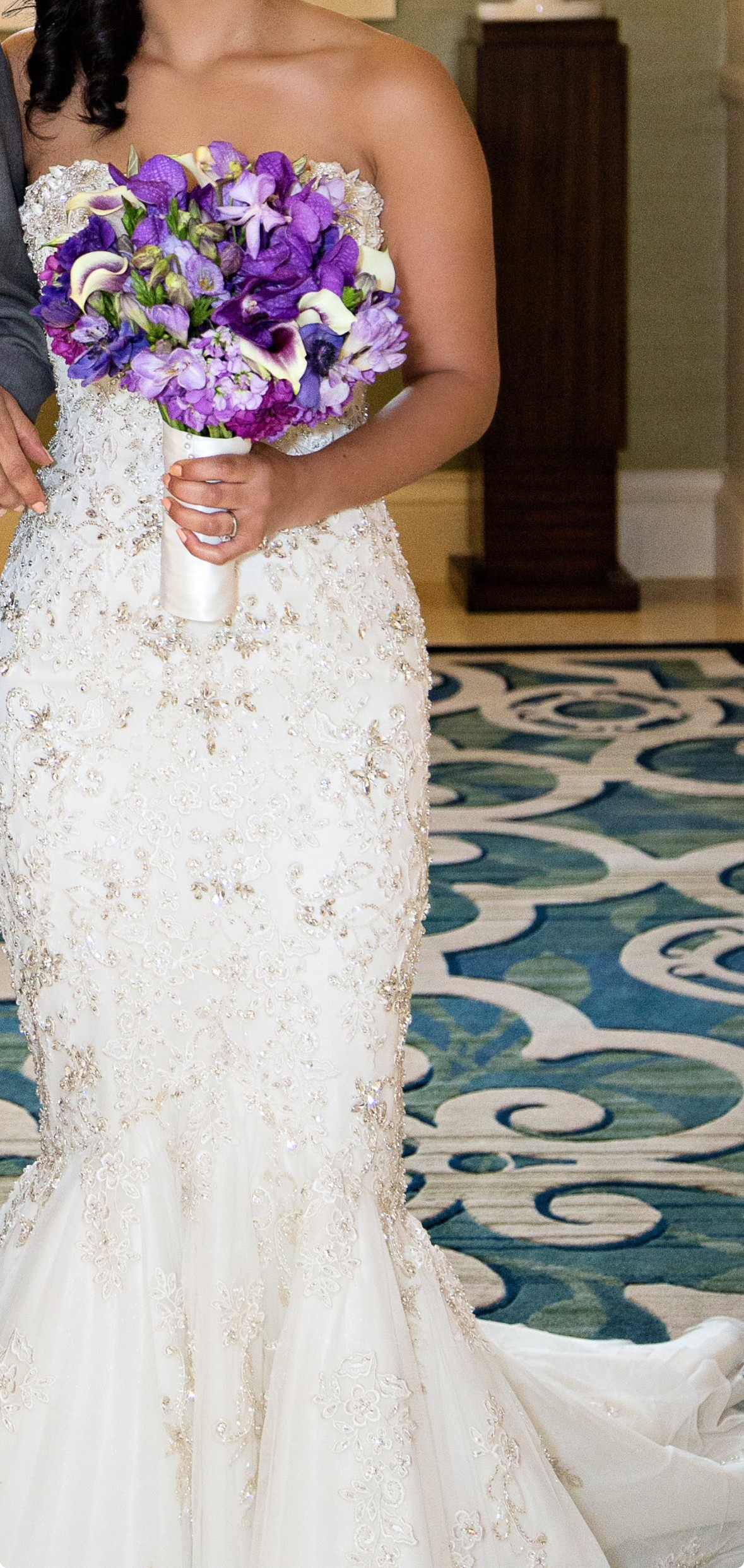 Make a breathtaking entrance in this stunning designer mermaid-style wedding gown, originally purchased in New York for $5,500. This couture-inspired piece features intricate hand-beaded detailing throughout the bodice and hips, creating a luxurious shimmer from every angle.
