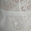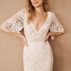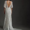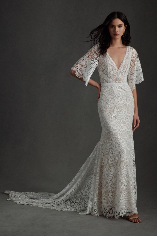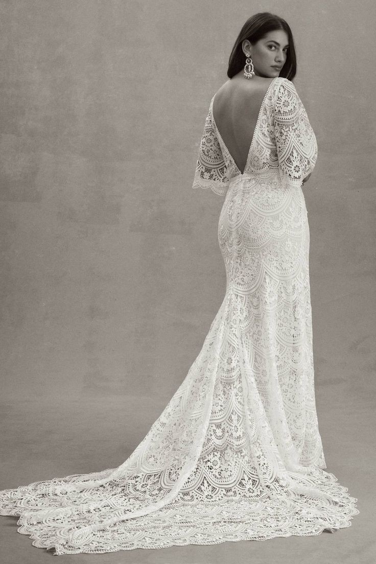 The Rish Haleh wedding gown offers allover delicate floral lace and intricate beadwork on a flirty, fit-and-flare silhouette. Flutter sleeves and a v-neckline add dimensional texture while an open v-back design and sweeping chapel train lend effortless sophistication.
