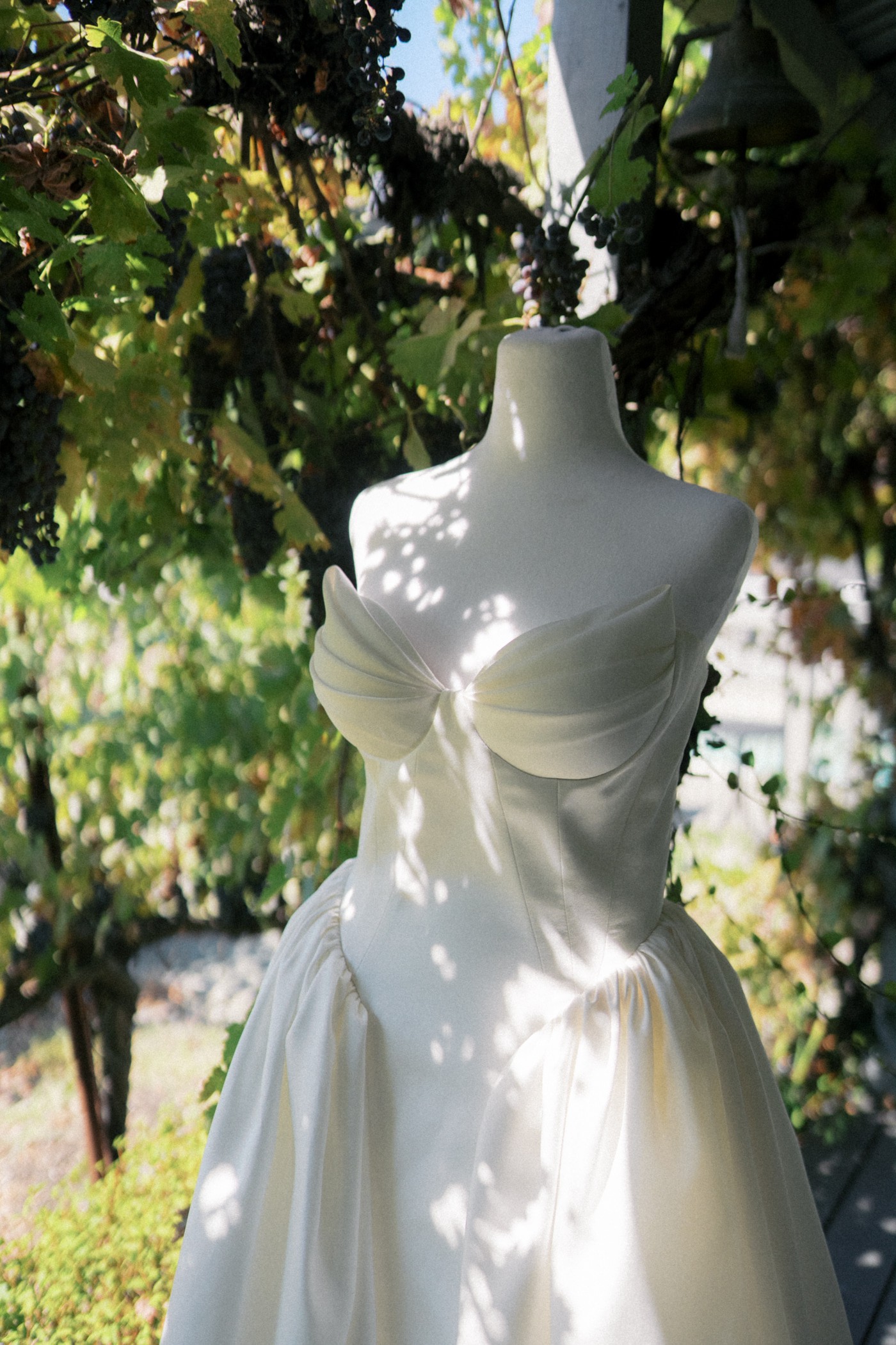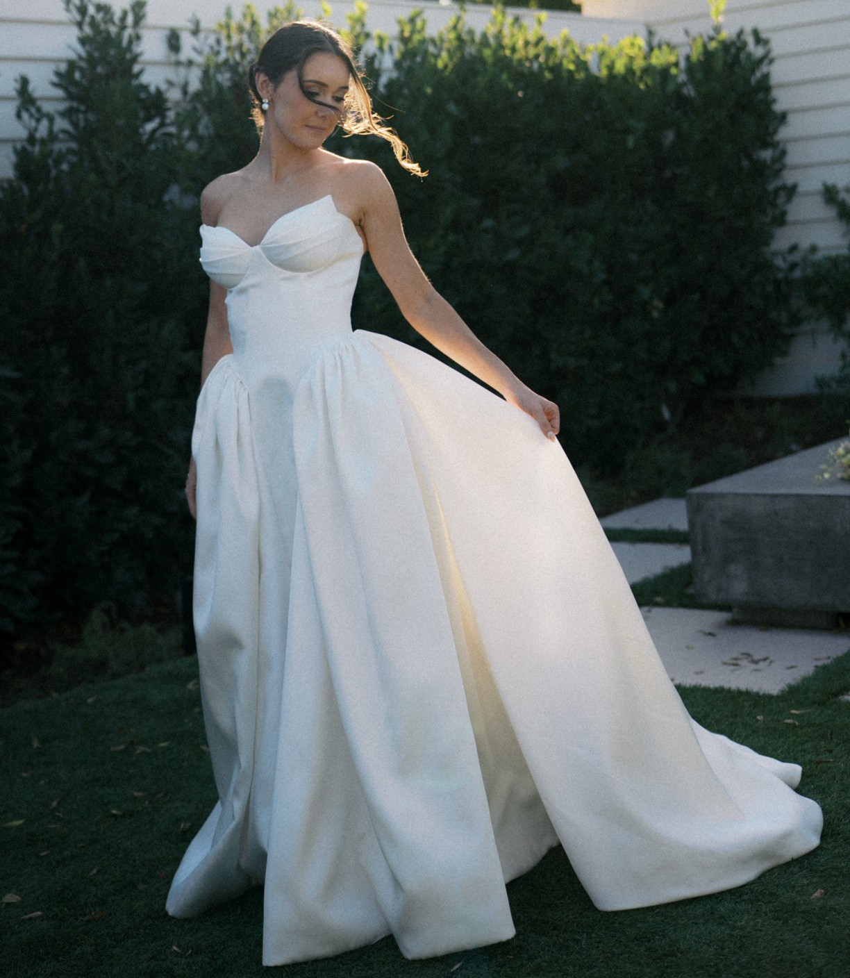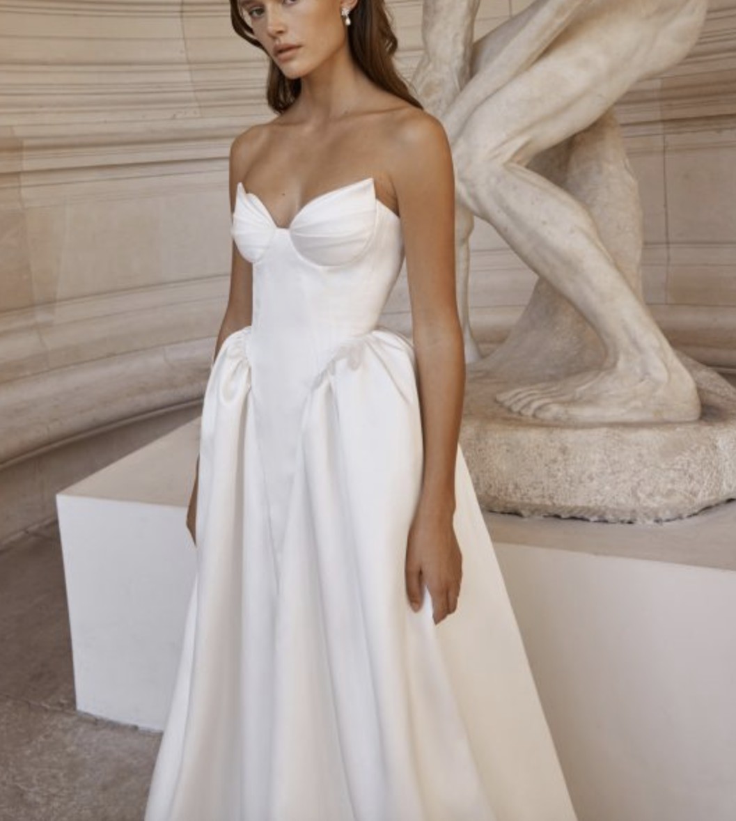 Chic, modern, and elegant, this utterly breathtaking ball gown is crafted with luxurious silk Mikado fabric from head to toe. The strapless corset bodice is paired with a basque waistline while delicate pleating adorns the bust. The dropped waist sculpts the torso before erupting into a grandeur skirt with an aisle-worthy train. Originally purchased from Iconic Bride in Dallas and altered to fit a size 4. The corset laces up and can be adjusted based on the preferred fit.