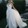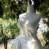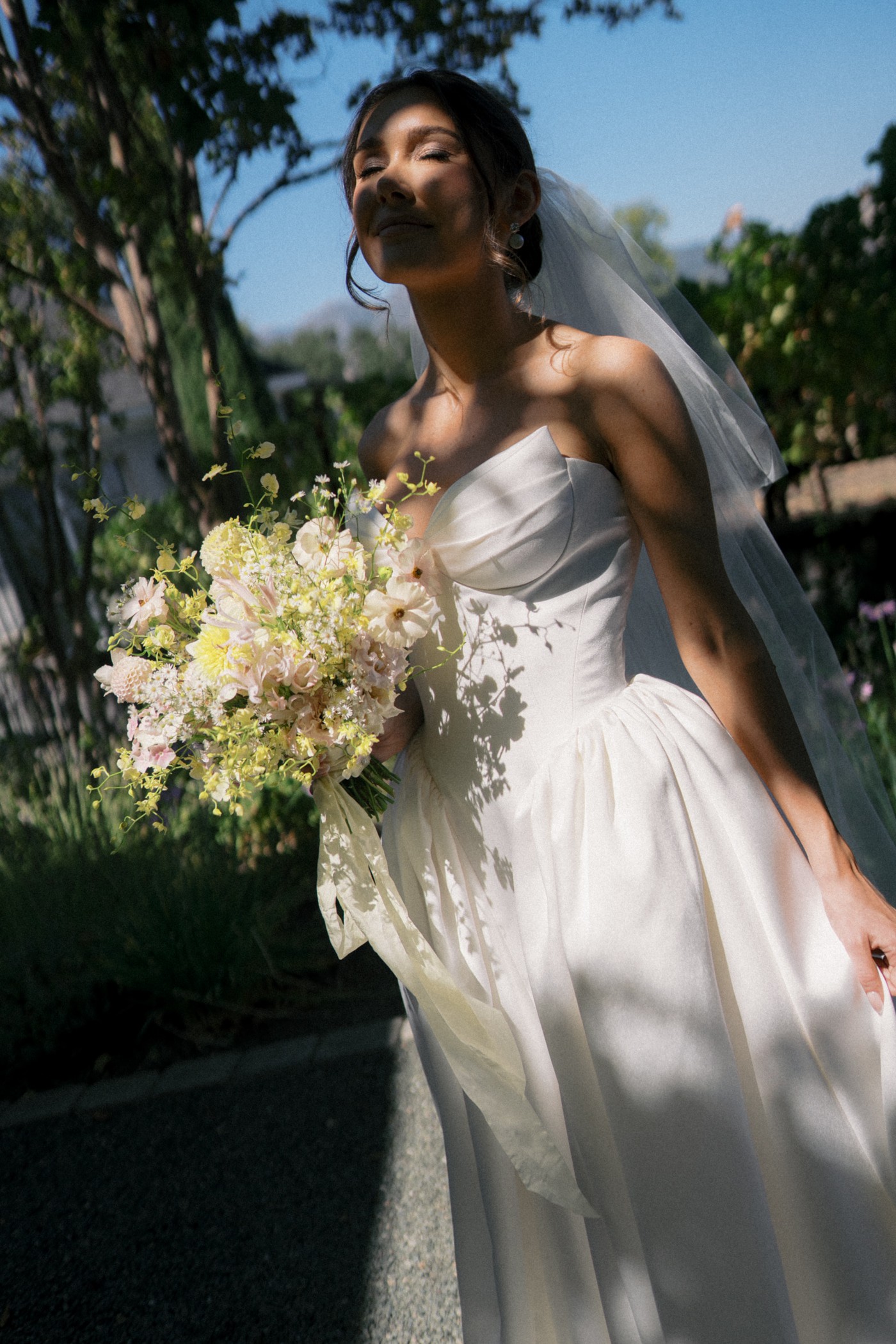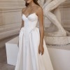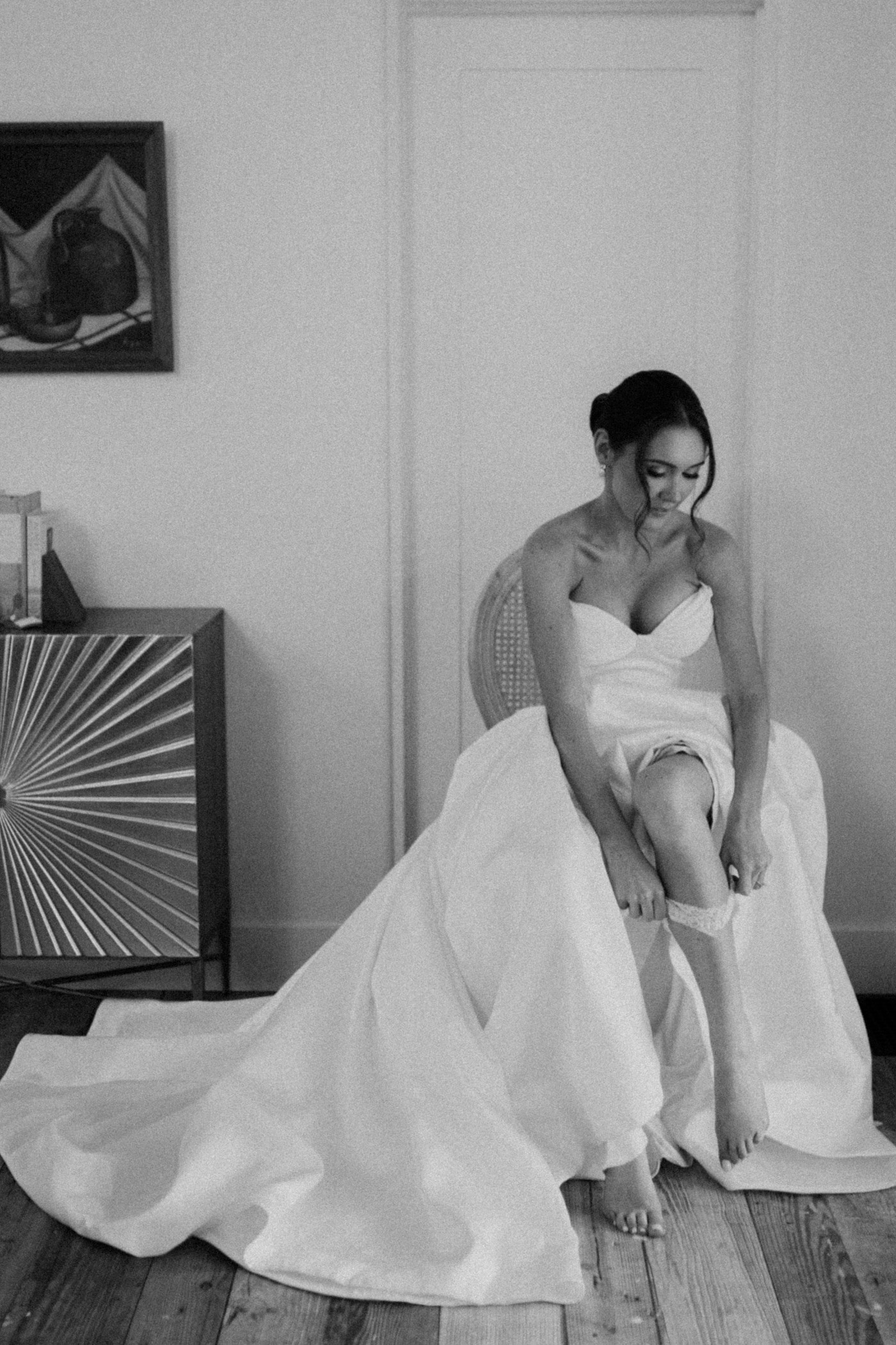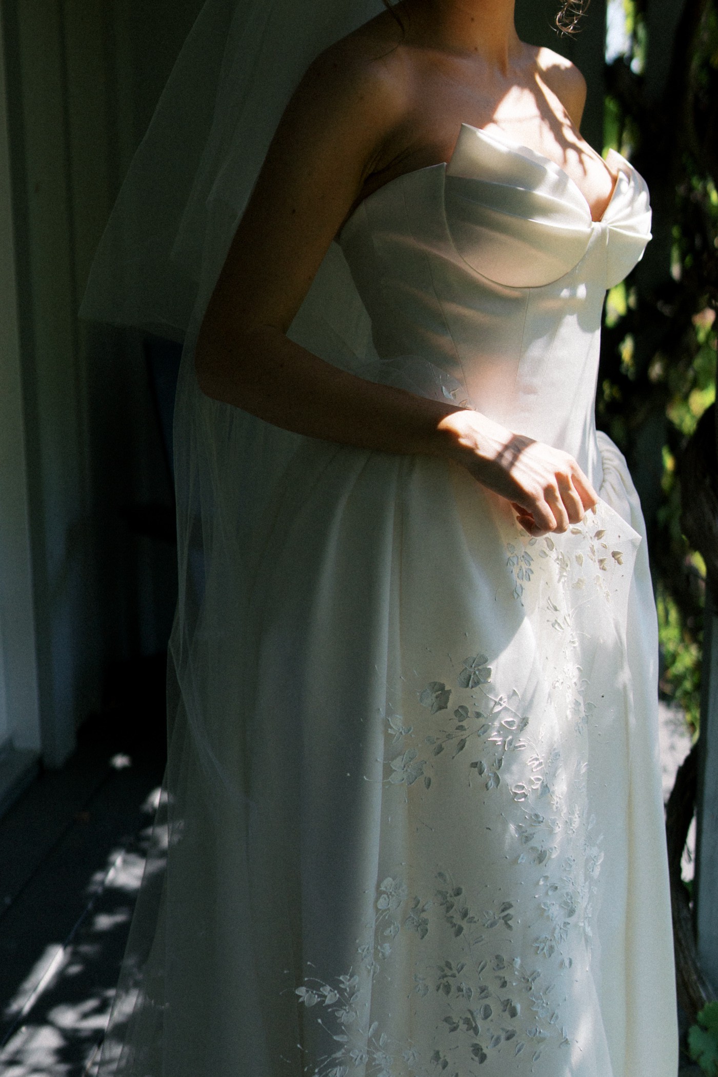 Chic, modern, and elegant, this utterly breathtaking ball gown is crafted with luxurious silk Mikado fabric from head to toe. The strapless corset bodice is paired with a basque waistline while delicate pleating adorns the bust. The dropped waist sculpts the torso before erupting into a grandeur skirt with an aisle-worthy train. Originally purchased from Iconic Bride in Dallas and altered to fit a size 4. The corset laces up and can be adjusted based on the preferred fit.