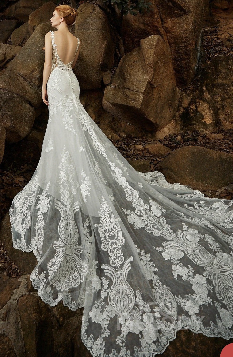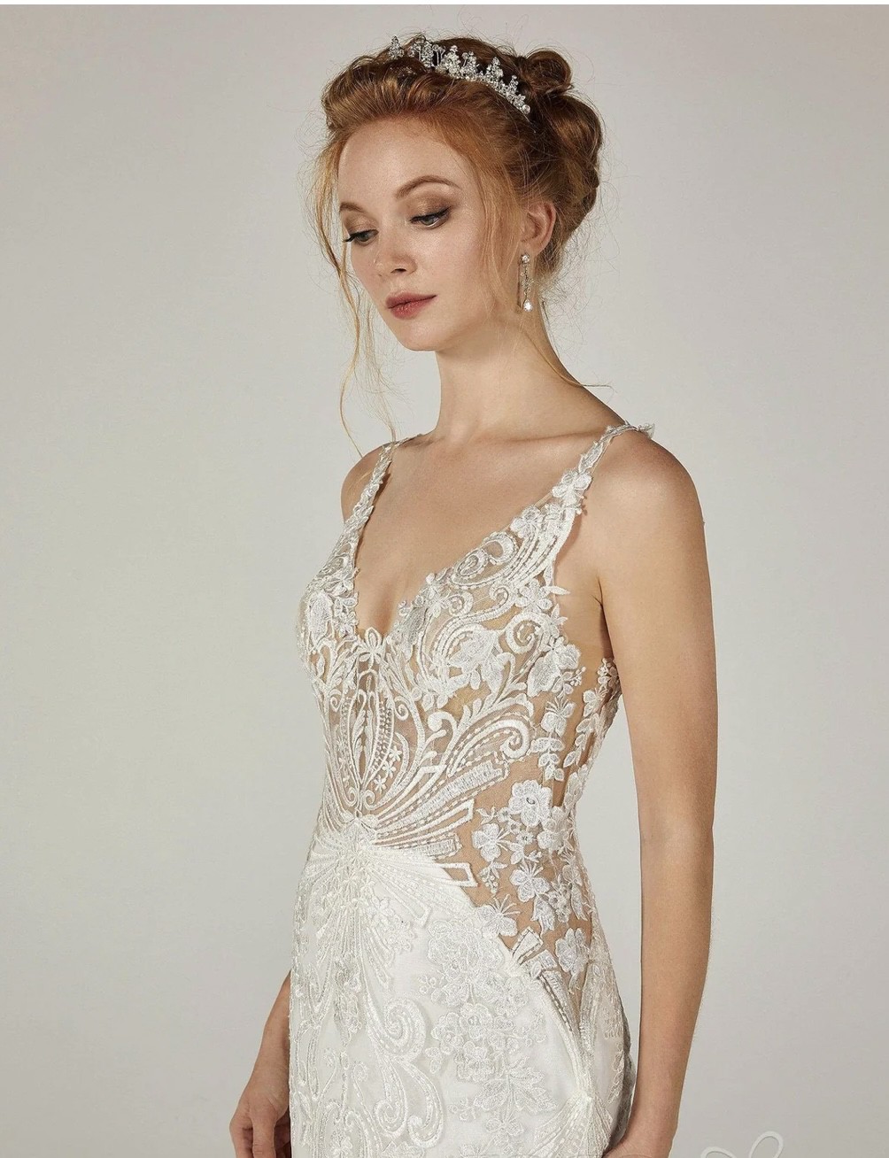 This breathtaking trumpet-mermaid wedding dress was worn once and has been professionally cleaned. It features a fitted ivory bodice that flows into a white skirt, creating a soft, romantic contrast. The silhouette hugs the body beautifully and flares out just below the hips, finished with a dramatic cathedral train- my favorite part- that makes a stunning statement.