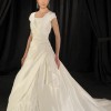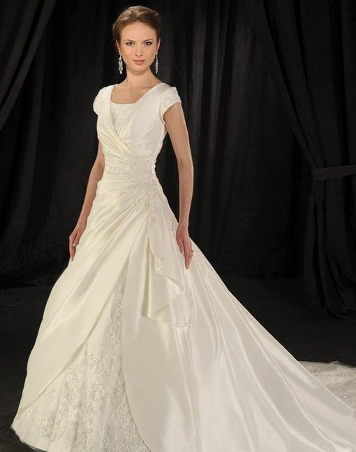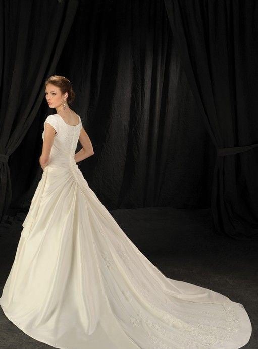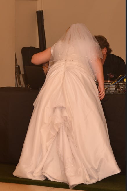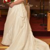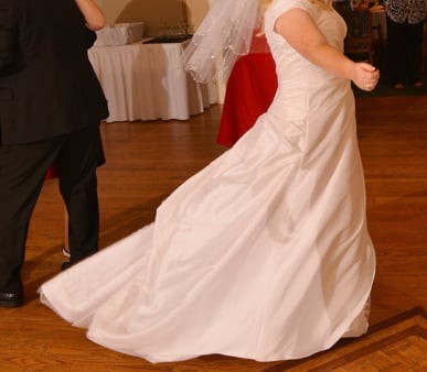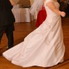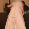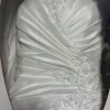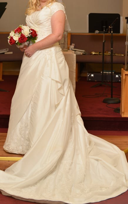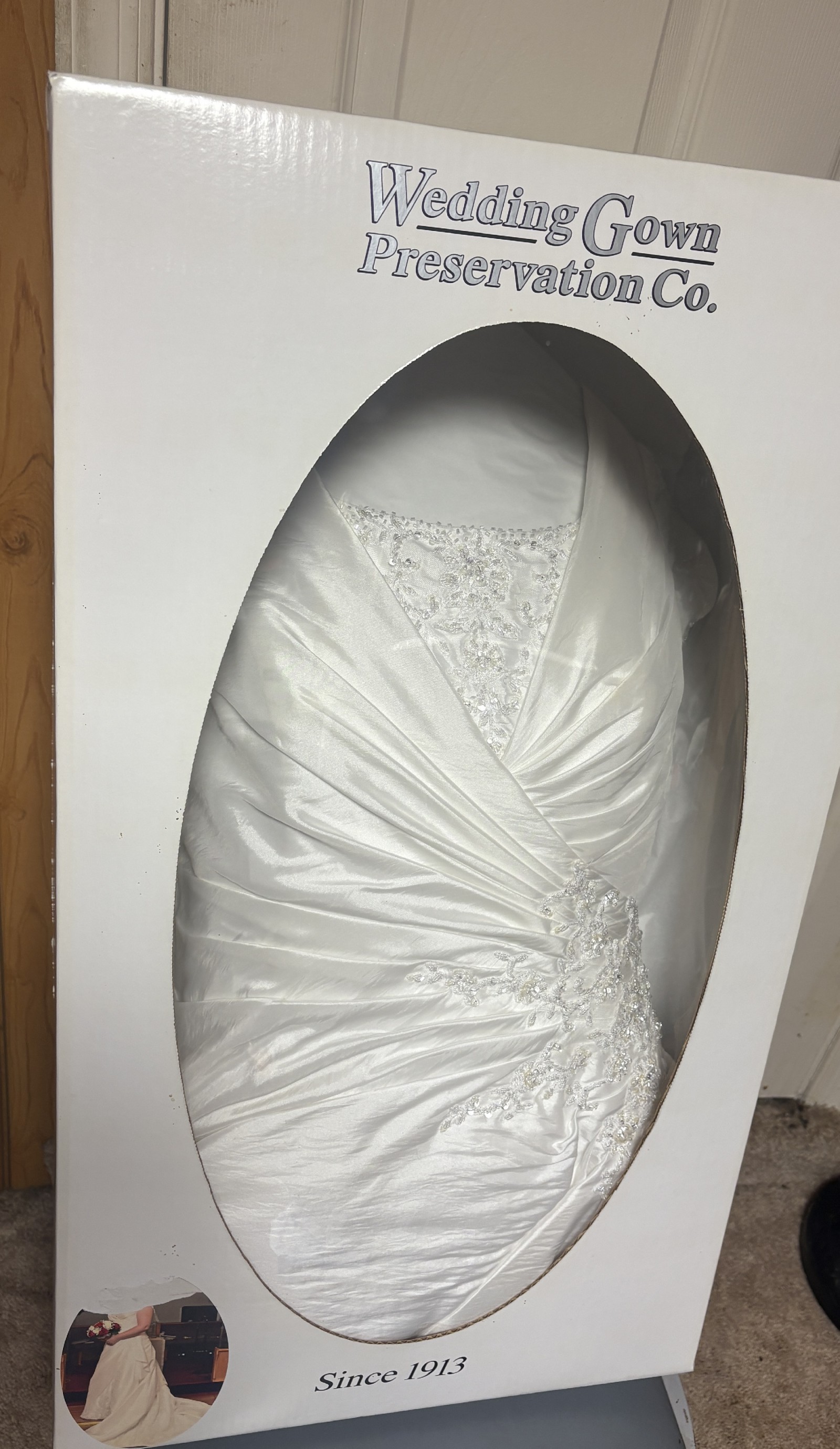 Bonny wedding dress, gently used, has been cleaned, pressed and preserved. A French under bustle was sewn in, as well as cups. I think it was a size 14 but then was altered in some. My regular pants size is 12.