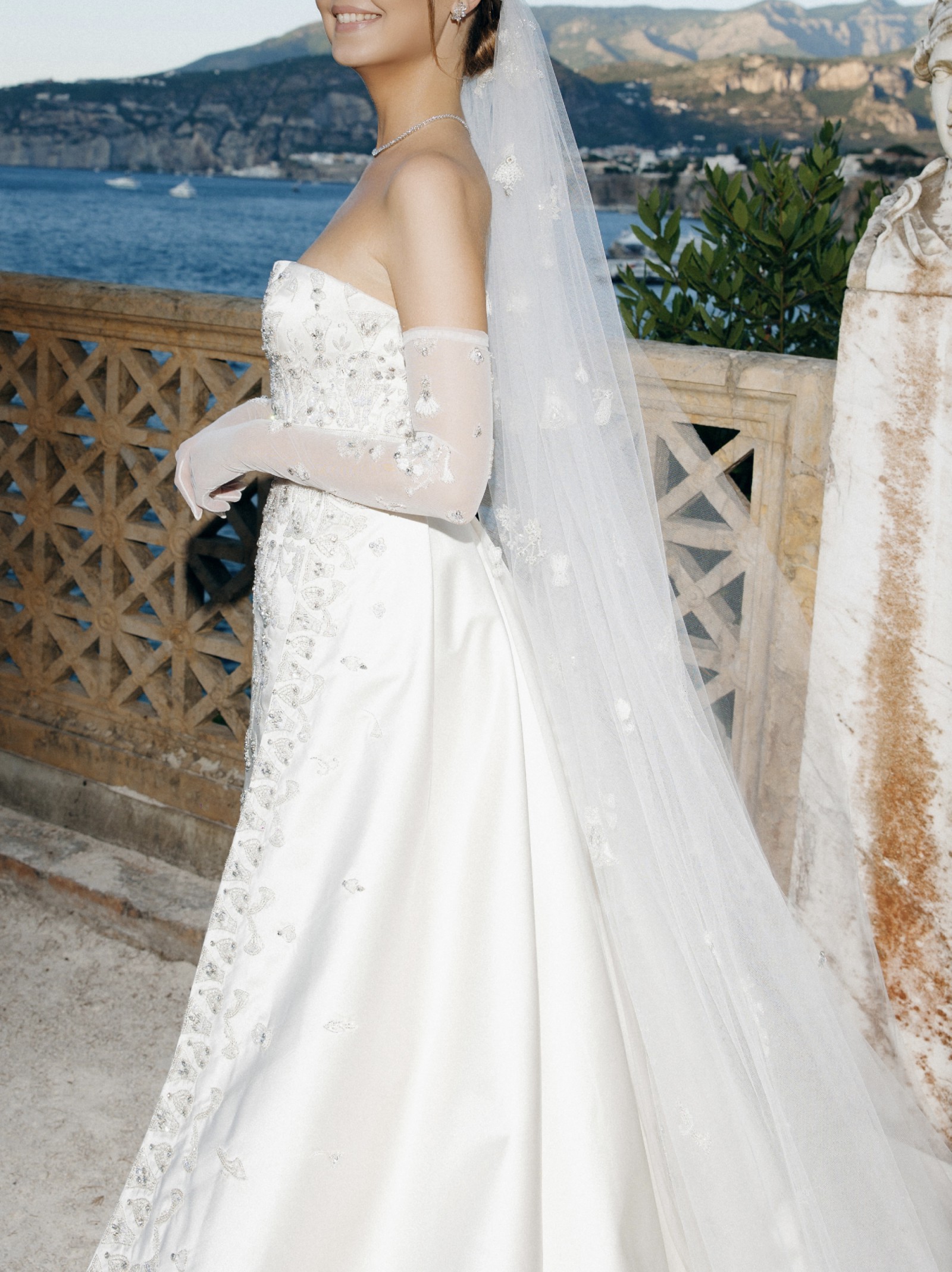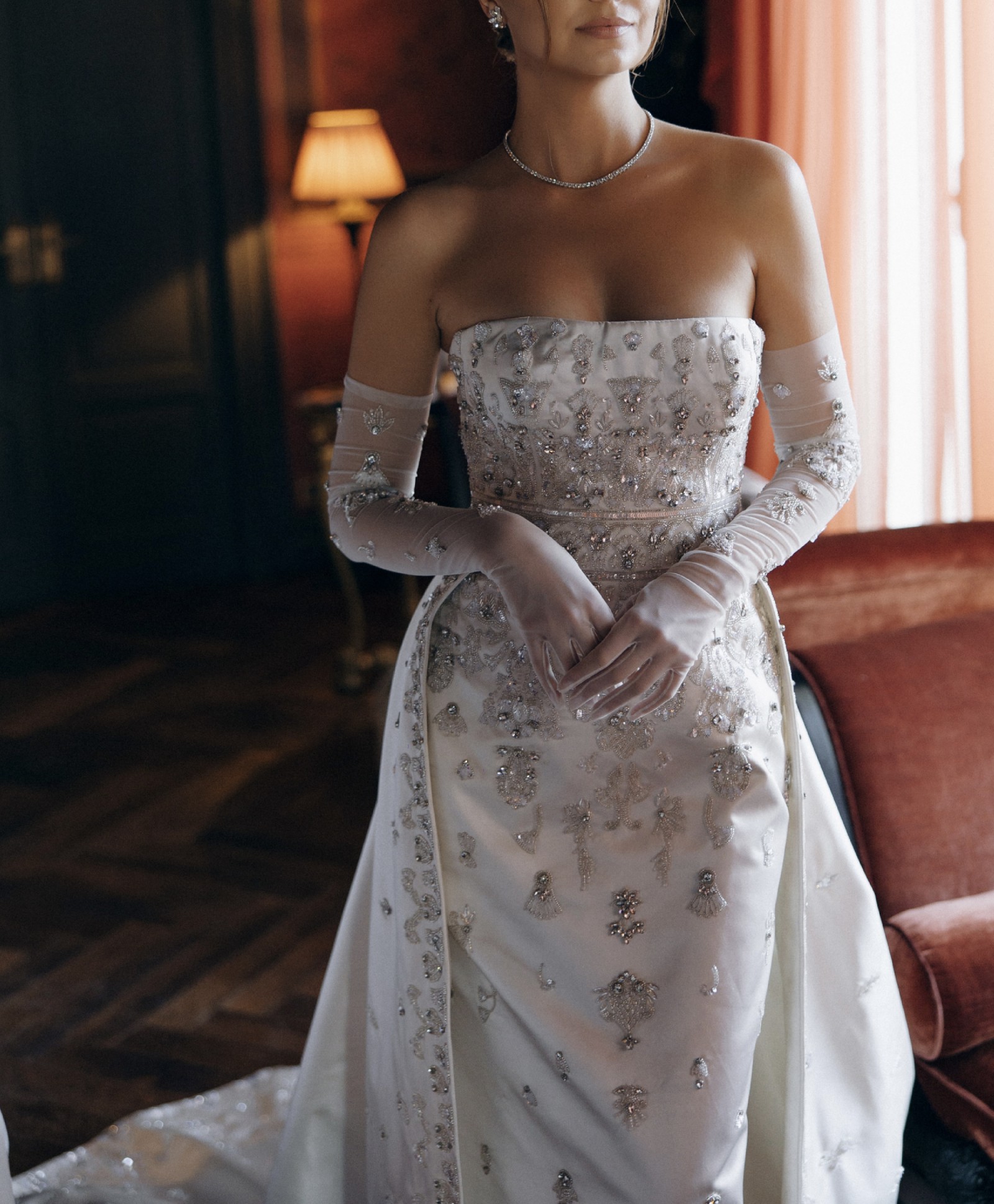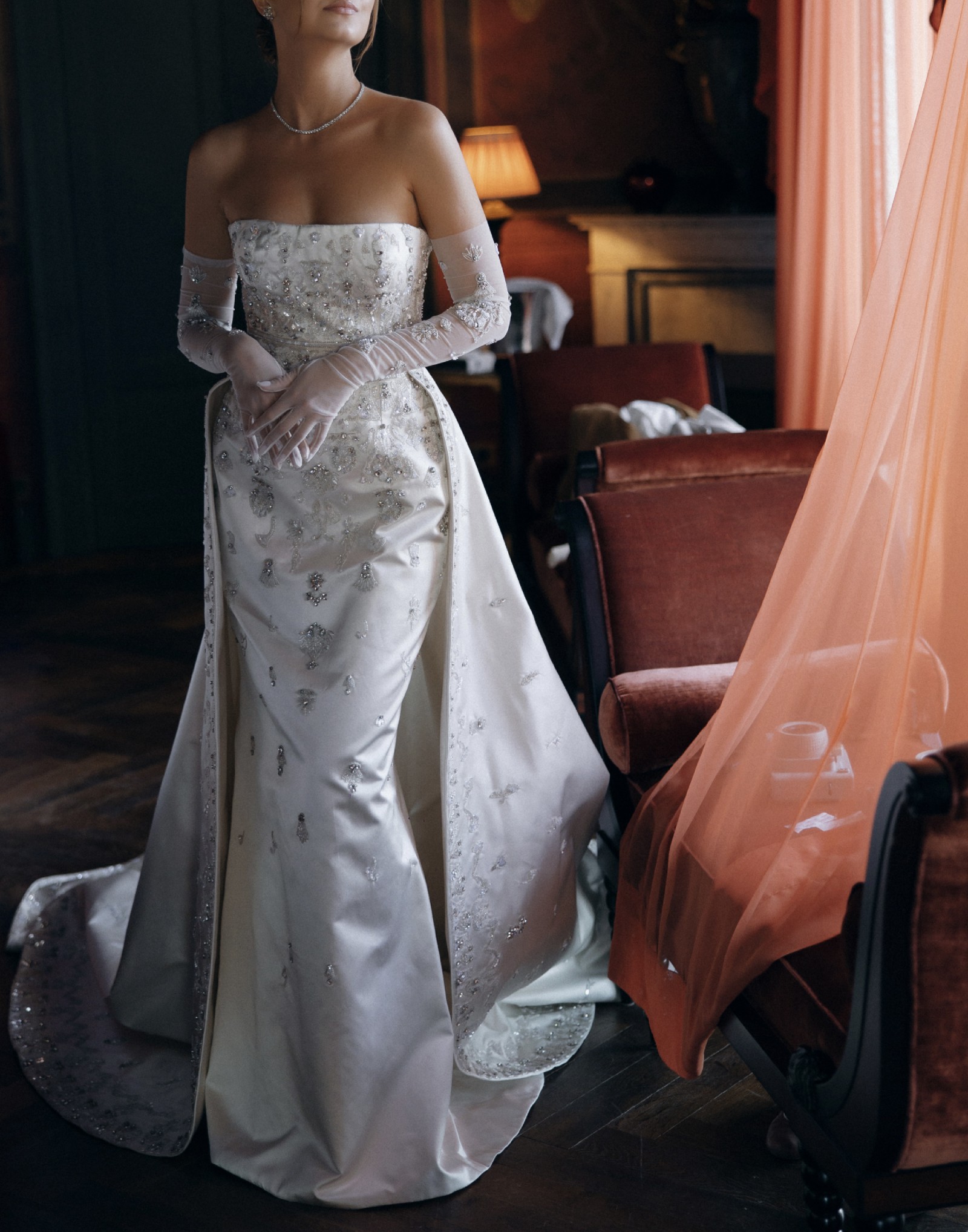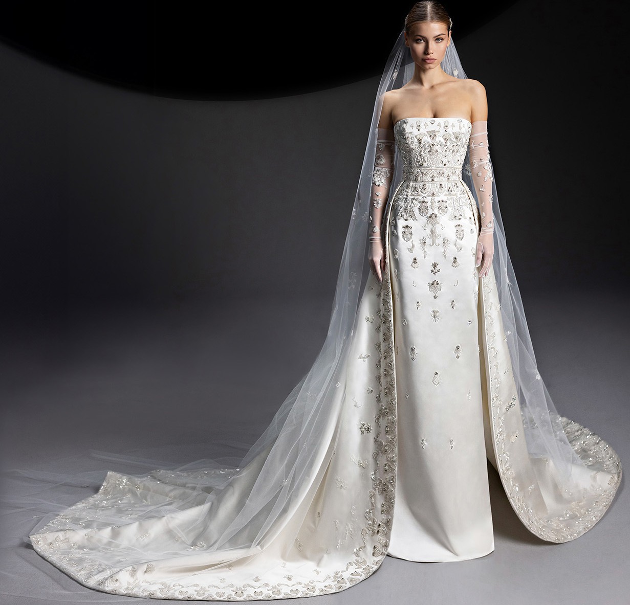 A breathtaking strapless couture gown from Zuhair Murad’s Fall 2024 bridal collection, exquisitely hand-crafted in ivory silk with crystal and silver bead embroidery. The structured bodice flows into a sleek column skirt, framed by an overskirt and cathedral-length train adorned with delicate embellishments. A masterpiece of modern romance and timeless elegance, designed for the bride who wants to make an unforgettable entrance!
