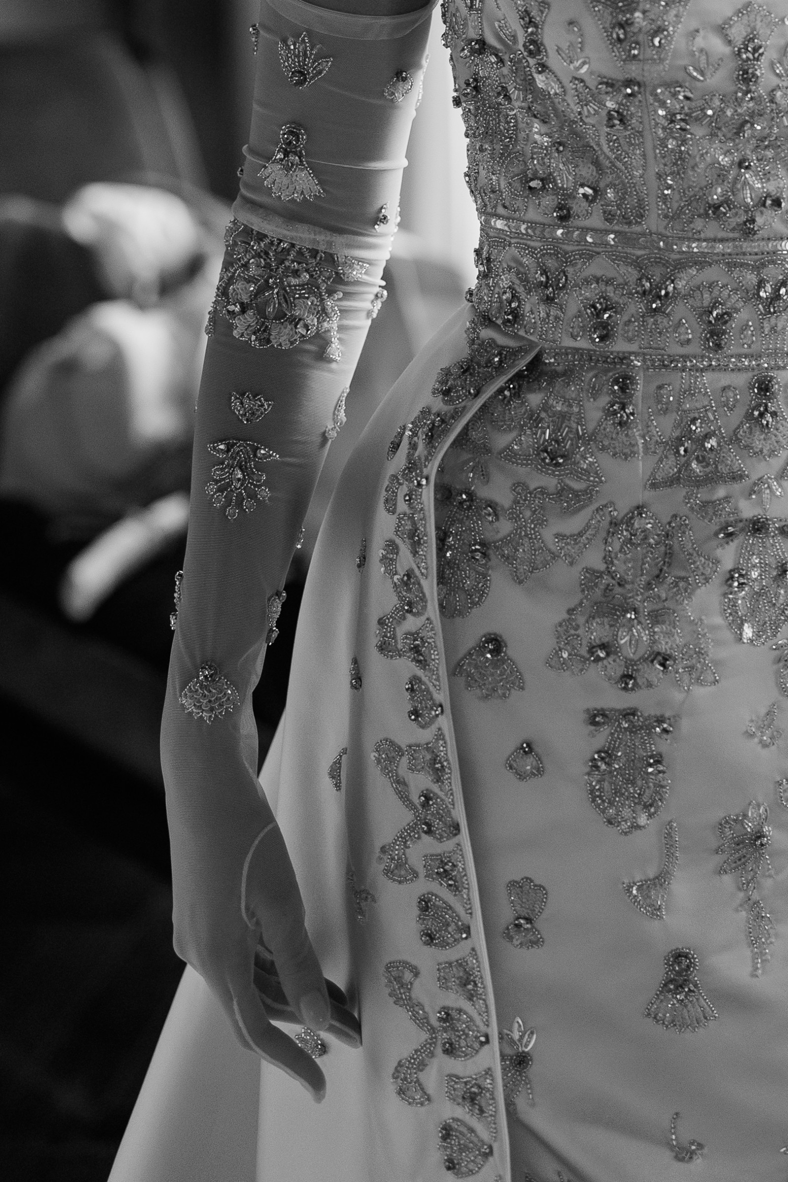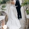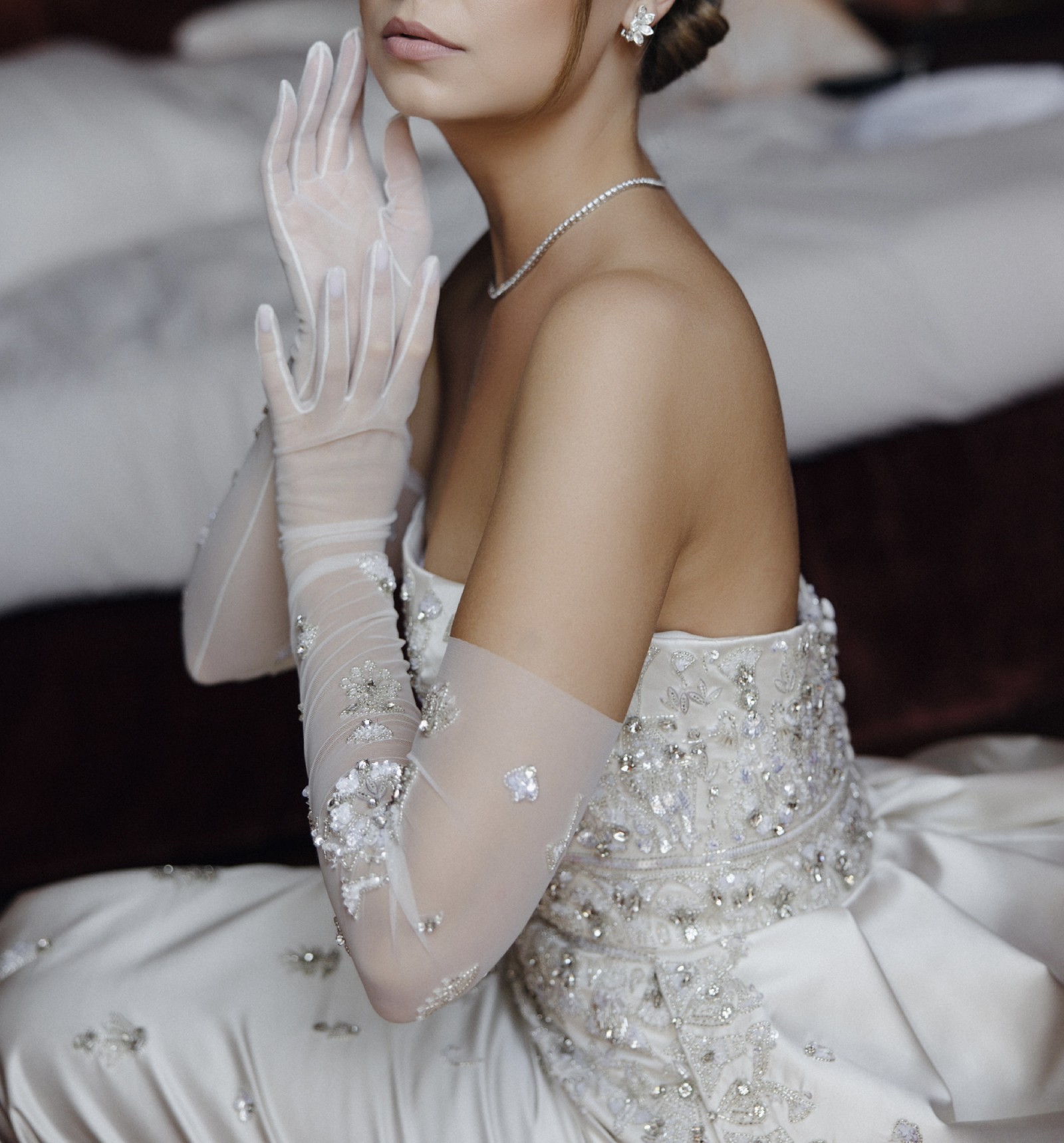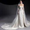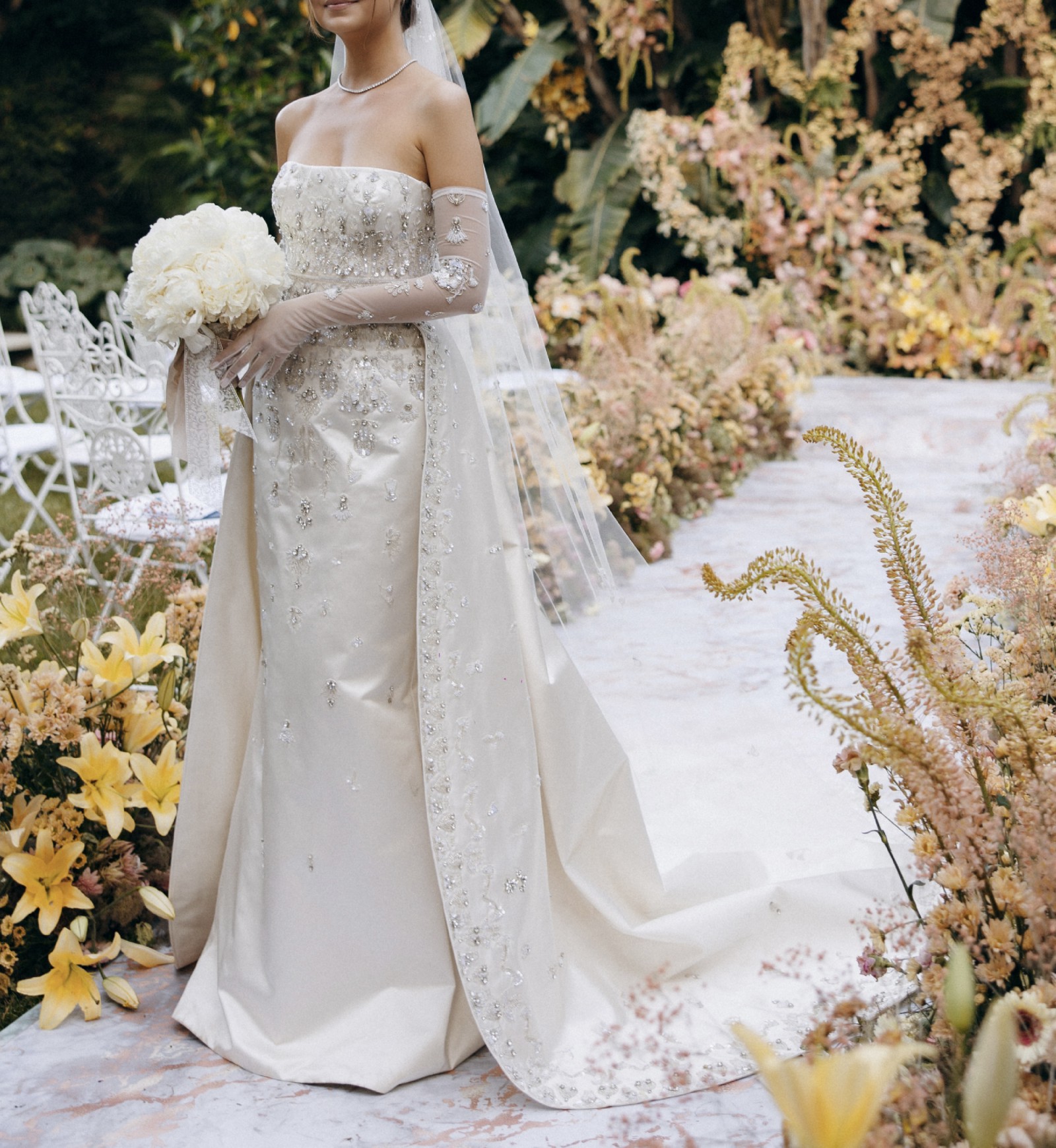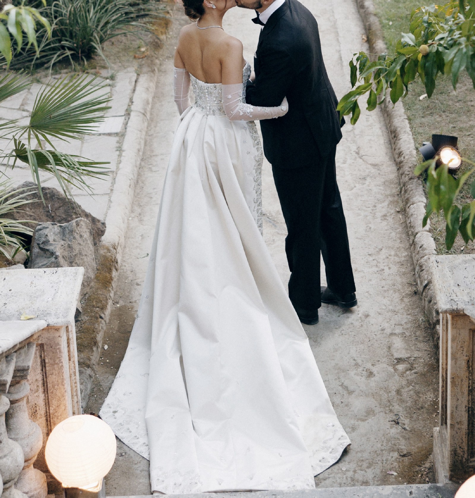 A breathtaking strapless couture gown from Zuhair Murad’s Fall 2024 bridal collection, exquisitely hand-crafted in ivory silk with crystal and silver bead embroidery. The structured bodice flows into a sleek column skirt, framed by an overskirt and cathedral-length train adorned with delicate embellishments. A masterpiece of modern romance and timeless elegance, designed for the bride who wants to make an unforgettable entrance!