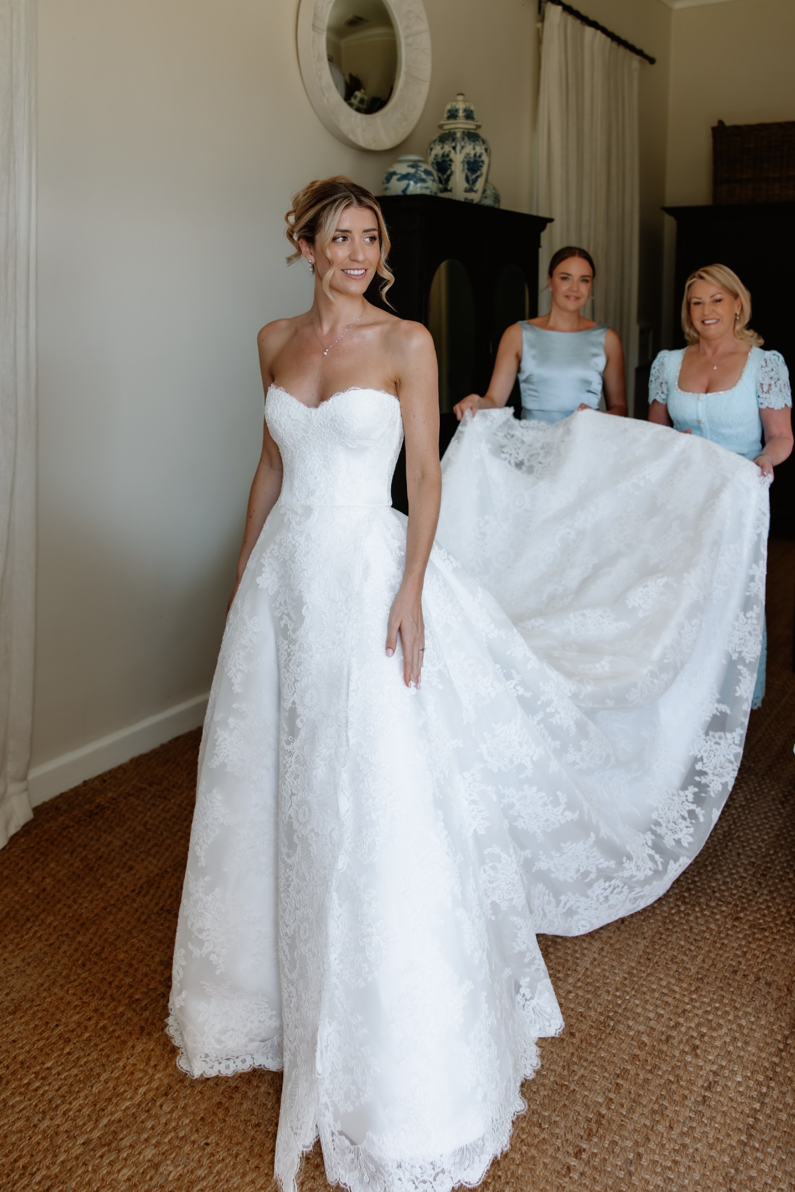 This Wellesley dress by Suzanne Neville is a dream come true for any bride seeking elegance and sophistication on her special day. With its stunning A-line silhouette and sweetheart neckline, it beautifully highlights the figure while providing a flattering fit. The low back adds a touch of allure, perfectly balancing the overall romantic aesthetic.