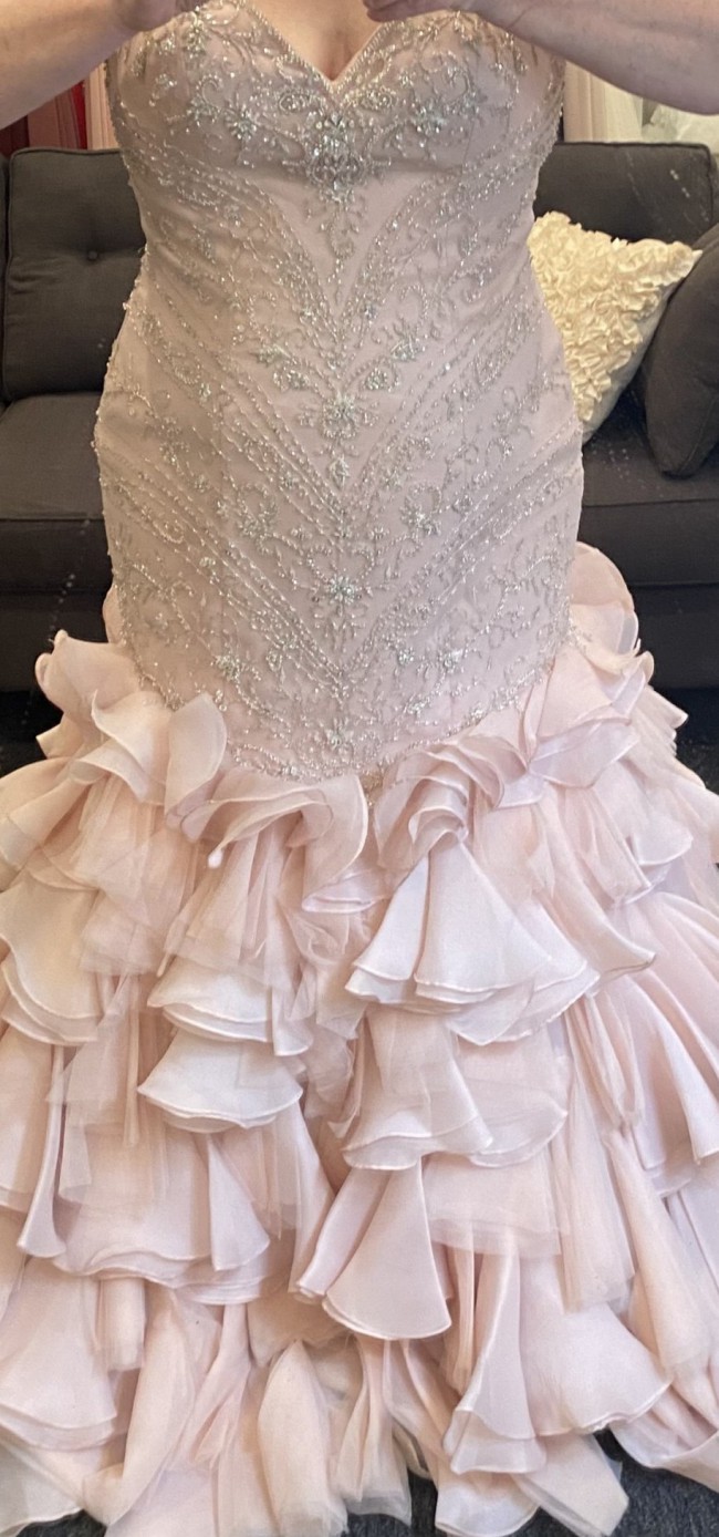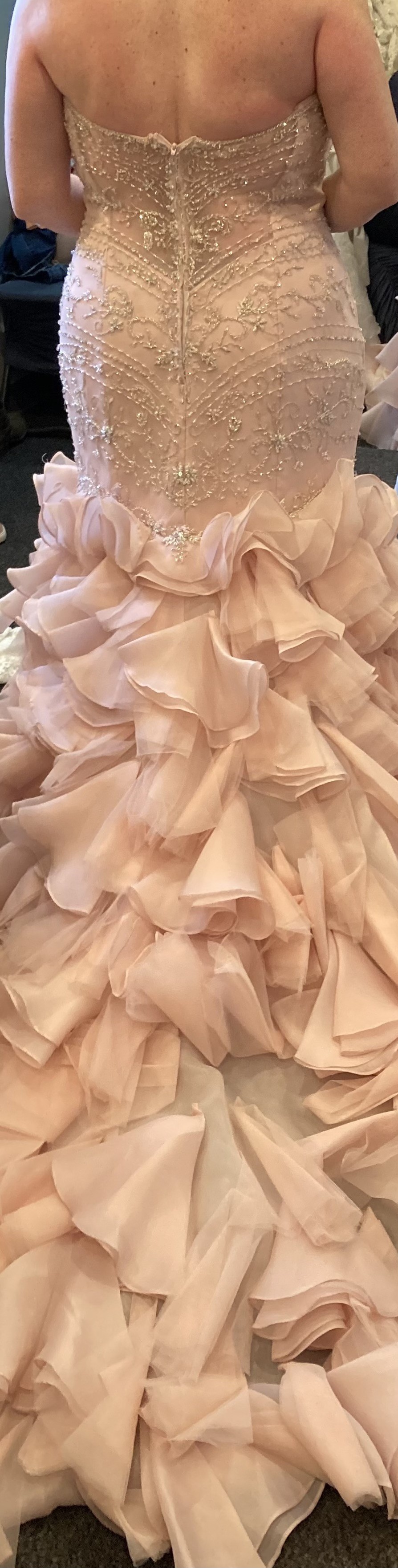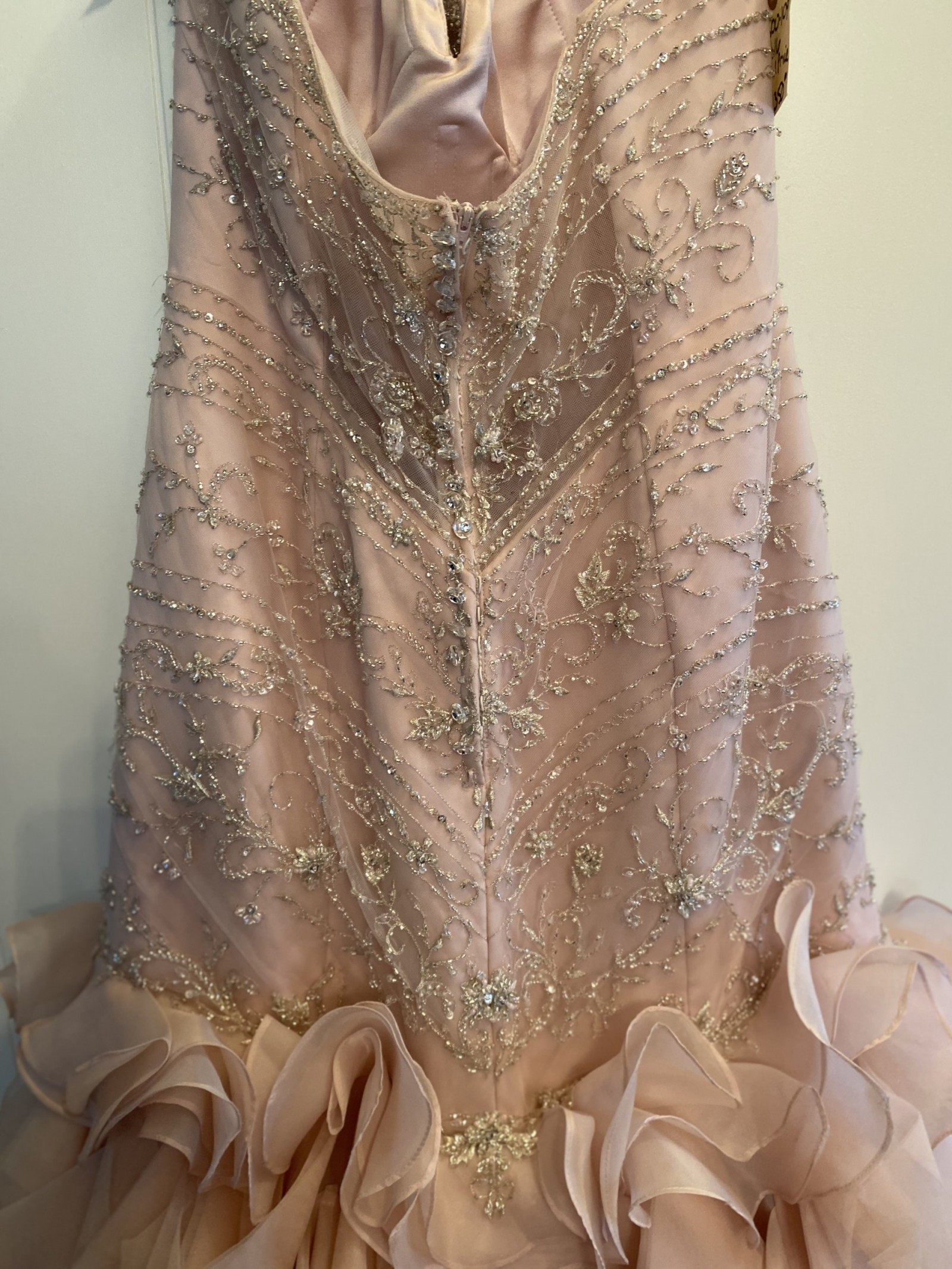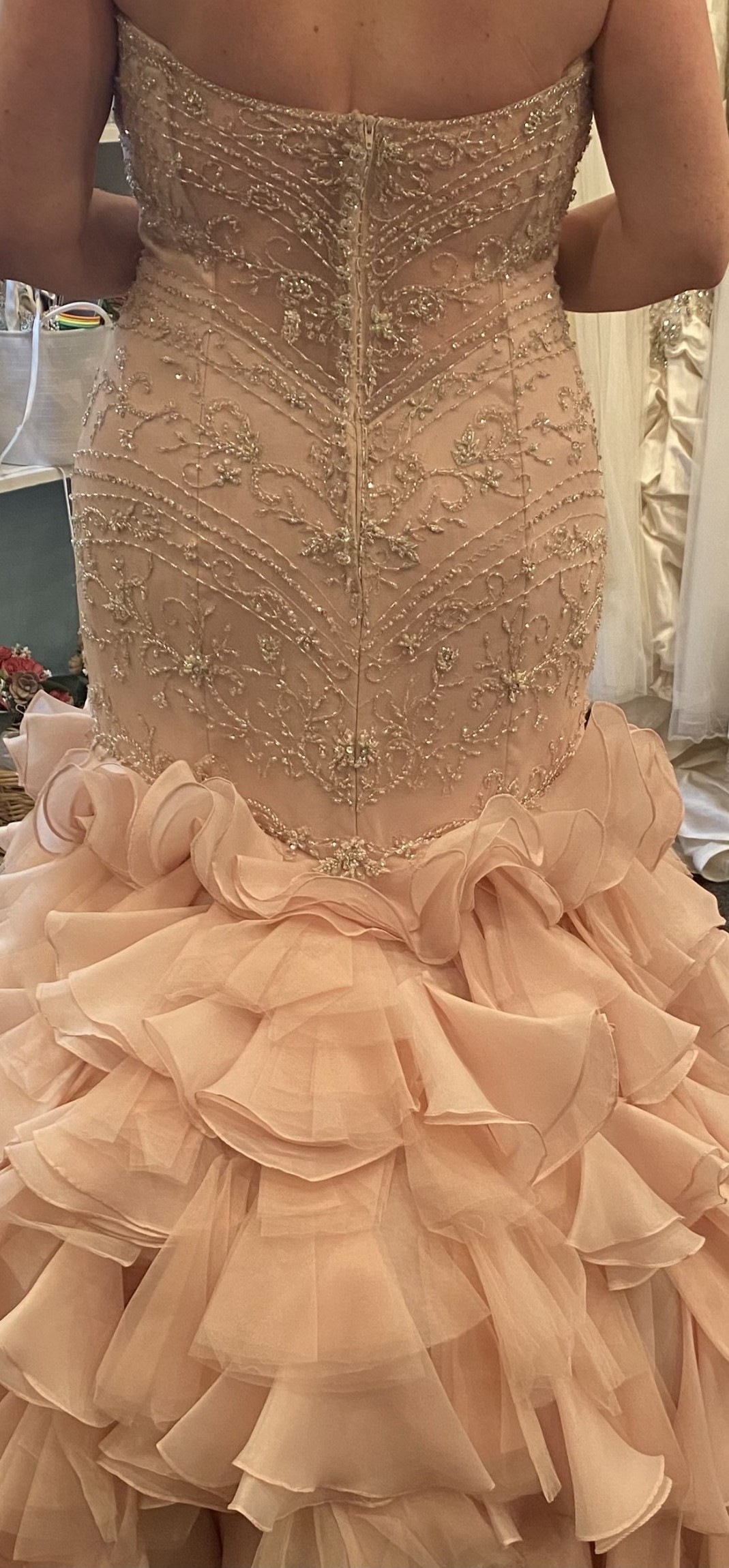 A unique blush pink gown with beautiful beading on the bodice and a wavy ruffled bottom flowing out to a long train of ruffles. A beautiful fit when it's bustled, too. This has never been worn except for fittings. Would be different, fun and gorgeous for a wedding, prom or any other gown event! Slight blemishes listed below that would be easy for a seamstress to mend.