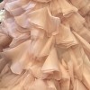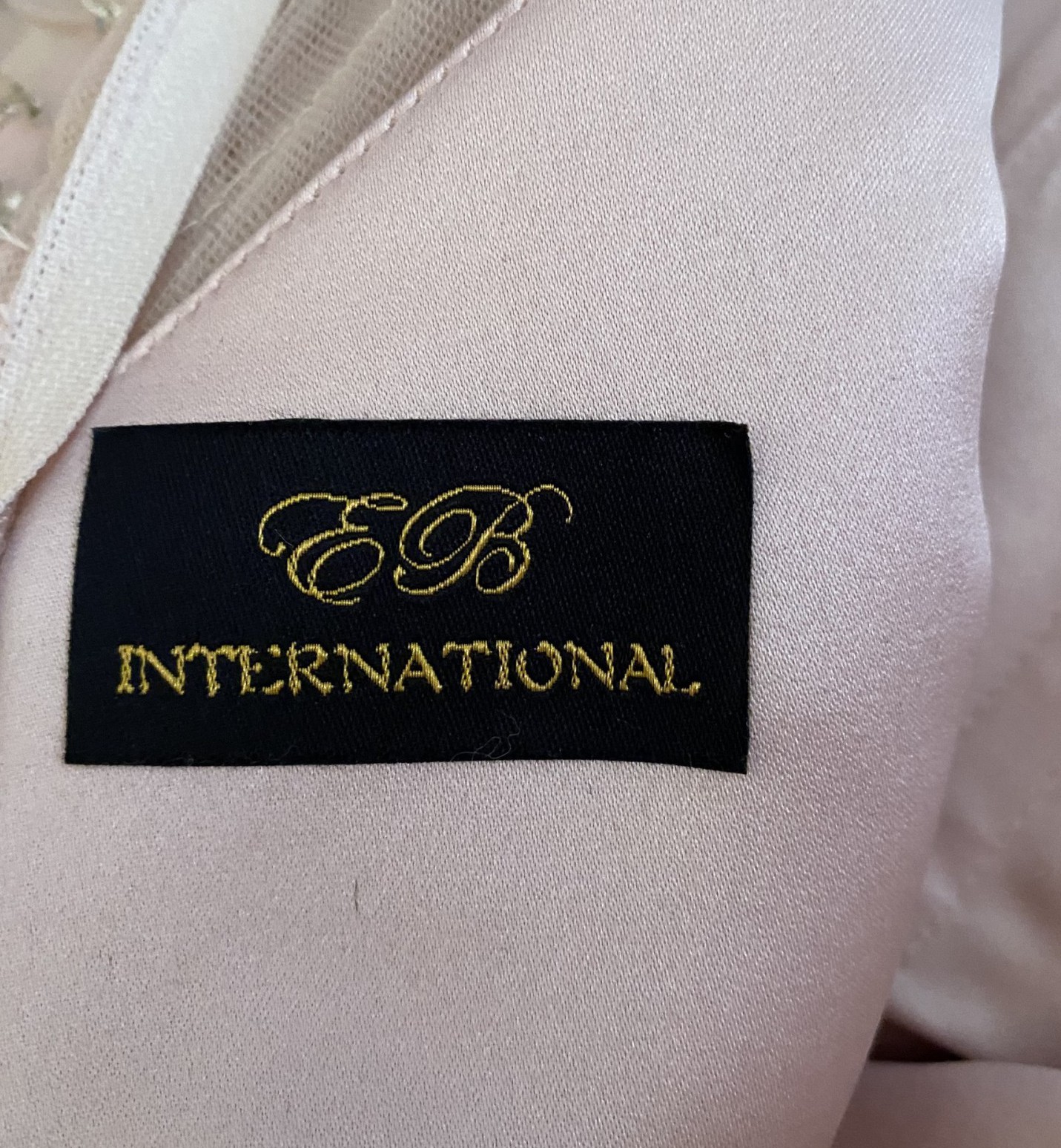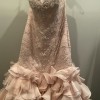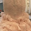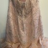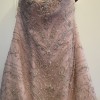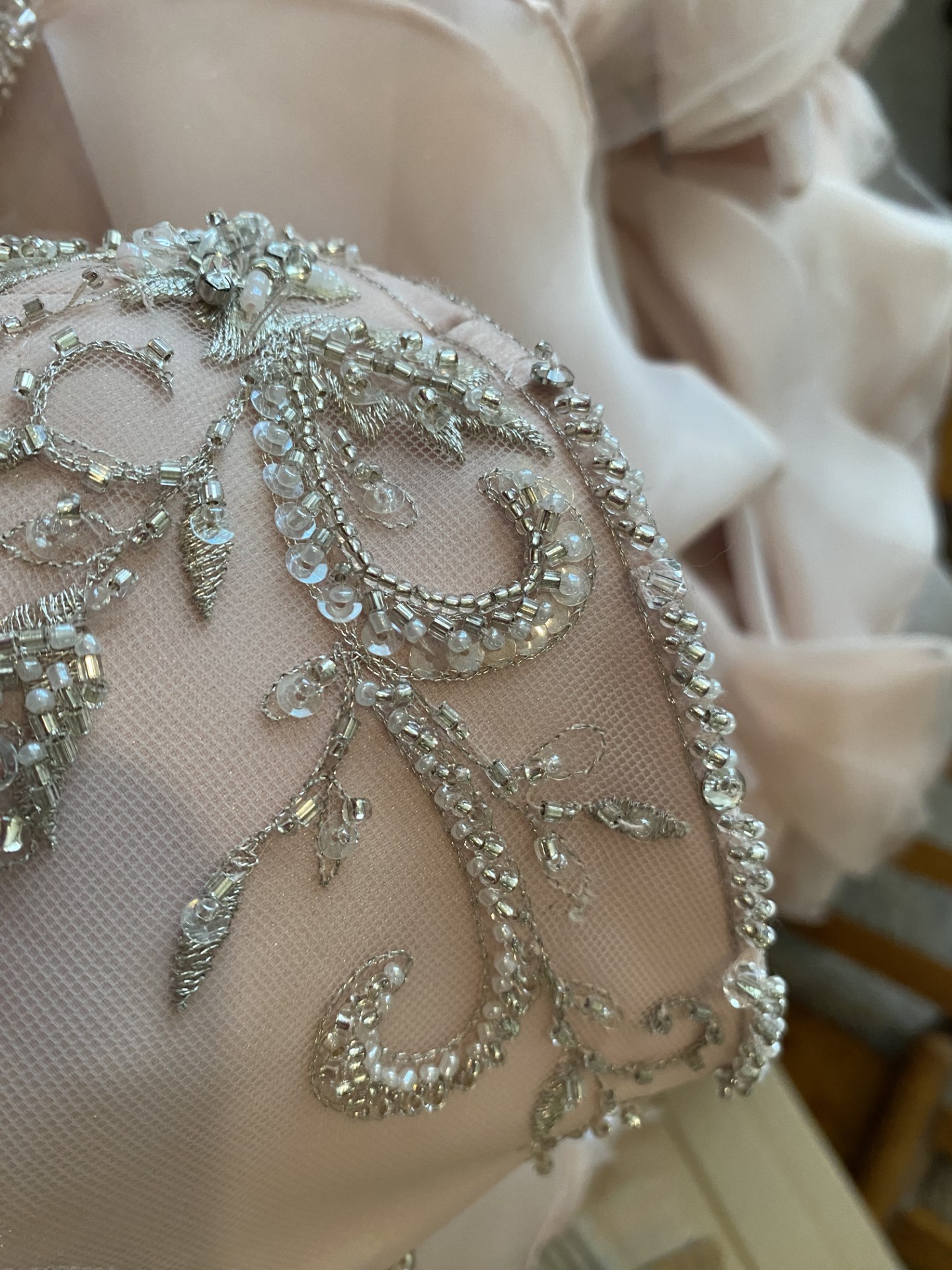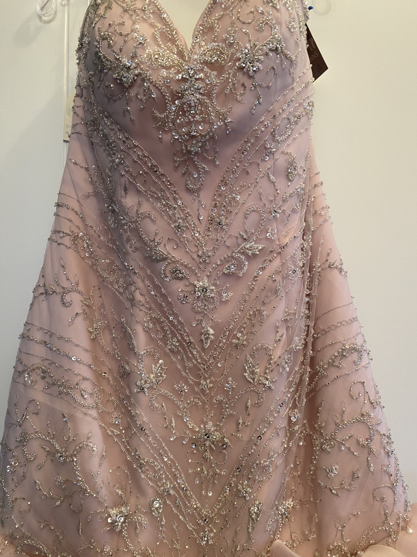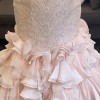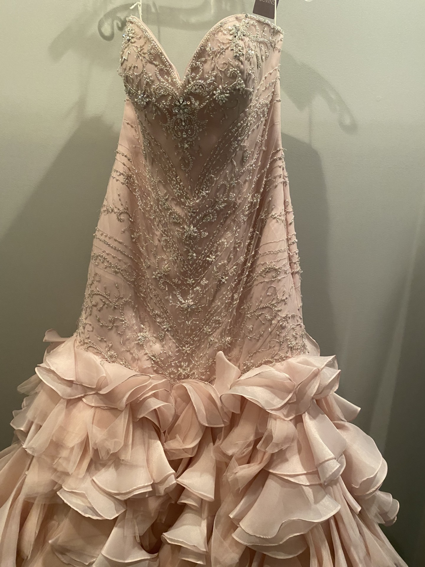 A unique blush pink gown with beautiful beading on the bodice and a wavy ruffled bottom flowing out to a long train of ruffles. A beautiful fit when it's bustled, too. This has never been worn except for fittings. Would be different, fun and gorgeous for a wedding, prom or any other gown event! Slight blemishes listed below that would be easy for a seamstress to mend.