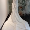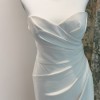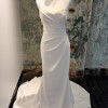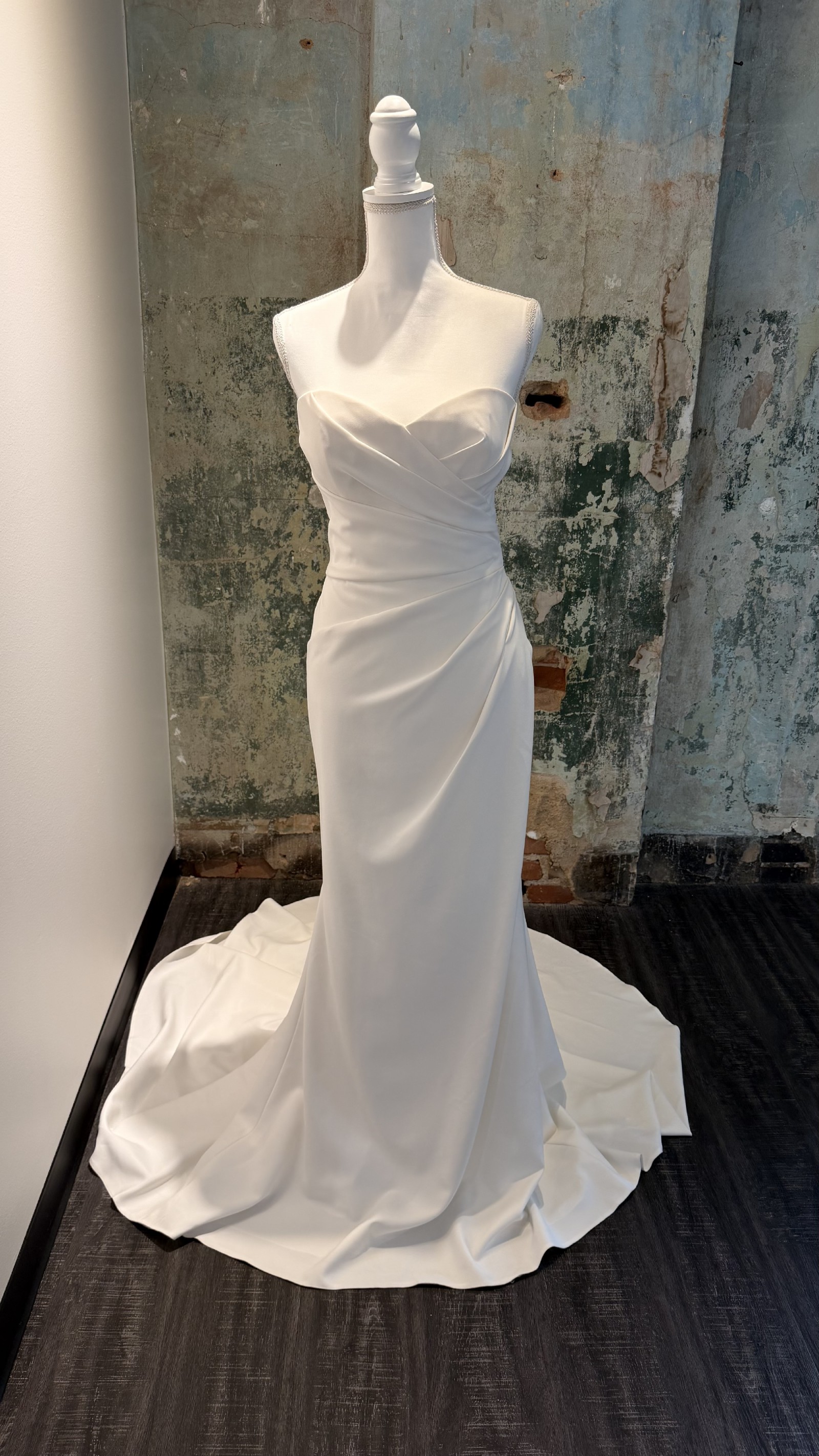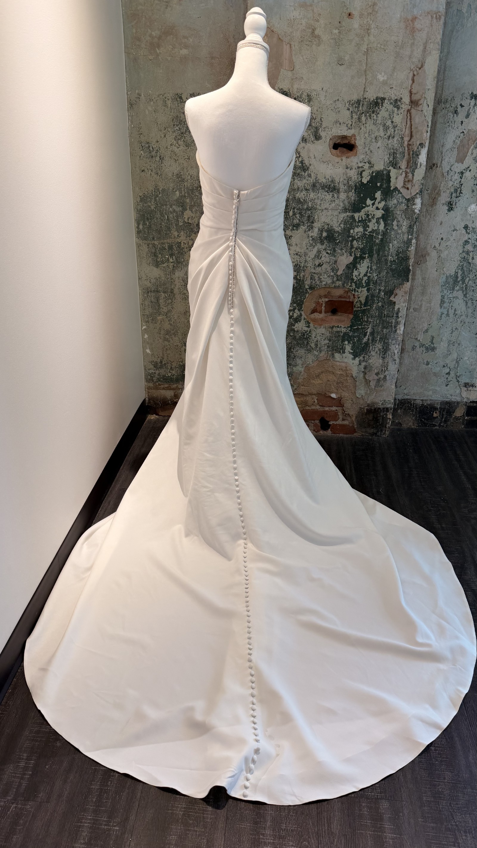This is an elegant, classic gown crafted from Crepe fabric for a refined look. The bodice features a strapless sweetheart neckline and is expertly ruched and draped to provide a flattering, structured fit. The skirt falls cleanly from the hips into a defined train. A detail of buttons extends down the back of the dress to the hem, adding a traditional element to this modern, clean silhouette. Off the shoulder straps seen in cover photo not sold with dress.