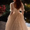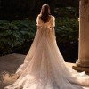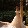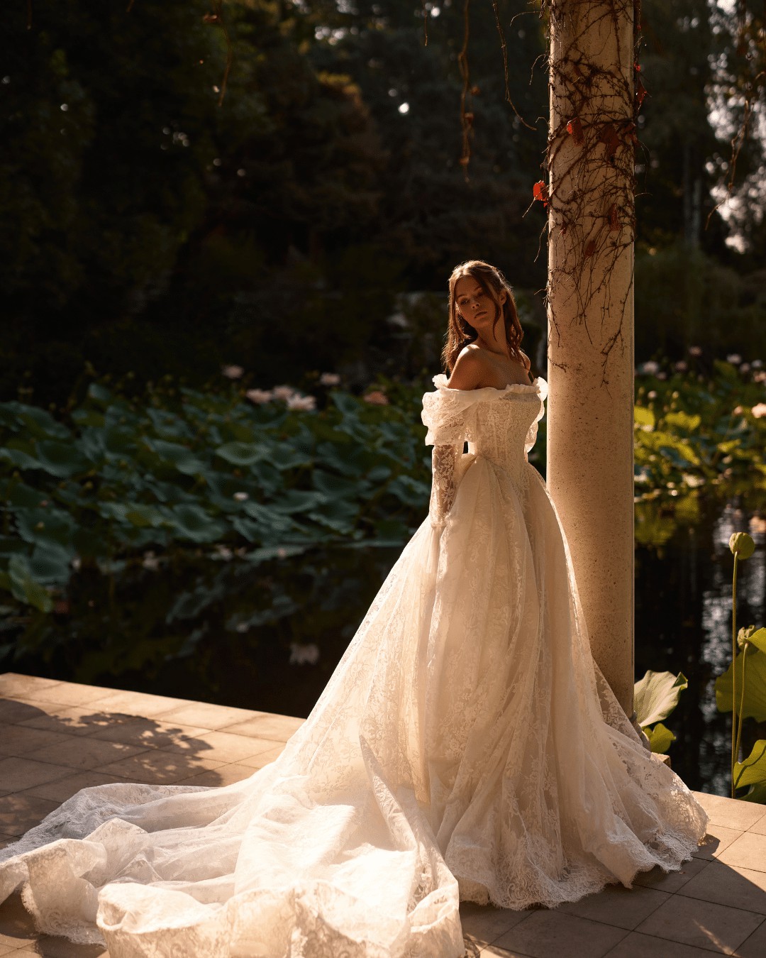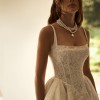Dreamy A-line wedding gown cut in a regal princess silhouette from delicate chantilly lace. Featuring a straight neckline held by spaghetti adjustable straps, a structured, sheer drop-waist bodice with built-in cups and visible boning that lengthens the silhouette, a hidden zip closure, and the voluminous lace skirt that flares out from the corset, gracefully flowing into a stunning train. Can be paried with a vintage-inspired chantilly lace Melrose underdress with long puffy sleeves that add a romantic feel to the ensemble.