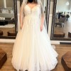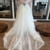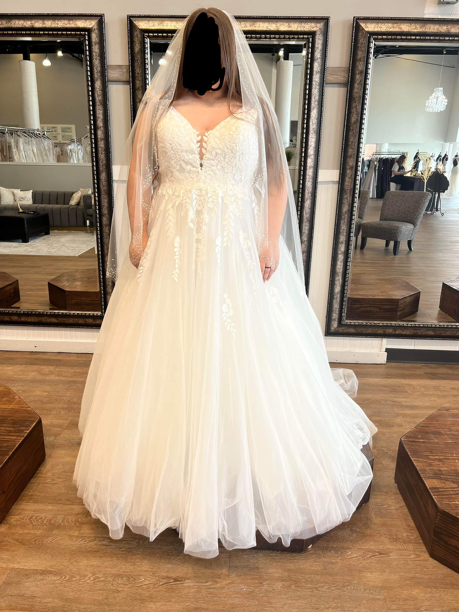 This is the lined-bodice version (3451L) featuring a romantic plunge V-neckline, floral lace appliqués, and a soft English-net skirt with a flowing train. Lightweight, flattering, and timeless.