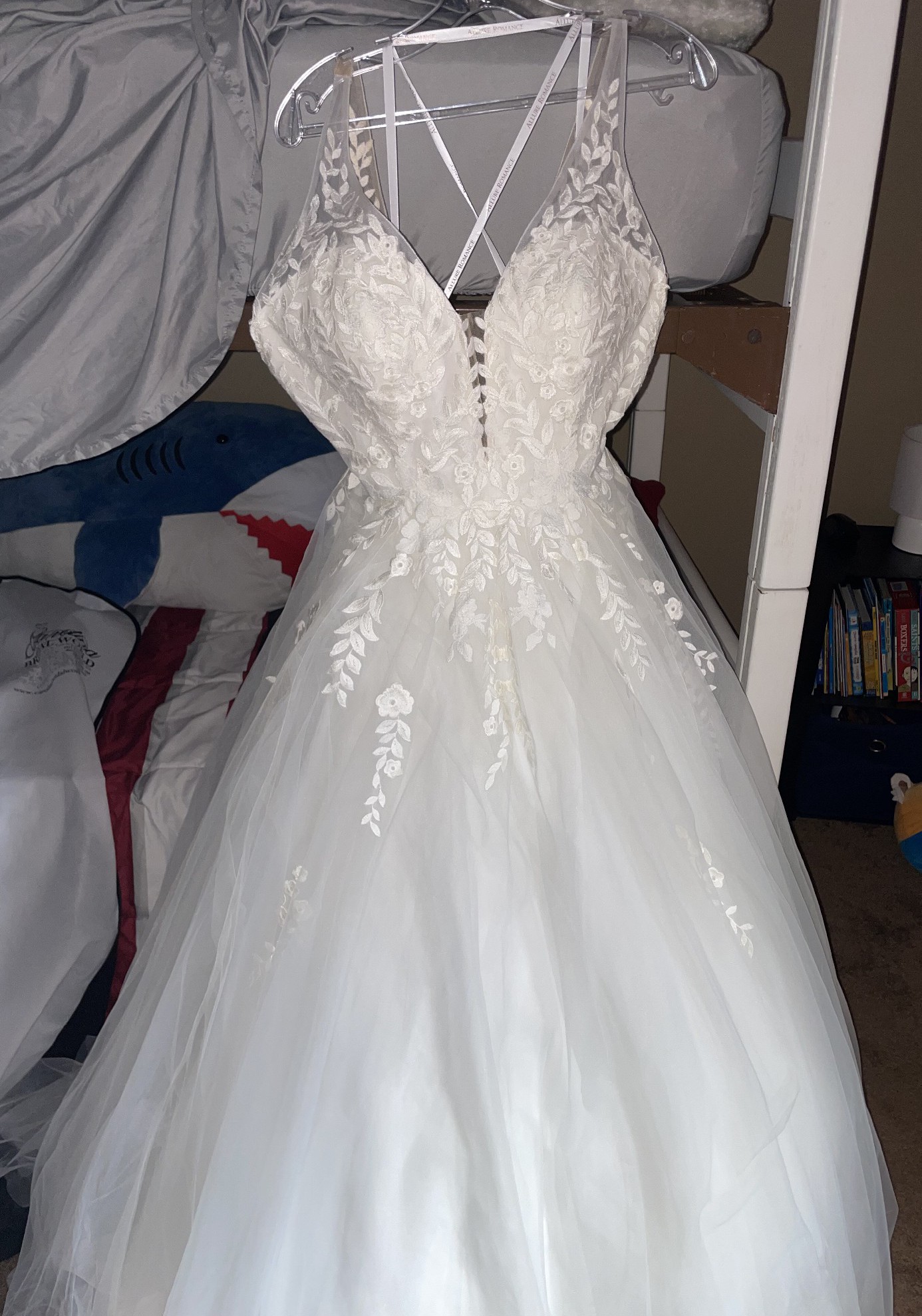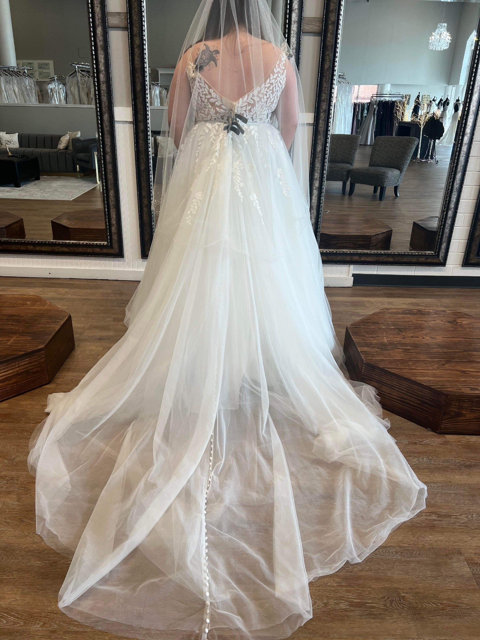 Also includes a Bel Aire Bridal V7600 pearl-scattered veil ($225 retail) that perfectly matches the ivory tones of the dress.