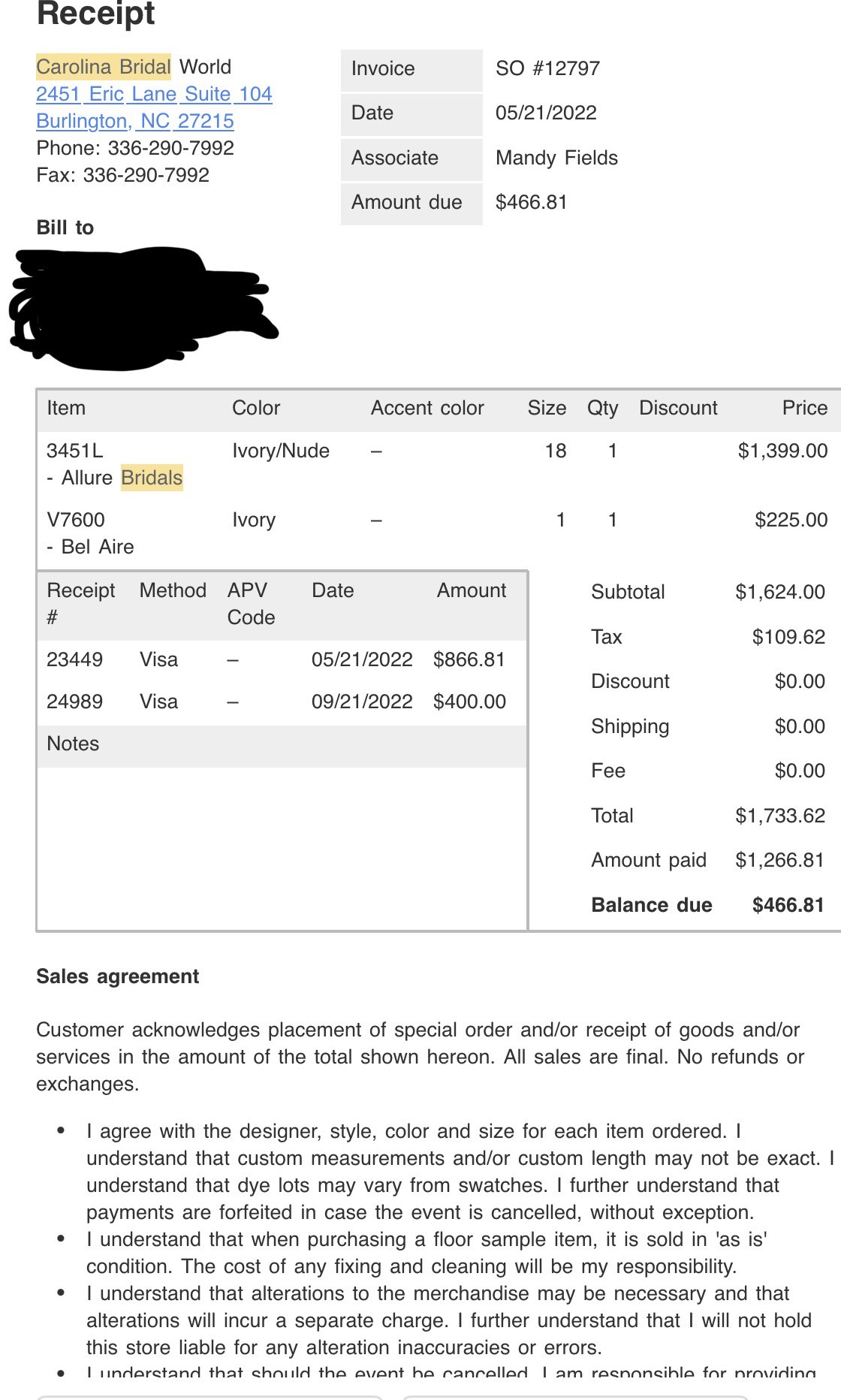 Purchased from Carolina Bridal World (Burlington, NC) for $1,399 + tax.