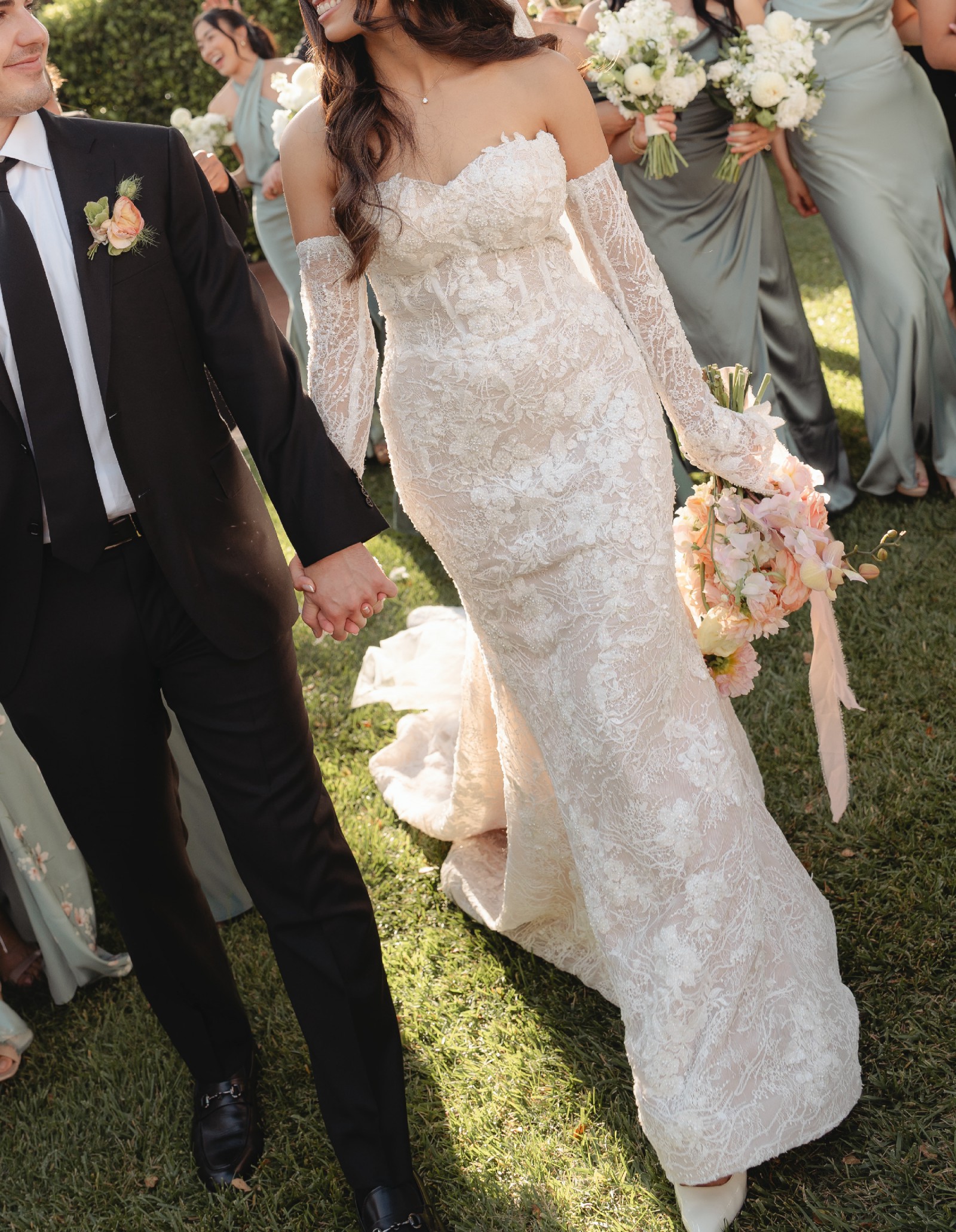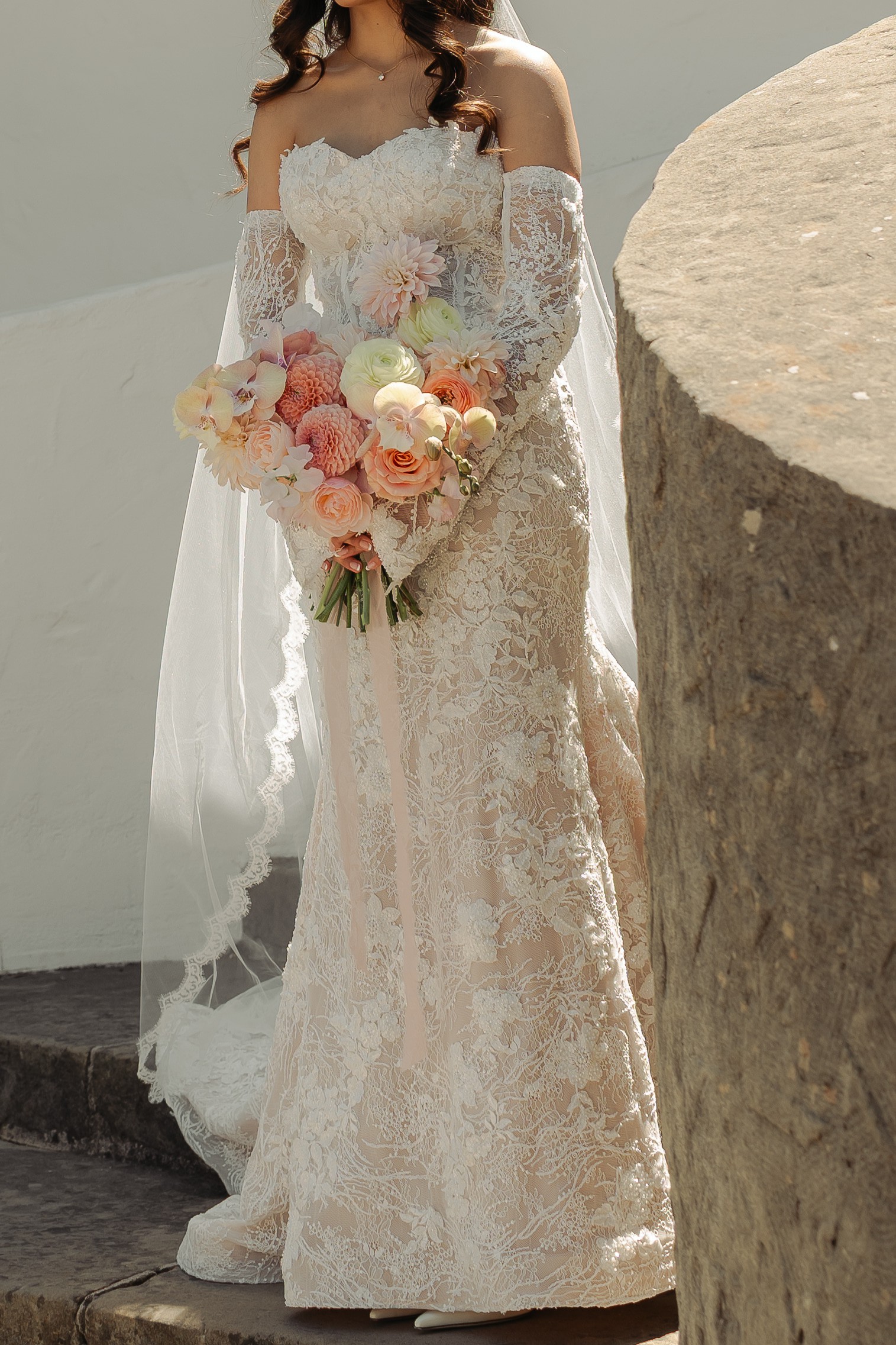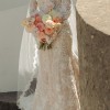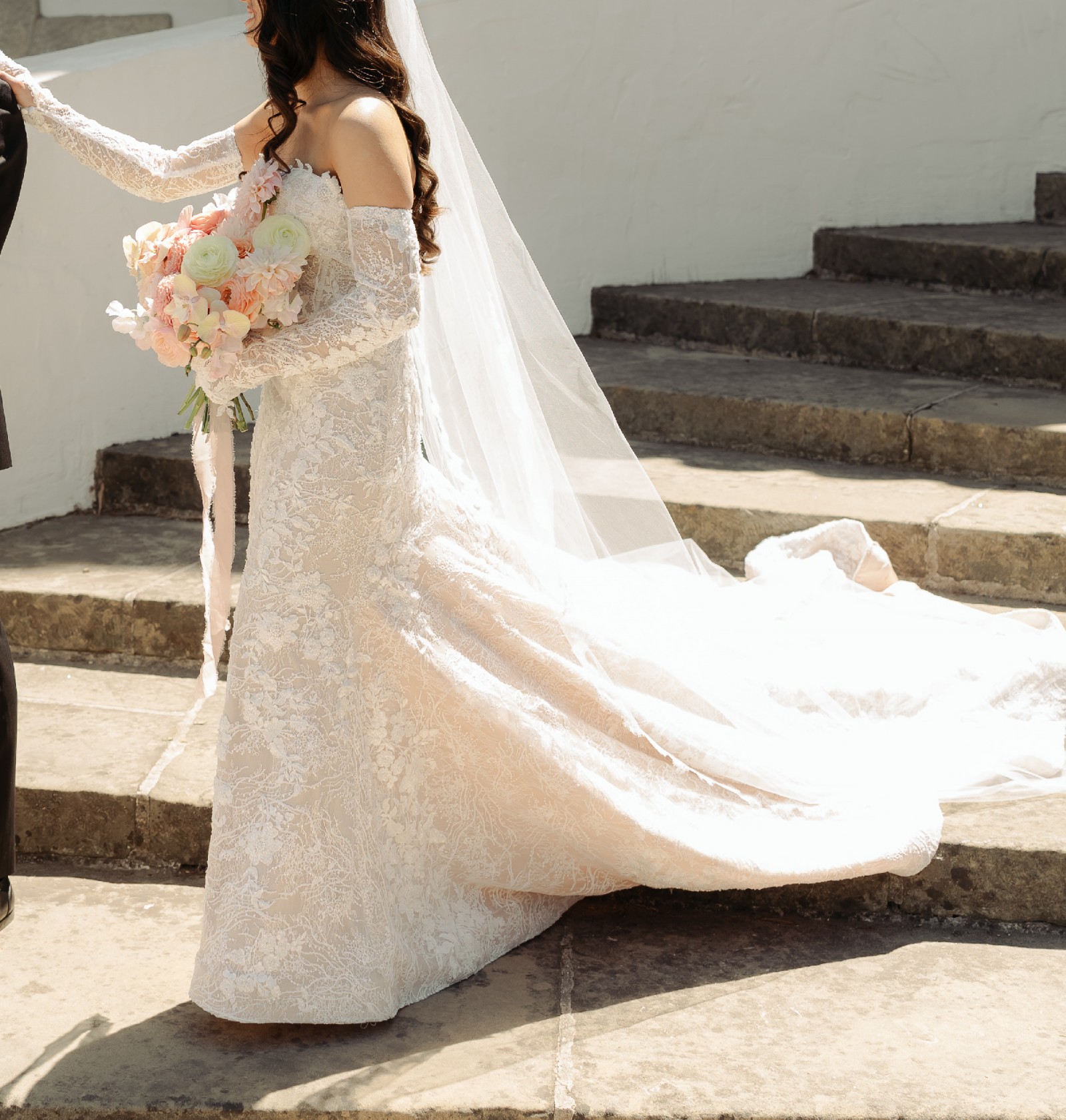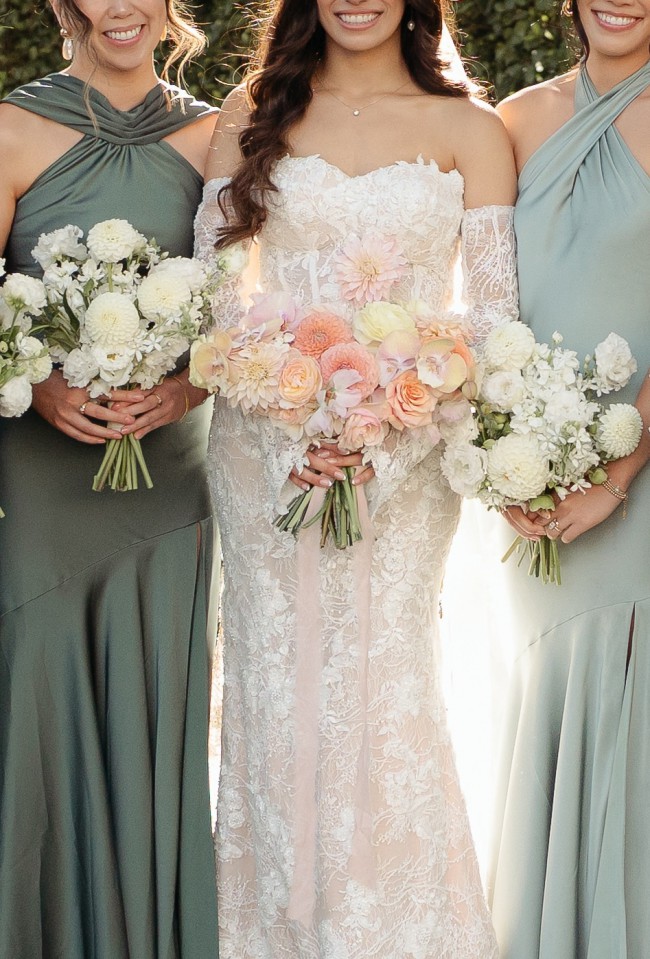 Oksana Mukha Rita Dress in blush. The dress has detachable sleeves. I lost weight before the wedding and the cups needed to be taken in. As you can see, they are still a bit too large for my B cups. I believe a C-D cup girl would do well in this dress. I am 5'6 and typically a size 4, or size small. Dress is comfortable. Veil included in purchase.