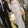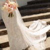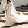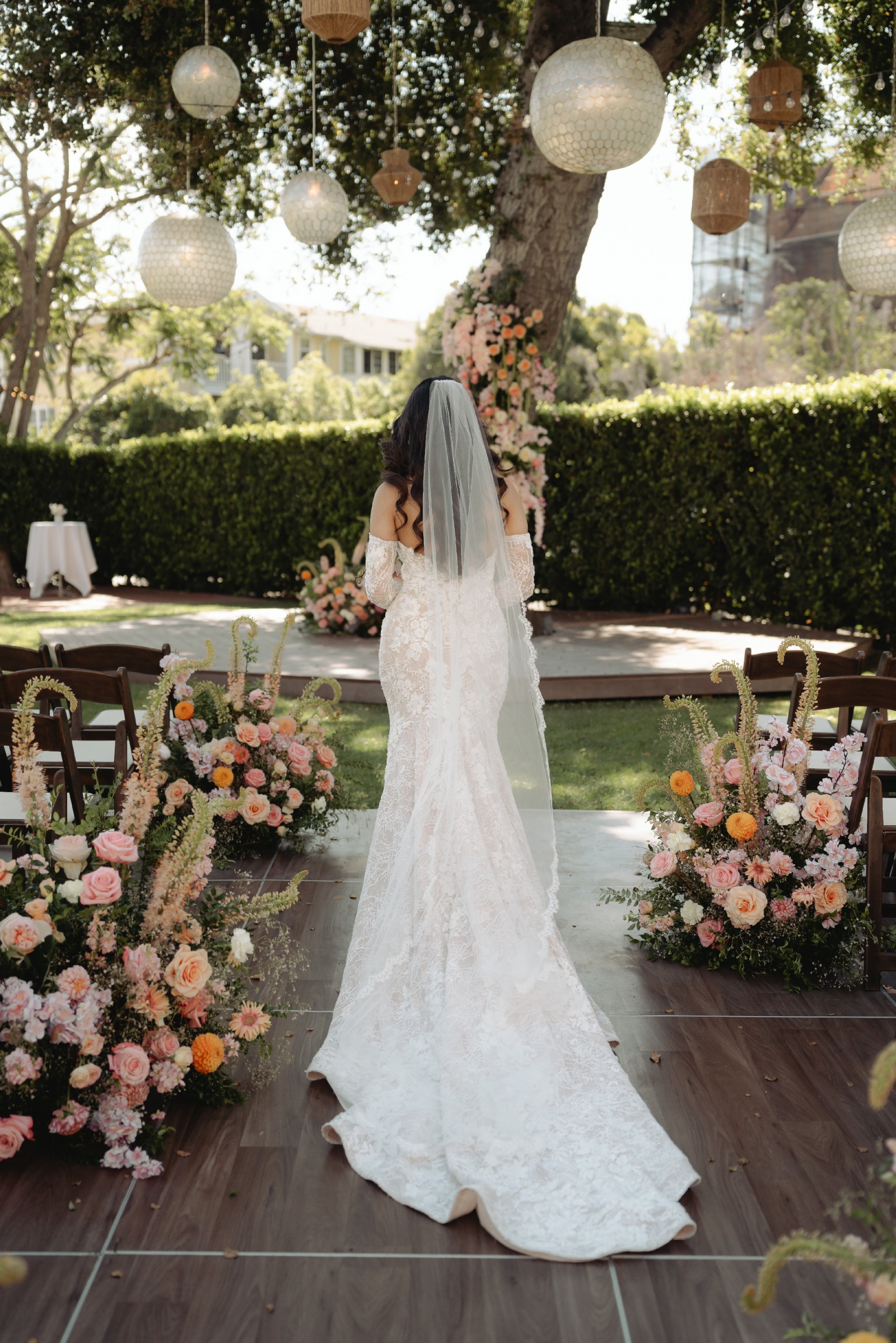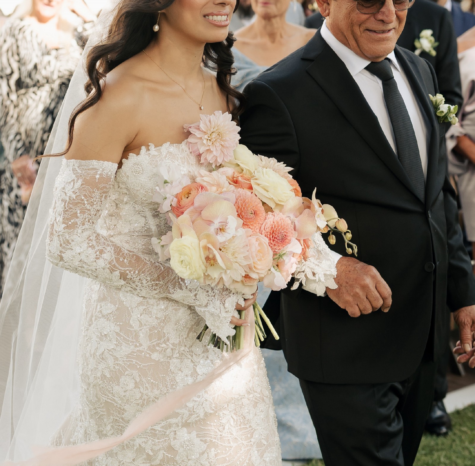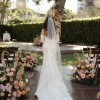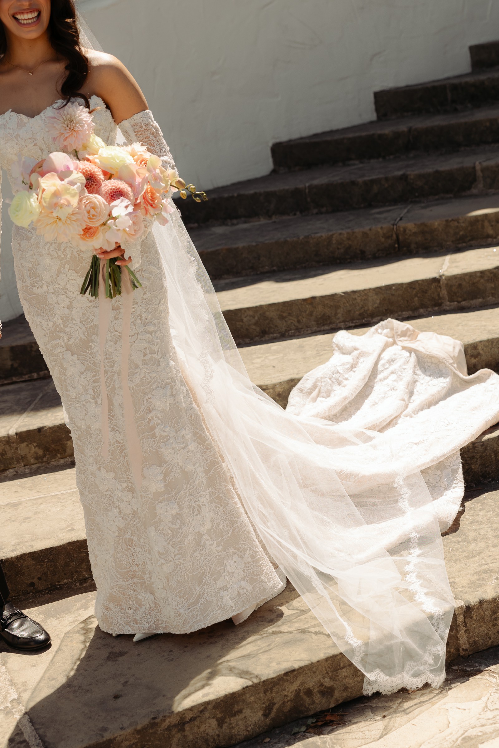 Oksana Mukha Rita Dress in blush. The dress has detachable sleeves. I lost weight before the wedding and the cups needed to be taken in. As you can see, they are still a bit too large for my B cups. I believe a C-D cup girl would do well in this dress. I am 5'6 and typically a size 4, or size small. Dress is comfortable. Veil included in purchase.