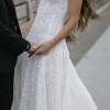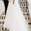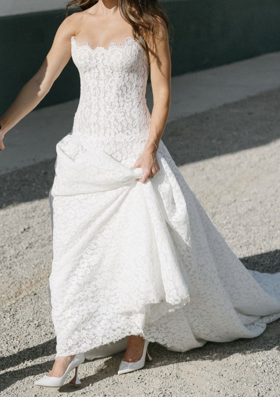 The Harmony Lee Petra Grebenau is a 2024 strapless ball gown from the "Sunrise" collection, made of French lace with a structured, drop-waist corset bodice and a grand skirt. It features a scoop neck and back, delicate lace details along the neckline, and a long, flowing train, creating a romantic and dramatic silhouette.