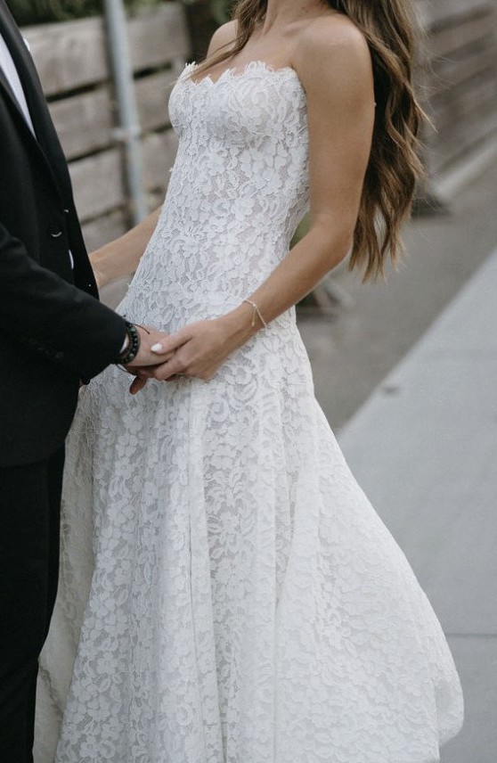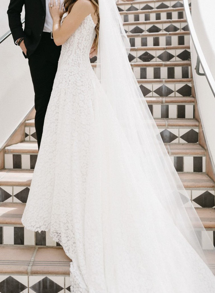 Bought at NWLA bridal in LA. Strapless ball gown, made from elegant French lace. Featuring a dropped waist corset and a long train.