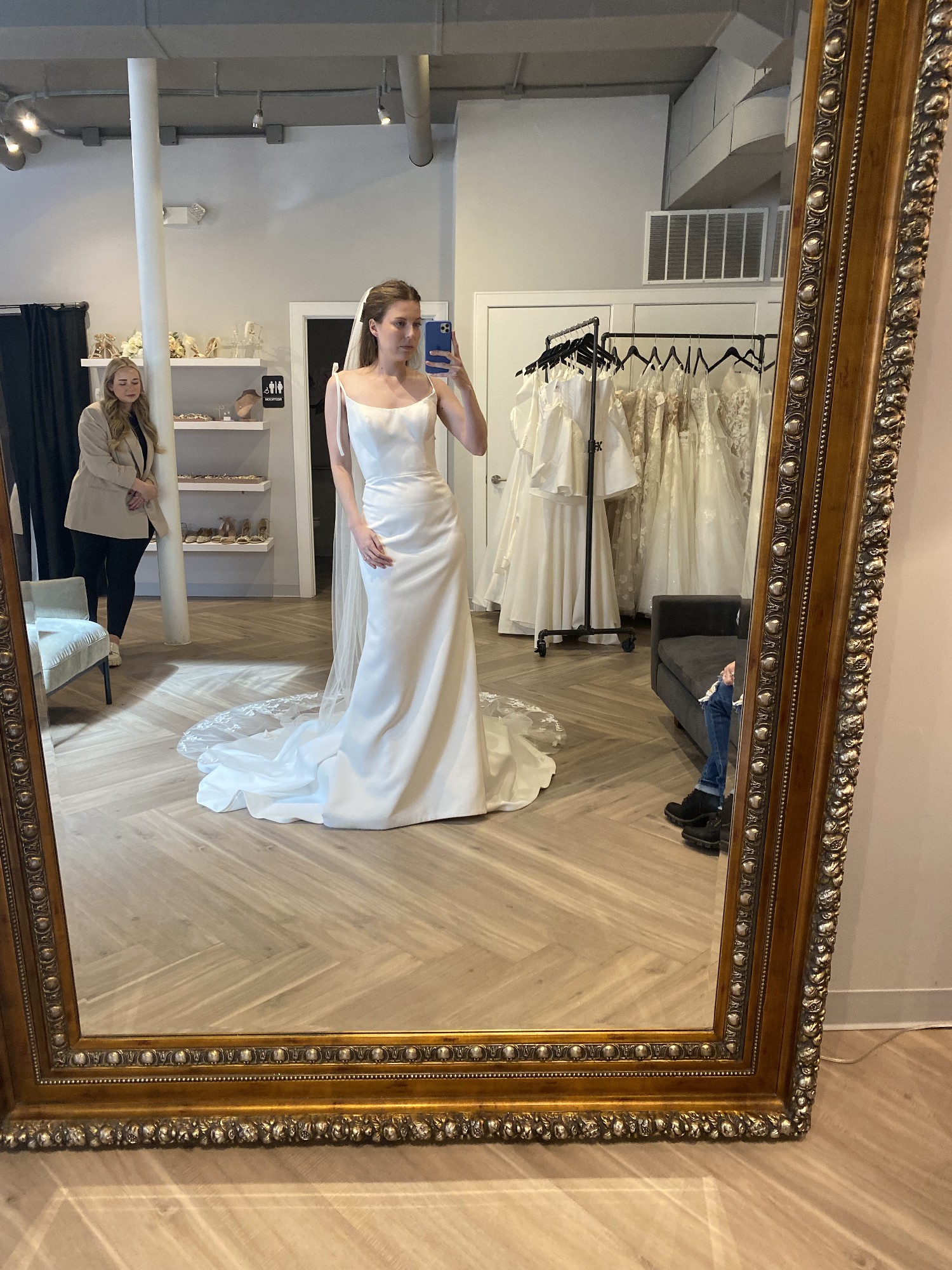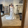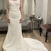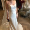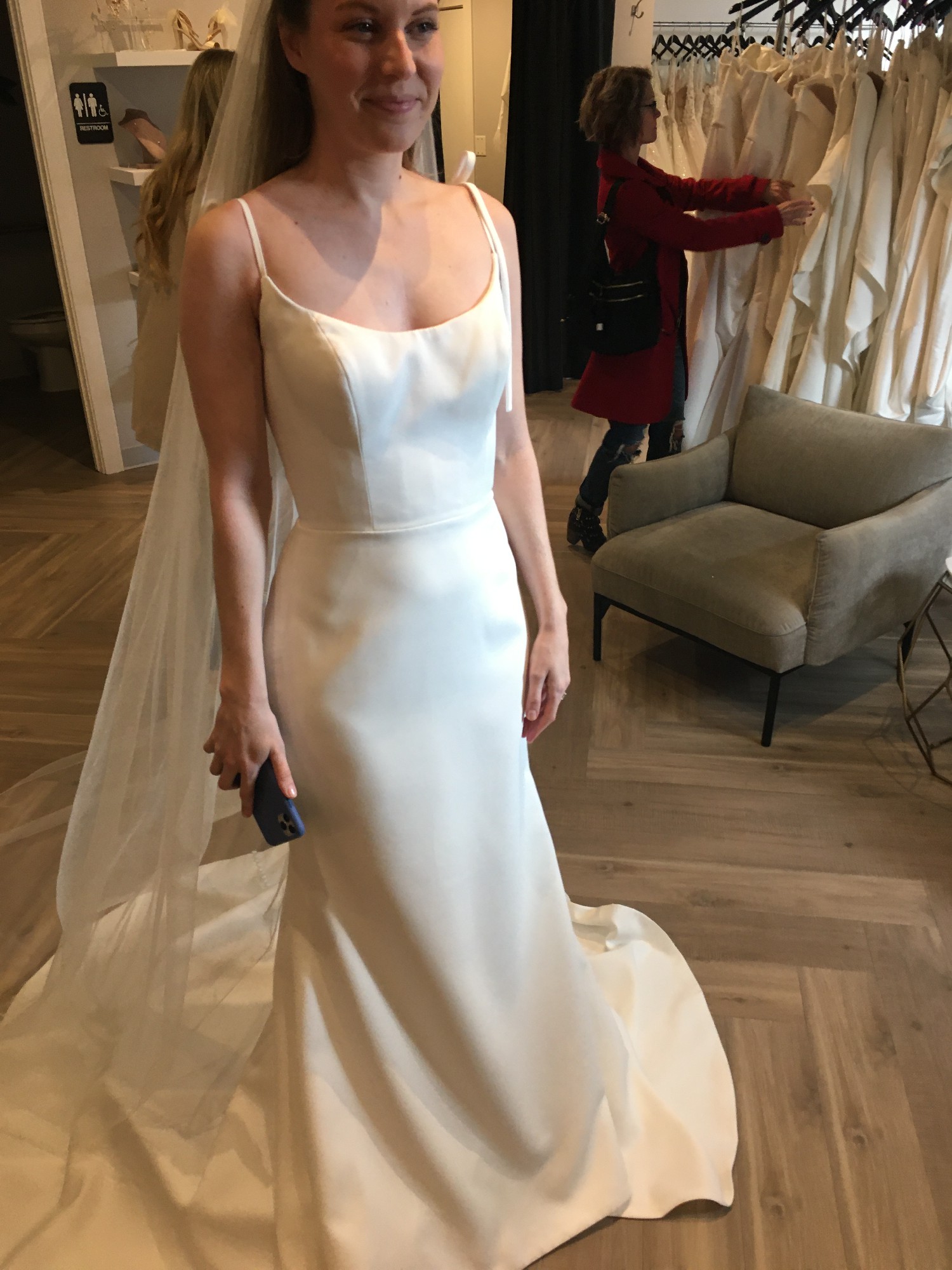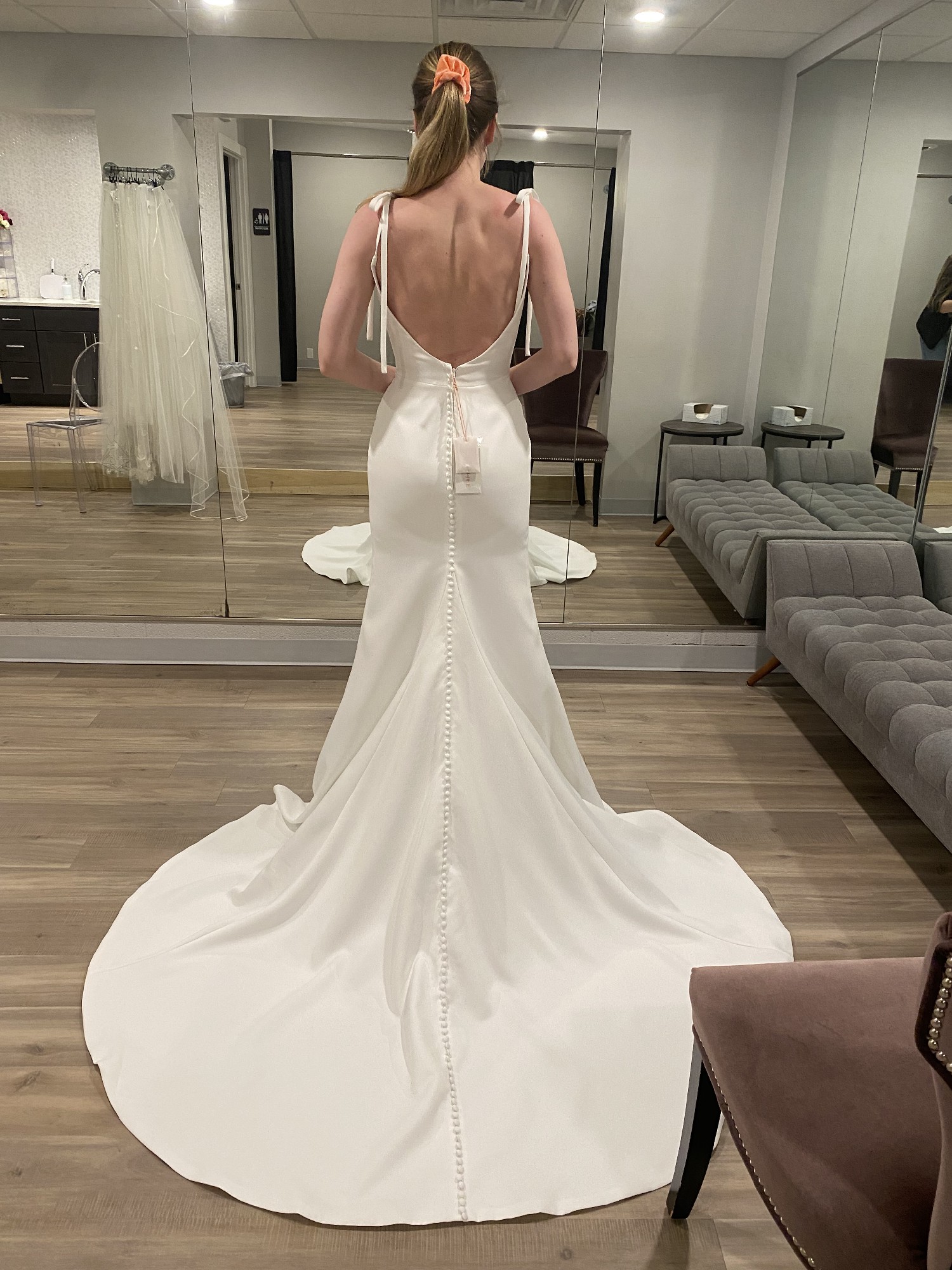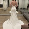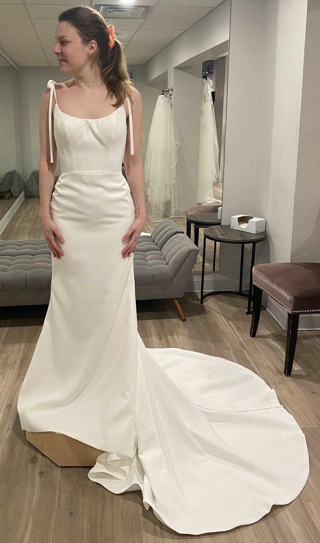 Simple and clean, this dress features an on-trend scoop neckline and a v-back. The structural features are simple but invite much femininity with delicate bows on each shoulder. This dress is versatile for any wedding style with its subtle romance and sexy fit.