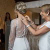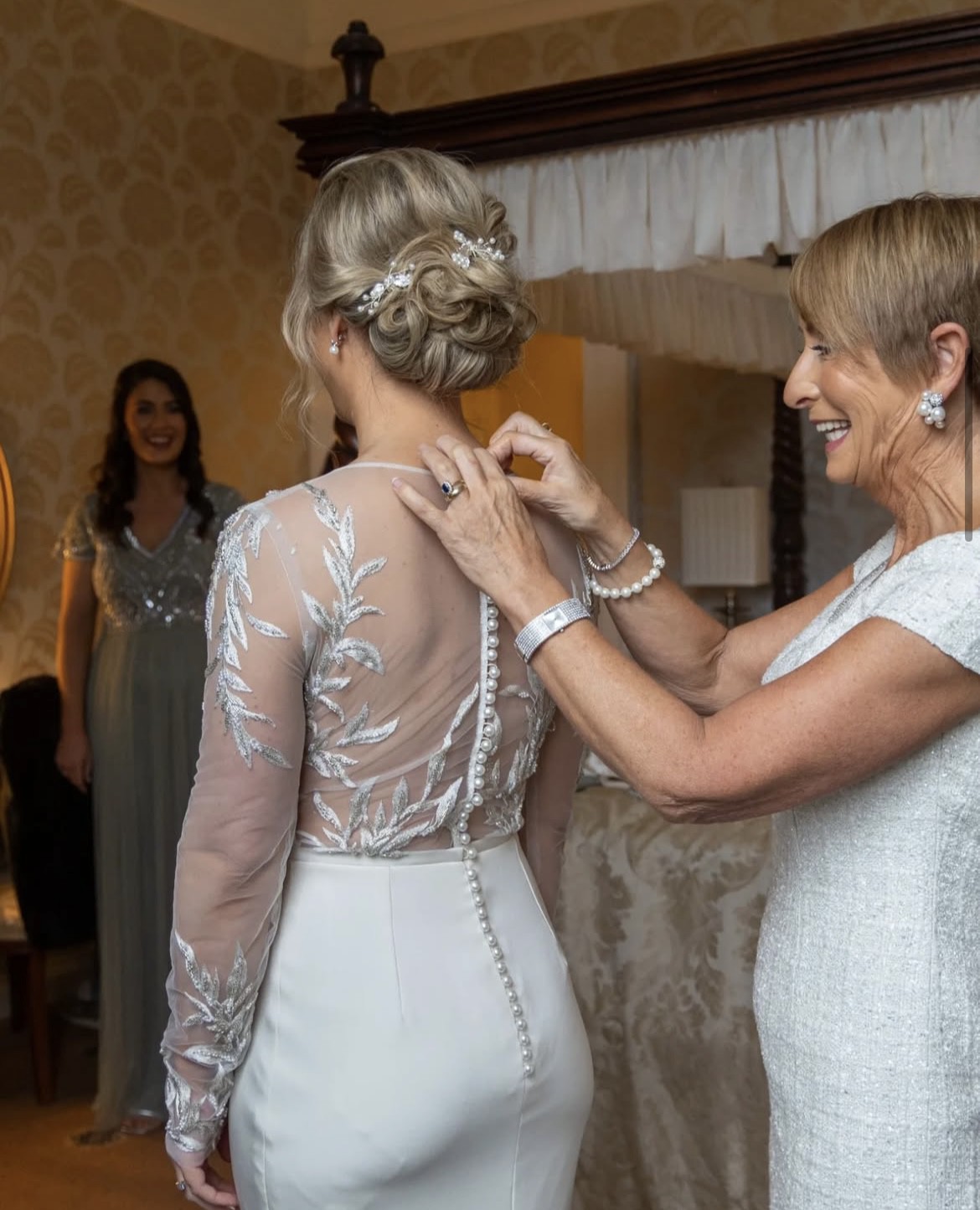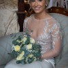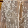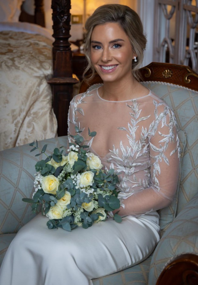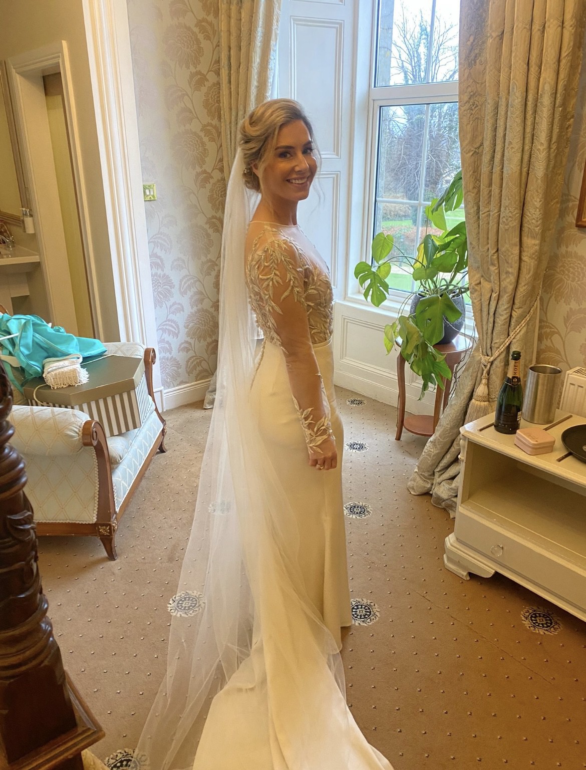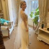 This exquisite wedding dress is in perfect condition, with no stains or marks. The gown features a stunning bodice by Elbeth Gillis, adorned with delicate leaf embroidery on the sheer long-sleeved top, giving it an elegant and ethereal feel. The bodice is finished with a row of buttons running all the way down the back, adding a classic touch. It is paired seamlessly with a fitted crepe skirt by Anna Georgina, creating a flattering and sophisticated silhouette. This dress beautifully combines intricate detailing with modern elegance, perfect for a bride seeking timeless romance.