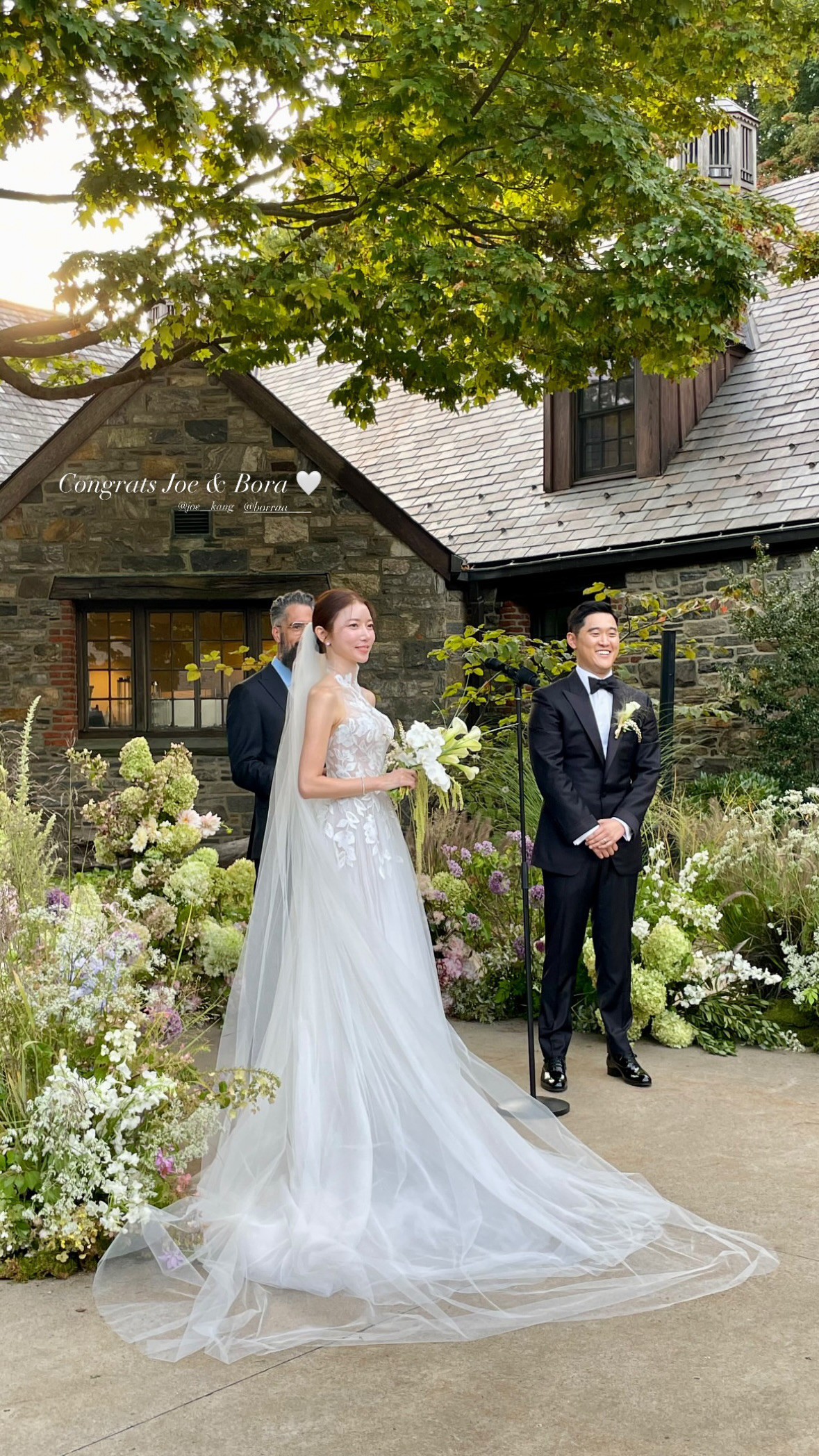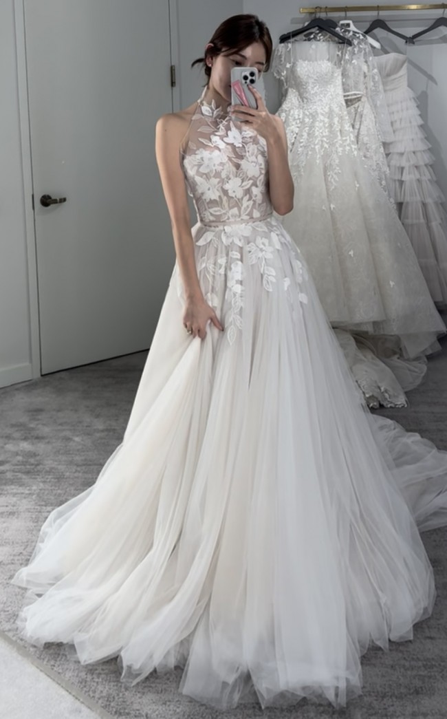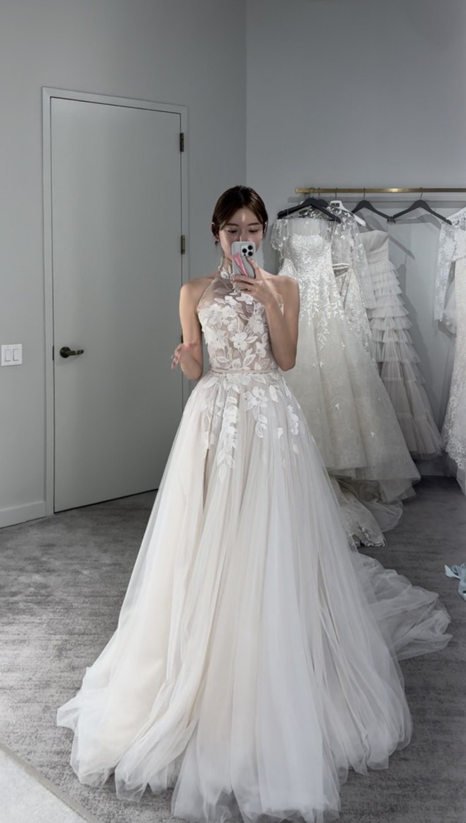 Crafted with meticulous attention to detail, the hand-placed floral appliqués are true works of art. Each piece is thoughtfully positioned, cascading down the bodice and skirt to create a seamless flow, adding texture and depth to the gown’s silhouette. The delicate blooms, intricately embroidered, give the gown a soft, ethereal quality that is balanced beautifully by the gown’s bold structure.