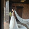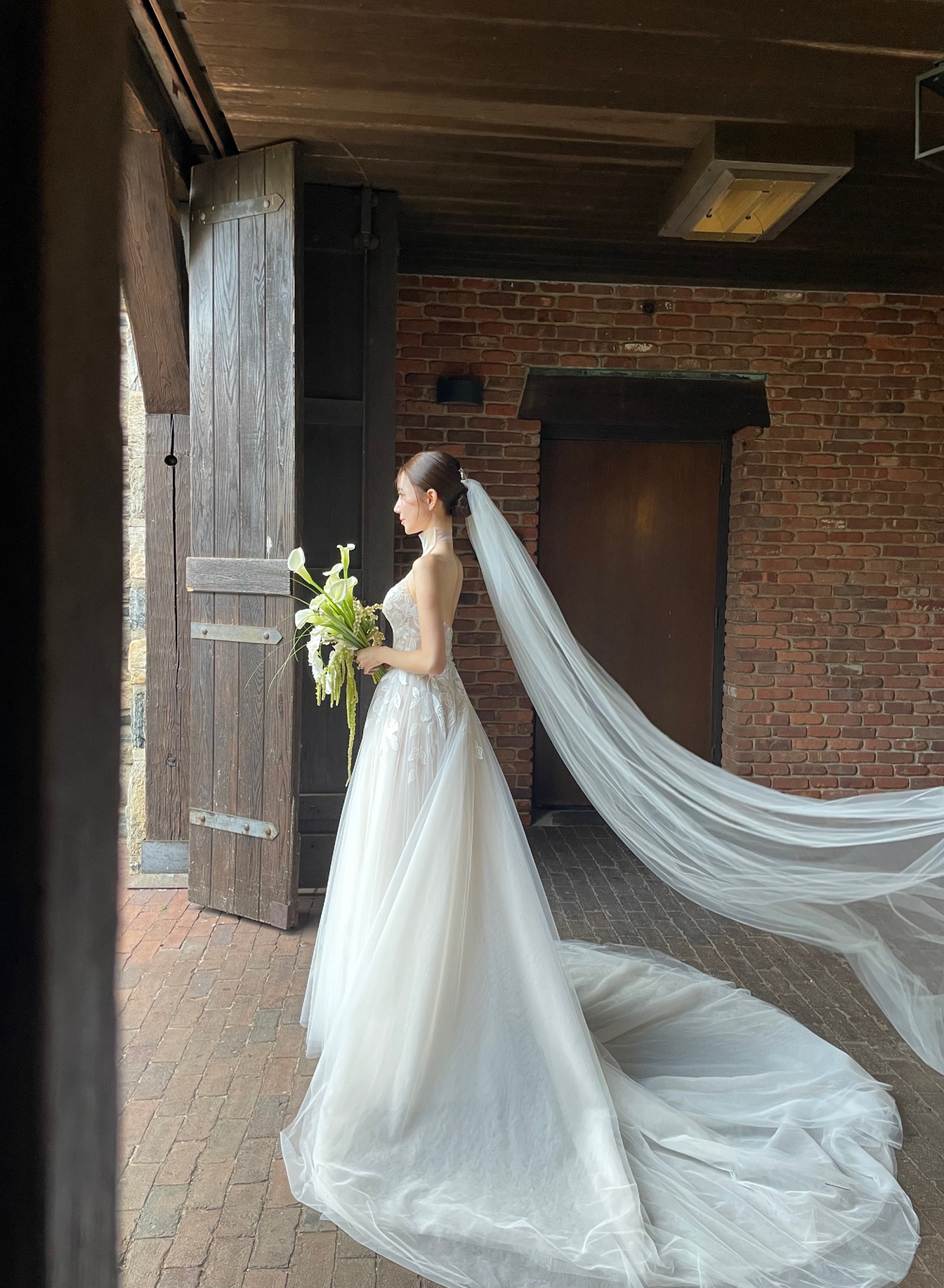 The deep V-notch bodice frames the bust elegantly, while the razor-low back adds a touch of sensuality and drama. The elegant side slit introduces a daring yet refined element, allowing for graceful movement as you walk down the aisle.