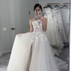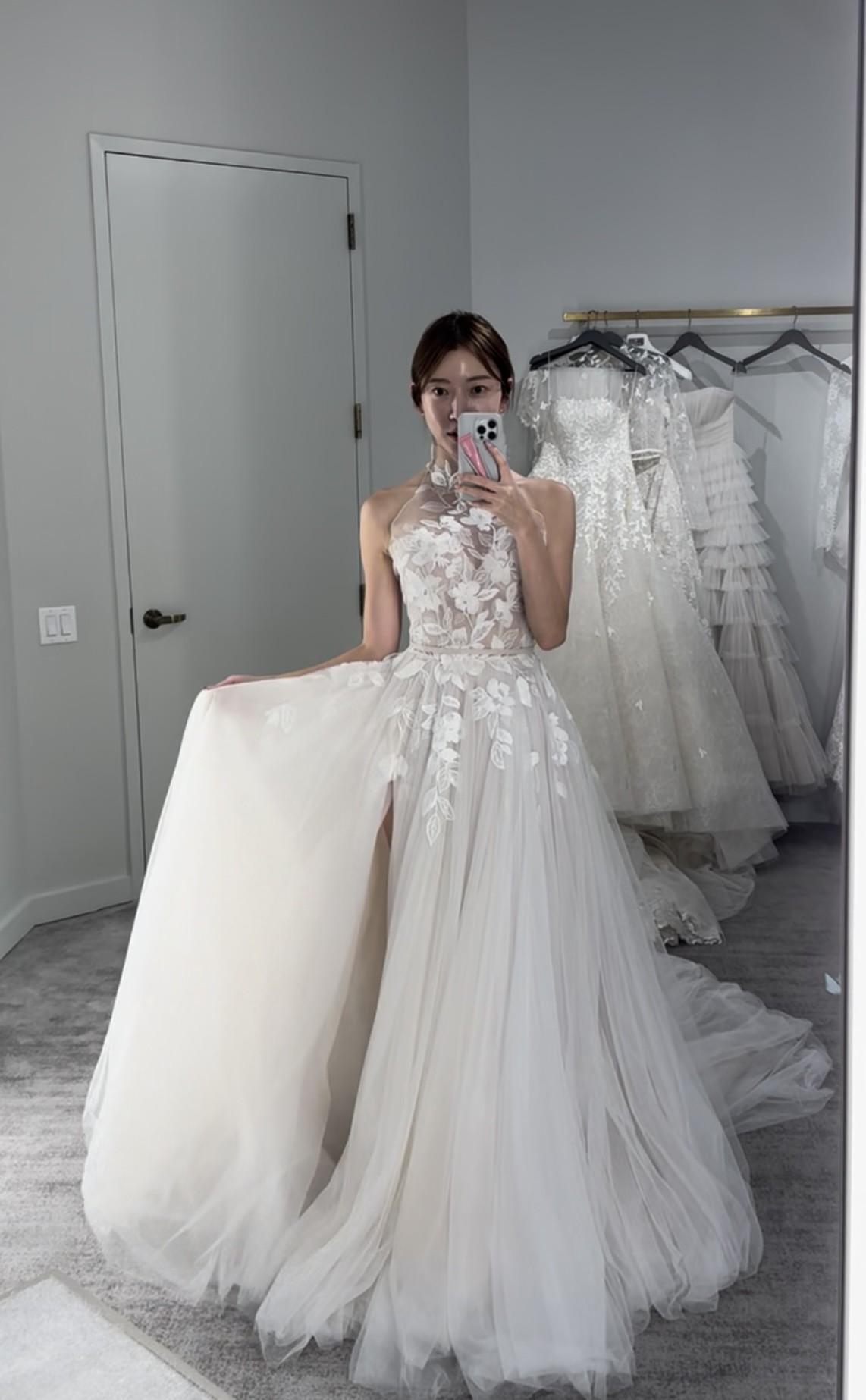 a stunning blend of bold sophistication and delicate beauty, Nelly captivates with intricate floral lace, a flowing tulle skirt, and daring details. Designed to celebrate confidence and grace, this gown exudes unforgettable charm for your most magical day!