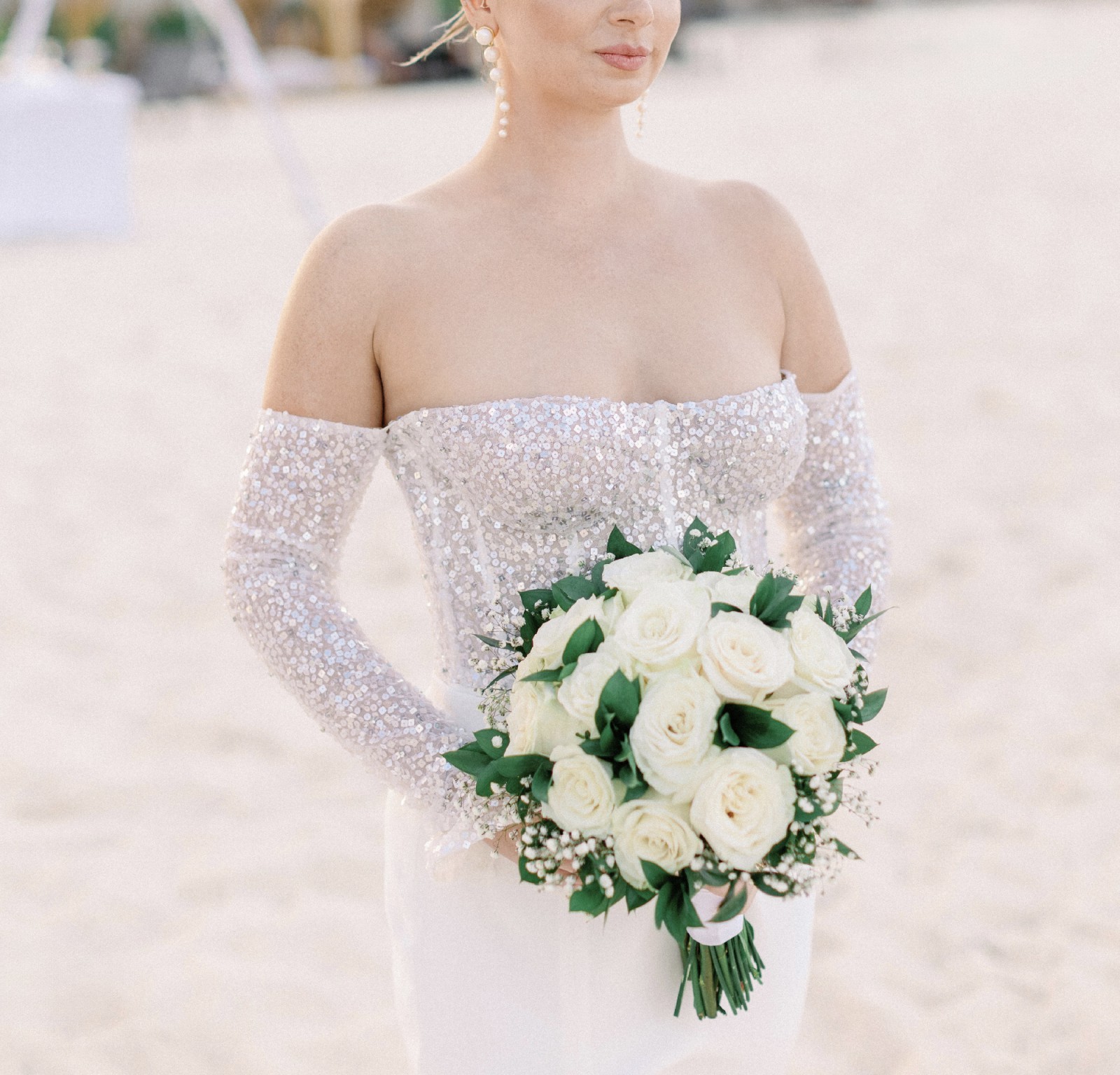 Fully beaded (all hand sewn on), bright ivory