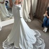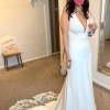 "Maine" by Maggie Sottero plunging illusion V-neck, and keyhole back. It features a crepe fabric with a Virtue stretch jersey lining for comfort, and is finished with a zipper and covered buttons trailing down the hem and an illusion lace train. Some versions of this dress are discontinued but may still be found as samples or used dresses.